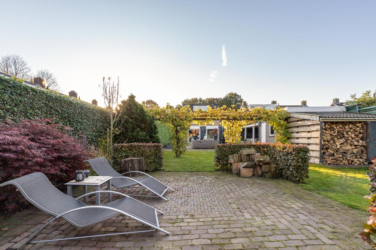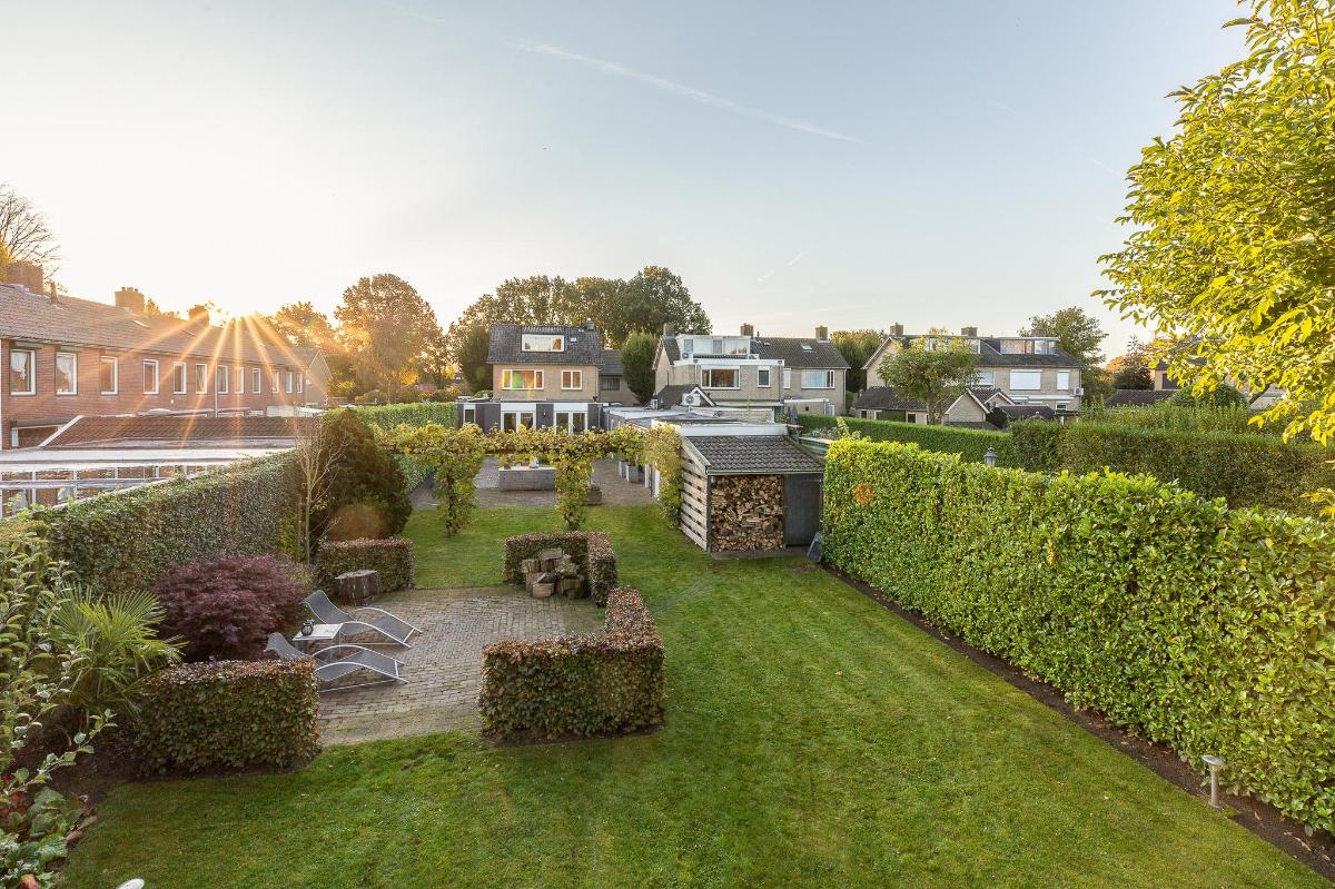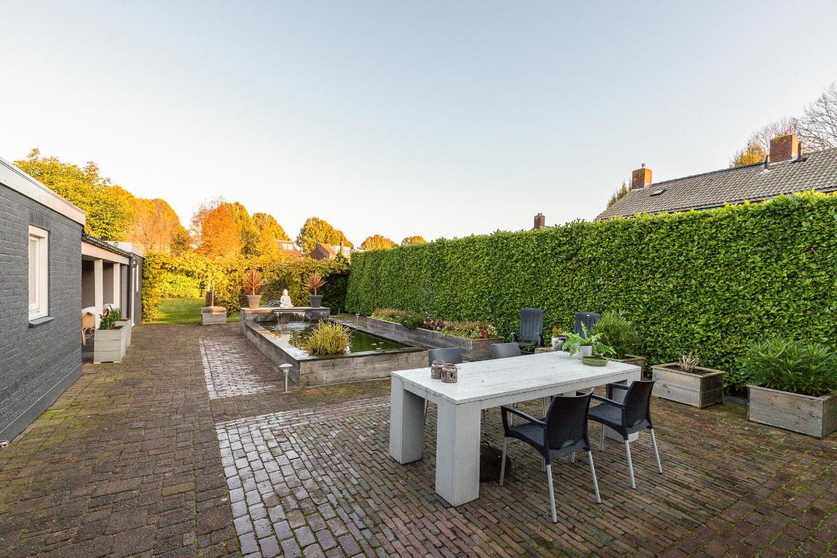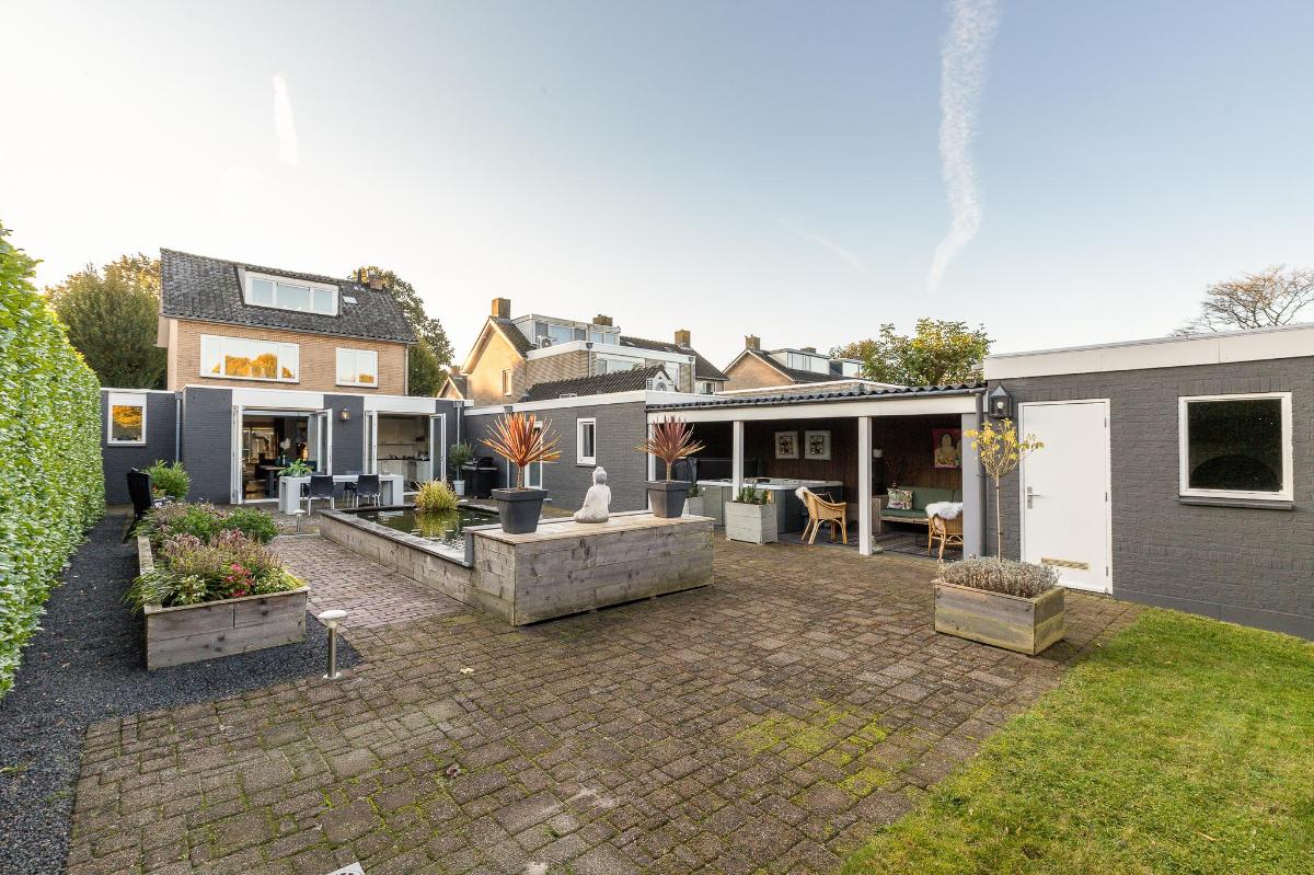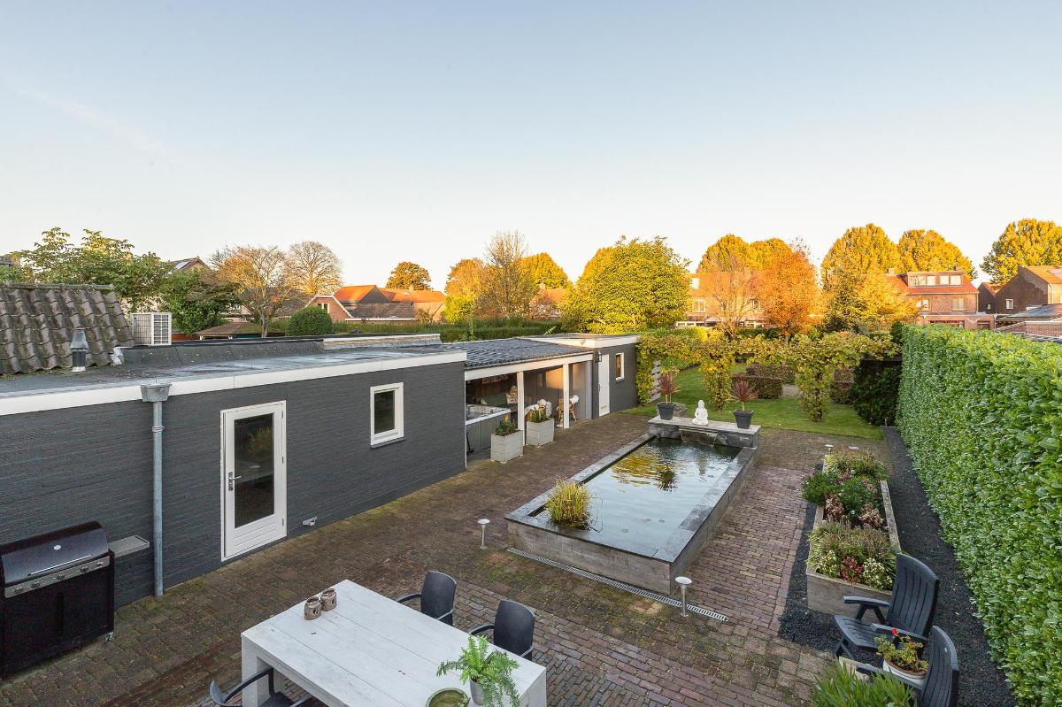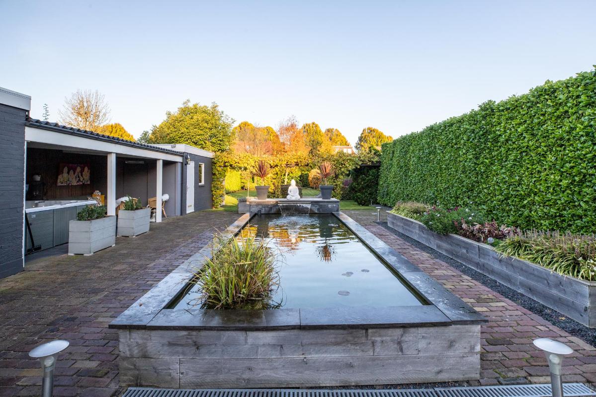 Achtertuin Verzorgde op het noordoosten gesitueerde achtertuin van maar liefst 475 m² groot en 45 meter diep. De achtertuin is, grenzend aan de woning, voorzien van een riant terras, een ruime vijver en een overkapping met daaronder de jacuzzi. Verder treft u in de tuin een groot grasveld, een zonneterras en een diversiteit aan beplanting. Vanuit de tuin heeft u toegang tot de stenen berging, deze is circa 12 m² groot en is voorzien van elektra. Via een poort rechts van de woning is de achtertuin bereikbaar vanaf de openbare weg.