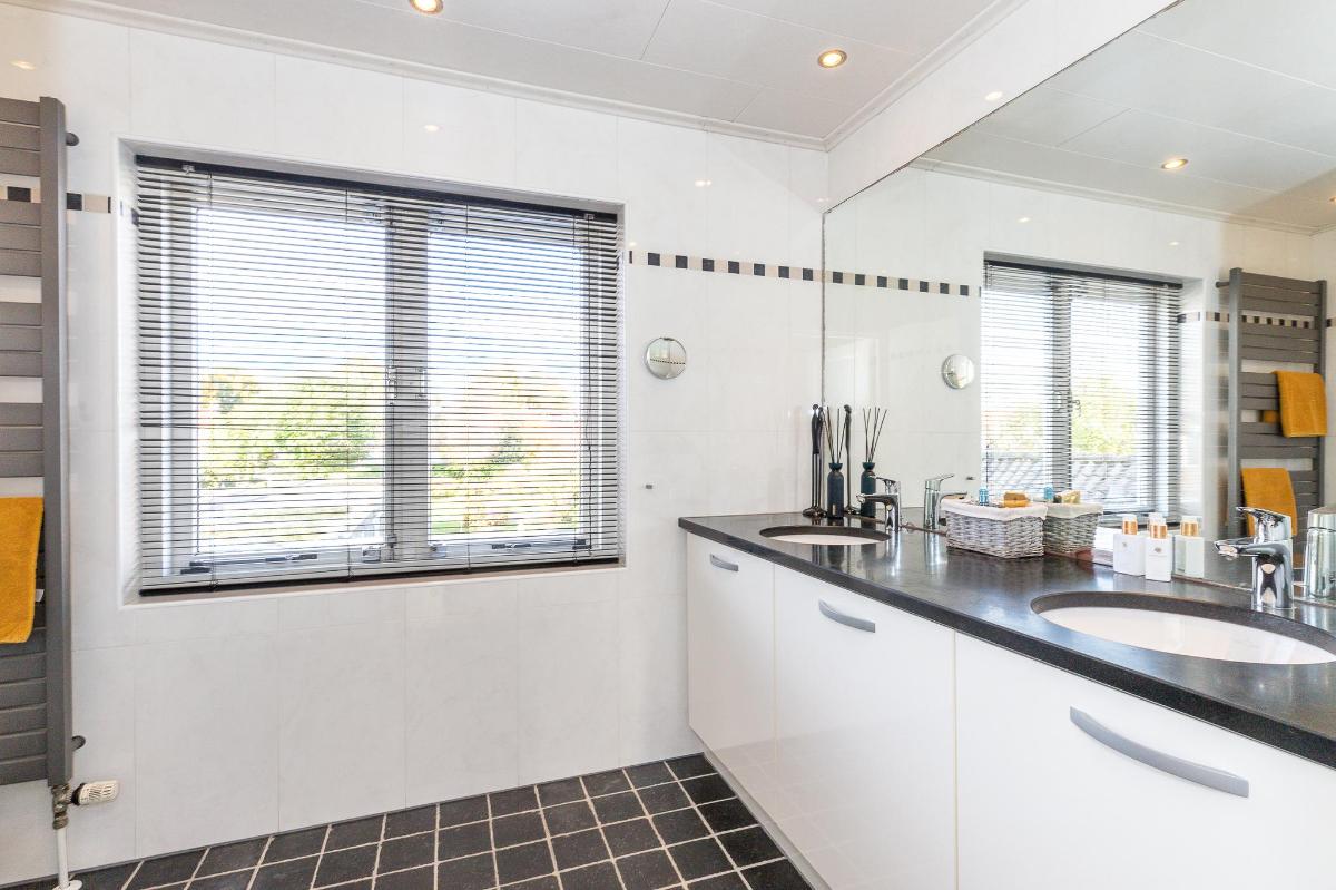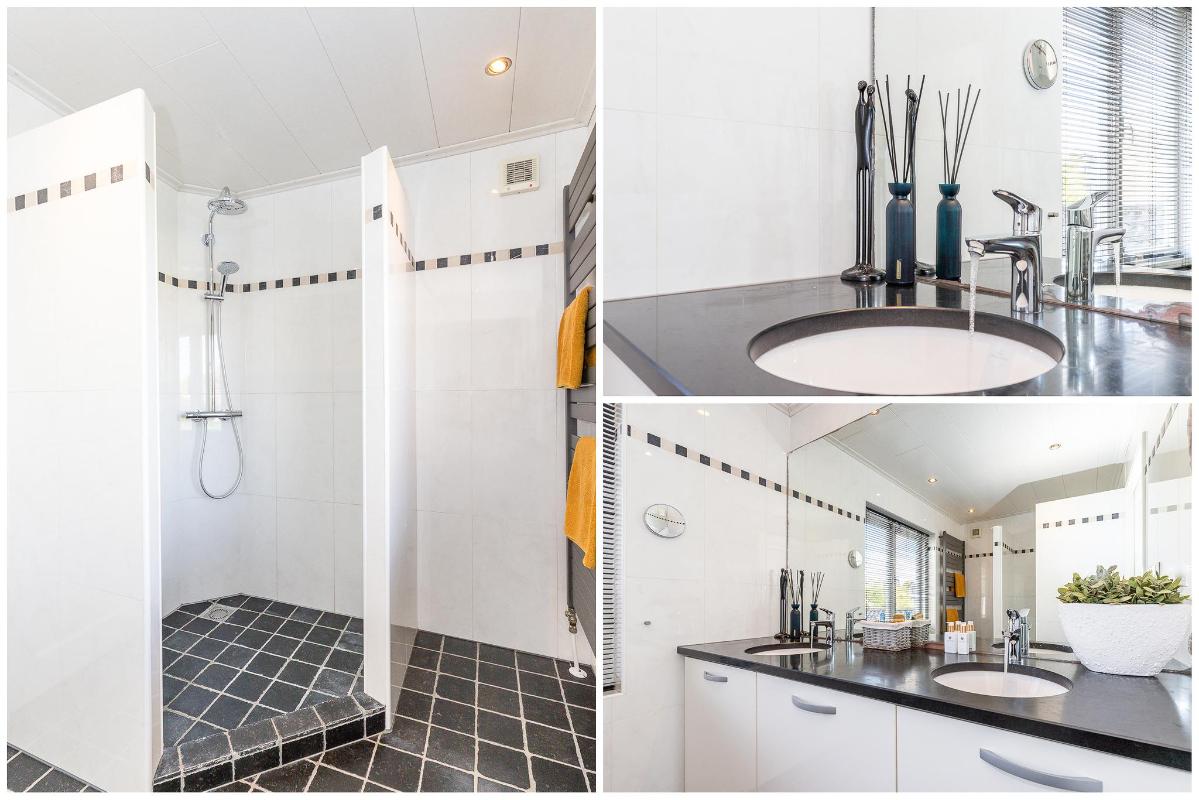 Badkamer De badkamer is voorzien van een ruime inloopdouche, twee wastafels met mengkranen en een riant meubel, een grote verwarmde spiegel en mechanische ventilatie. De vloer is voorzien van zwarte tegels, de wanden zijn betegeld in een neutrale kleurstelling en het plafond is voorzien van MDF panelen met inbouwspots.