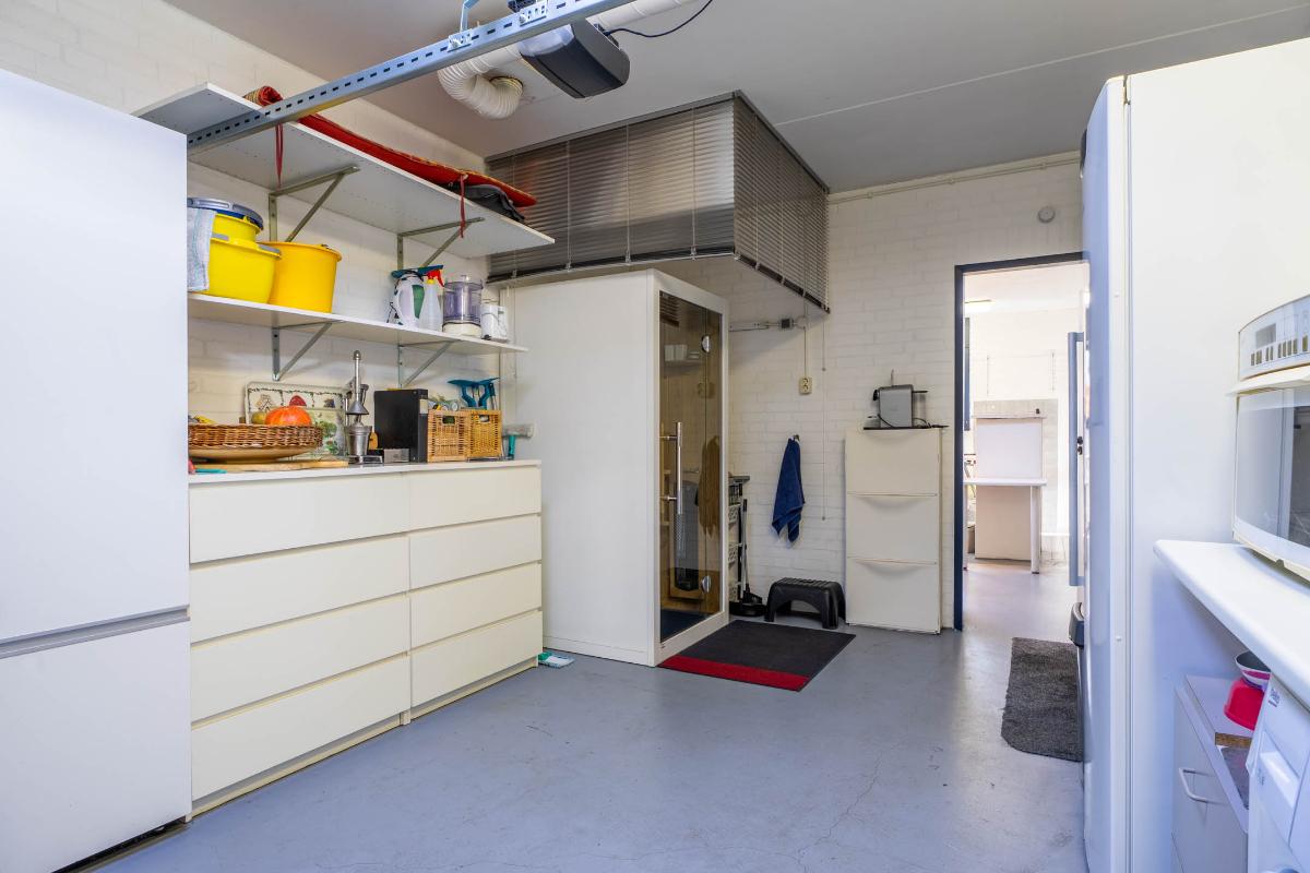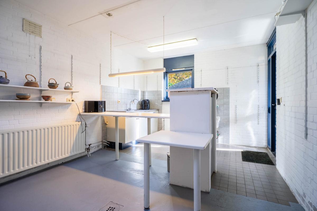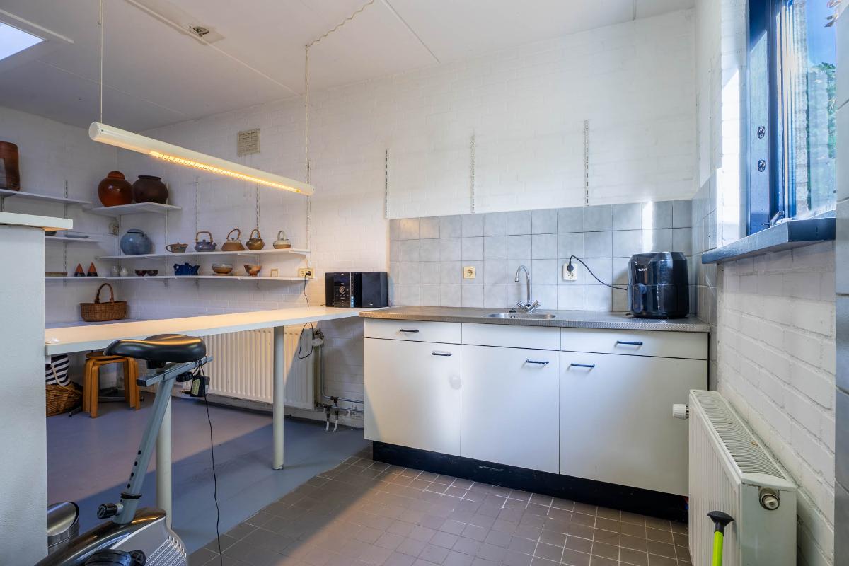ATELIER Het atelier is bereikbaar vanuit de garage en biedt tal van mogelijkheden. De ruimte is voorzien van de verdeler van de vloerverwarming, verwarming, lichtkoepel voor voldoende lichtinval, uitstortgootsteen, eenvoudige keuken in wandopstelling met close-in-boiler en toegangsdeur naar de tuin.