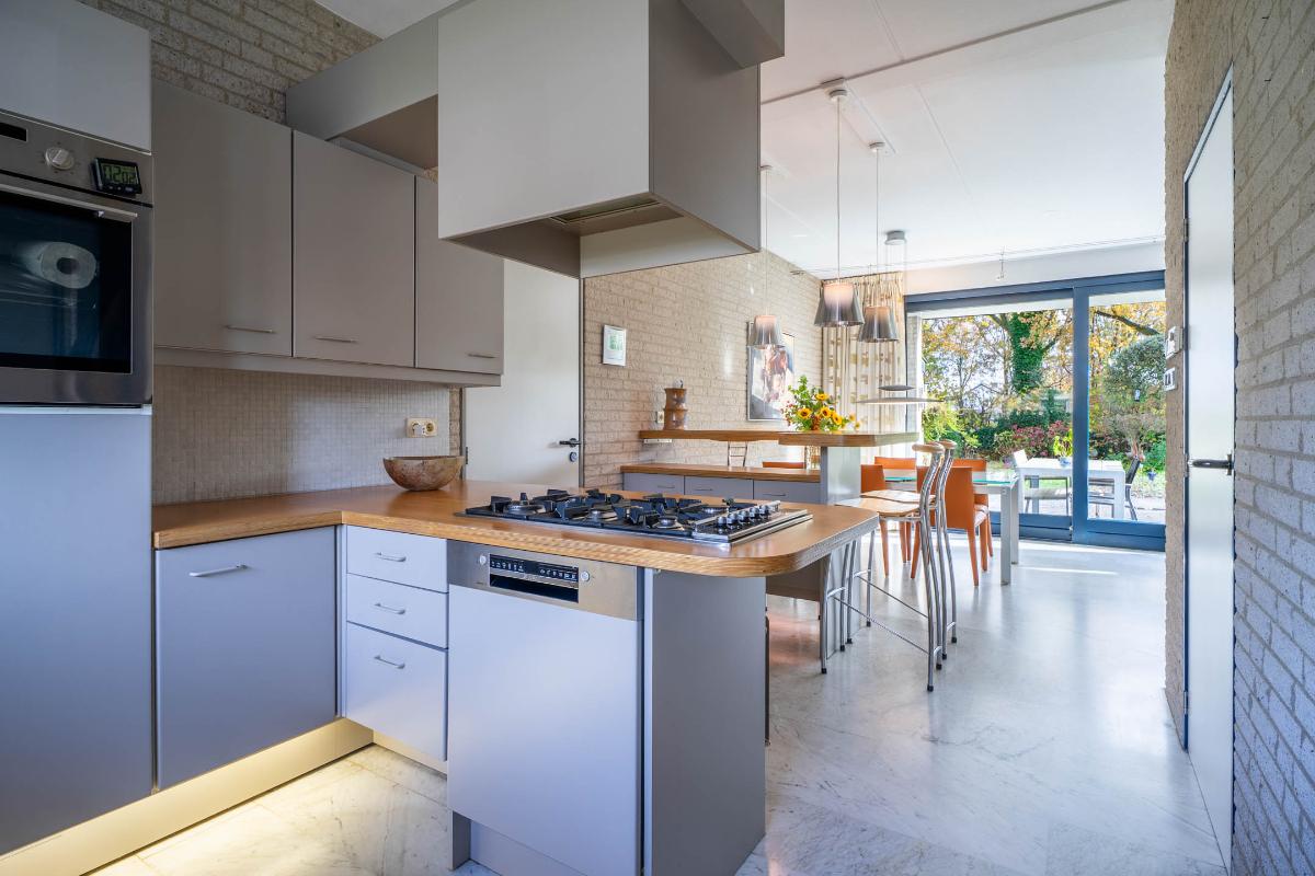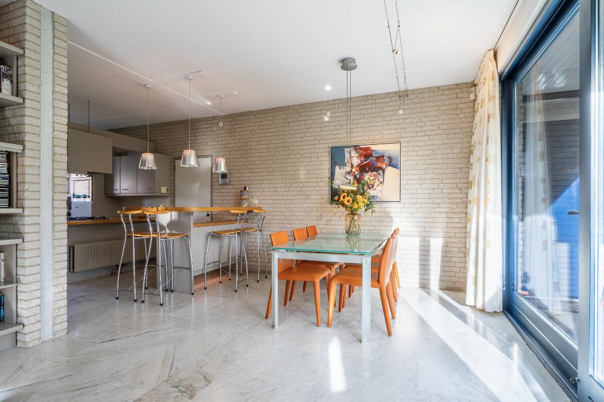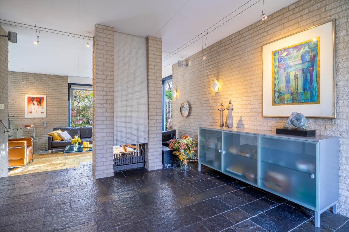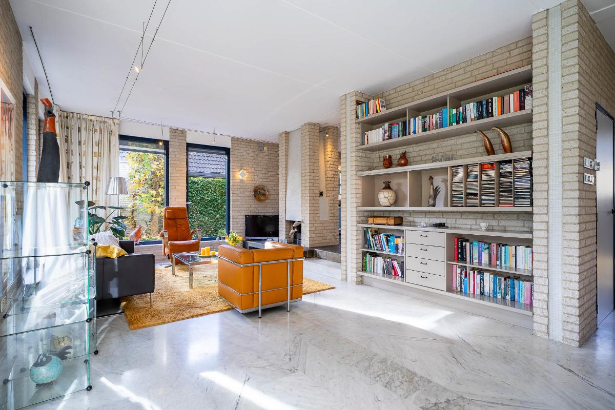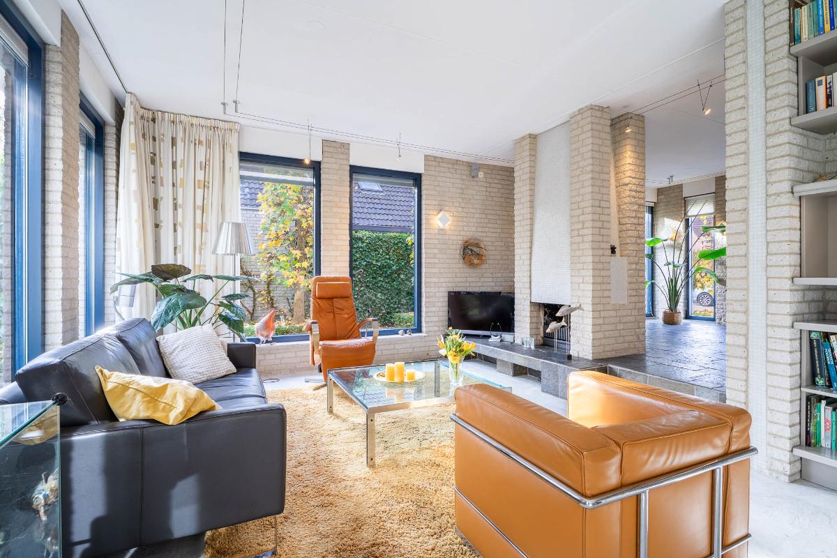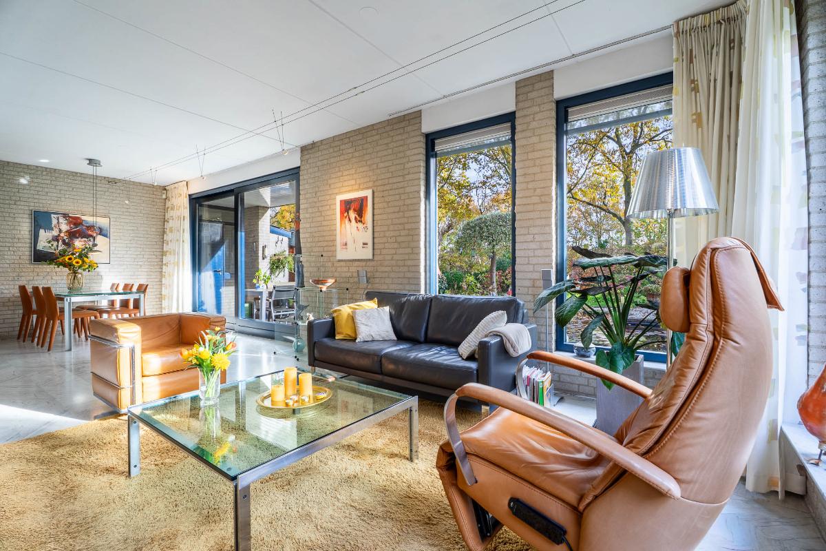 LIVING De living is door de architect op een speciale wijze ingericht en gebouwd en voorzien van vloerverwarming. Alle ruimtes lopen naadloos in elkaar over en hebben verschillende doeleinden zoals het eetgedeelte, de gezellige zithoek, tuingerichte woonkamer en de keuken. Door slim gebruik te maken van de (gas)haard (voorheen open haard) als roomdevider én het niveauverschil in de ruimtes is de zithoek fraai afgezonderd van de woonkamer. Alle ruimtes genieten een enorm fijne lichtinval middels de vele raampartijen rondom (deels tot de grond), welke voorzien zijn van een (handmatig) bedienbare screen. De sfeervolle woonkamer geeft aan de achterzijde middels de schuifpui toegang tot de tuin en staat in open verbinding met de keuken gelegen aan de voorzijde van de woning.