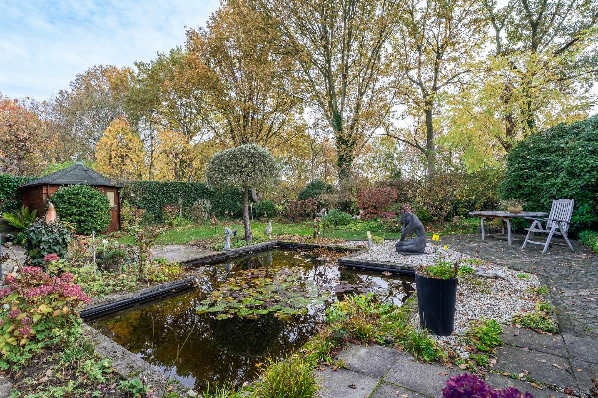 TUIN De verzorgd aangelegde, volgroeide en privacybiedende tuin (in totaal ca. 364m²) is gelegen voor, naast en achter de woning en hier is de gehele dag zowel zon als schaduw te vinden waardoor het een heerlijke plek is om te vertoeven. Het grote voordeel van de achtertuin is dat deze grenst aan 'De Groene Long' en hierdoor geen inkijk heeft en maximale rust garandeert. De achtertuin is voorzien van een houten berging, volwassen beplanting, vijverpartij, gazon, diverse terrassen, verlichtingspunten, overkapping aan het huis, waterpunt aan de gevel en bestrating. Aan de zijkant van de woning bevindt zich een ijzer hekwerk met poort om de zijtuin te kunnen bereiken. De zijtuin is eveneens verzorgd aangelegd in dezelfde stijl als de voortuin met diverse vaste beplanting en fraai siergrind.