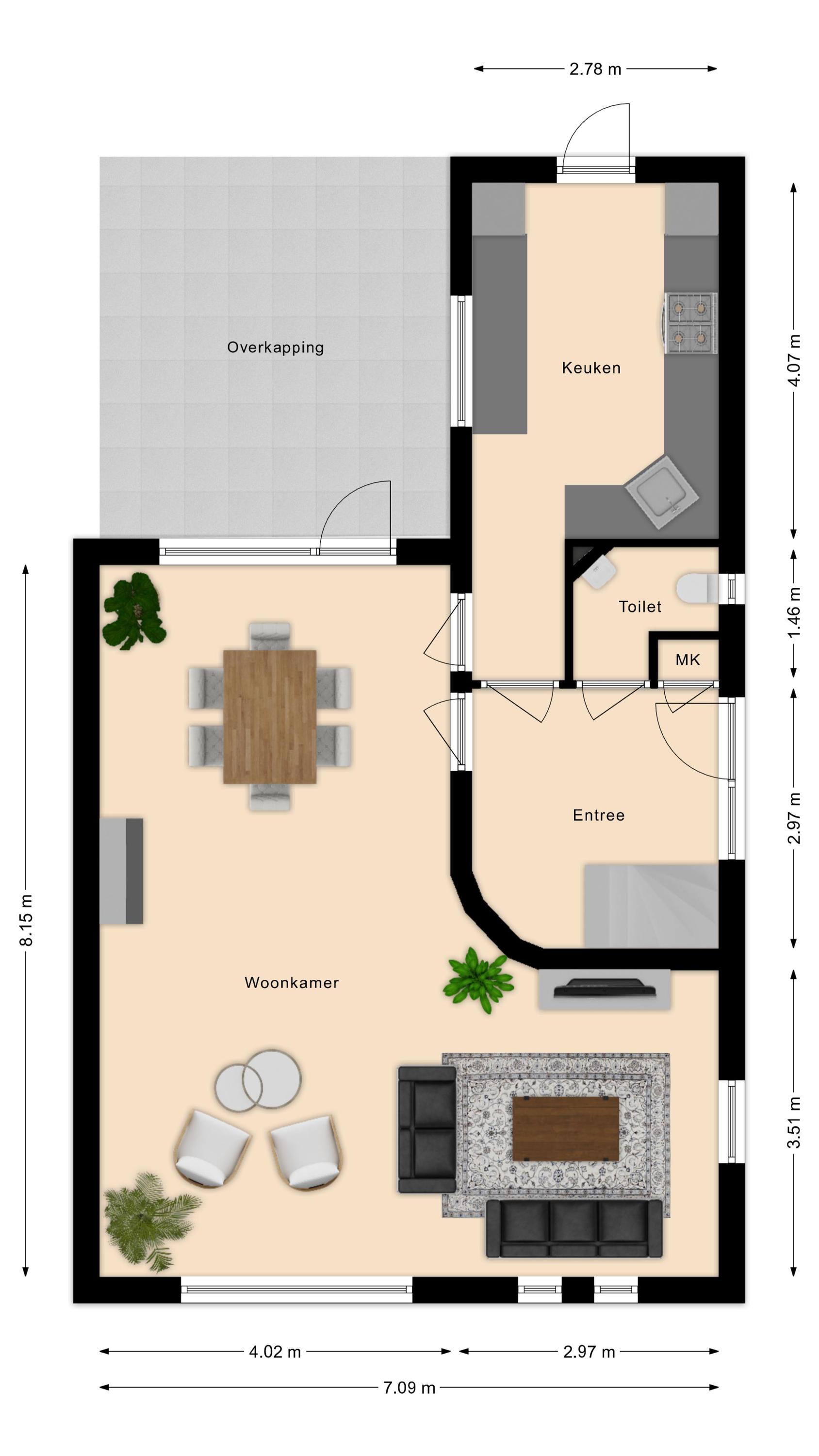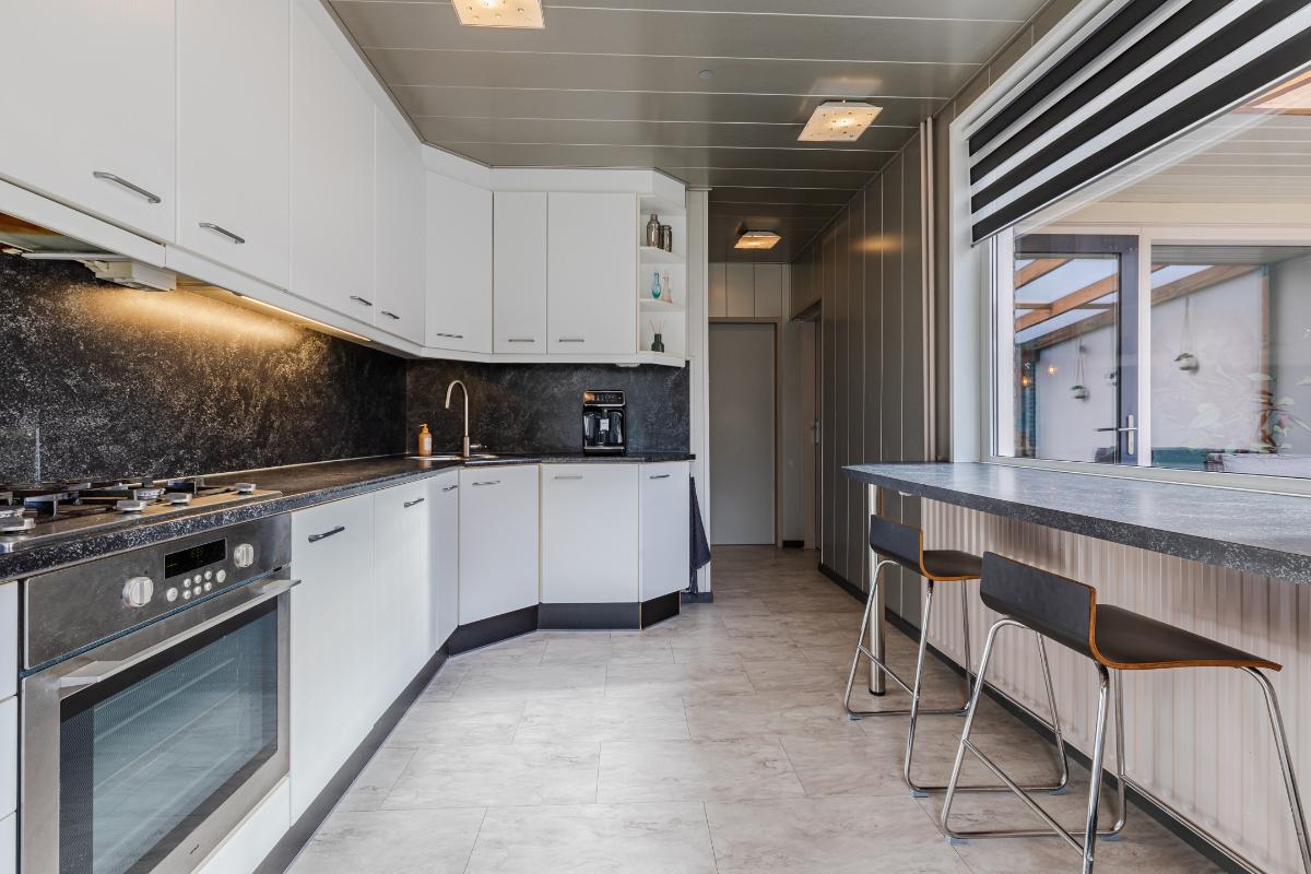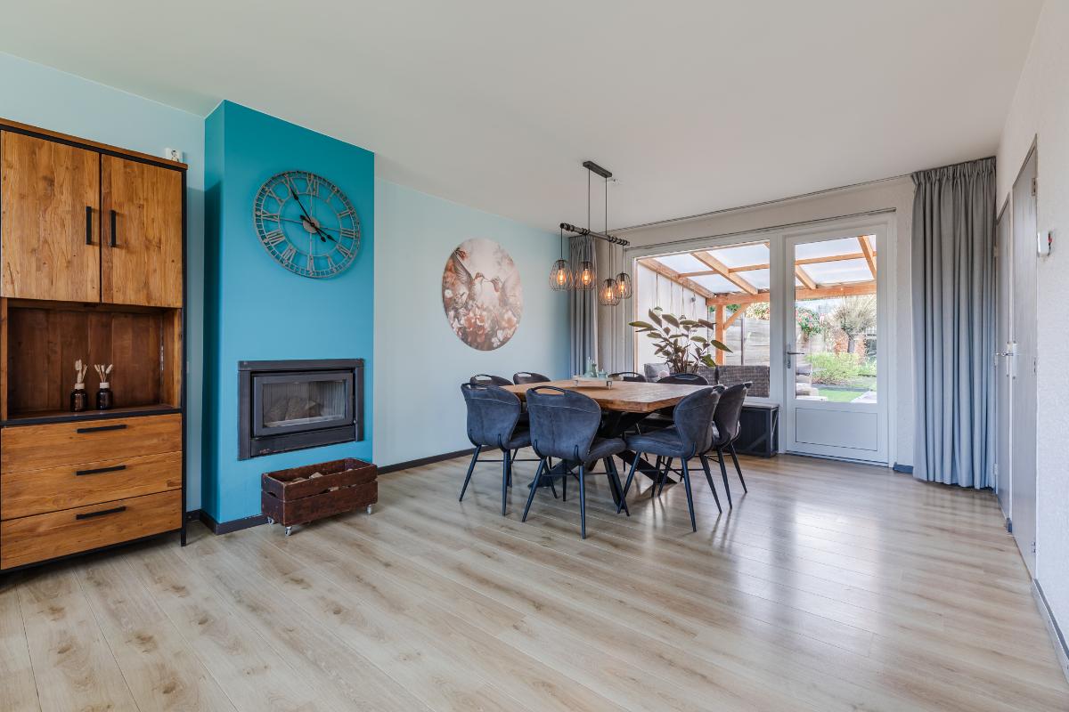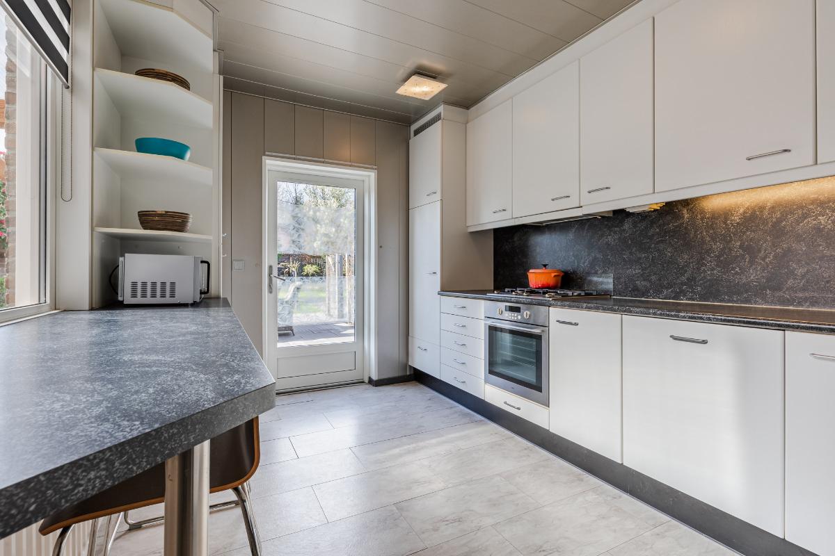 Entree aan zijgevel via ruime oprit met alle ruimte voor auto's/camper/caravan. Hal met toegang tot de keuken en woonkamer. Verder grenzen aan de hal de meterkast en de nette toiletruimte met hangcloset en fonteintje. Woonkamer in L-vorm (ca. 43 m2!) met houtkachel en deur naar achtertuin. Ook vanuit de woonkamer is de keuken toegankelijk met inrichting in hoekopstelling, onder meer uitgerust met gaskookplaat, elektrische oven, vaatwasser, afzuigkap en koelkast met vriesvak.