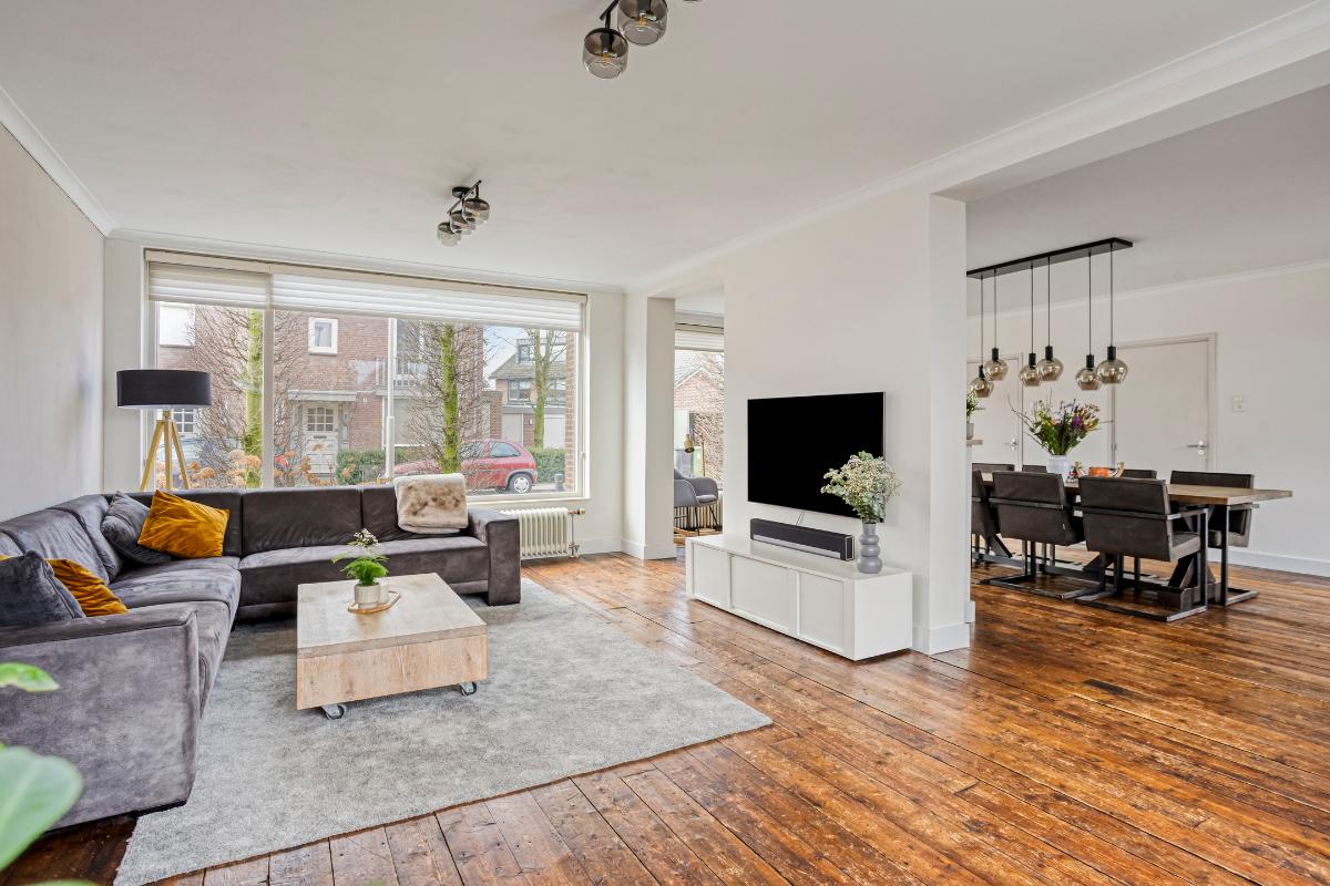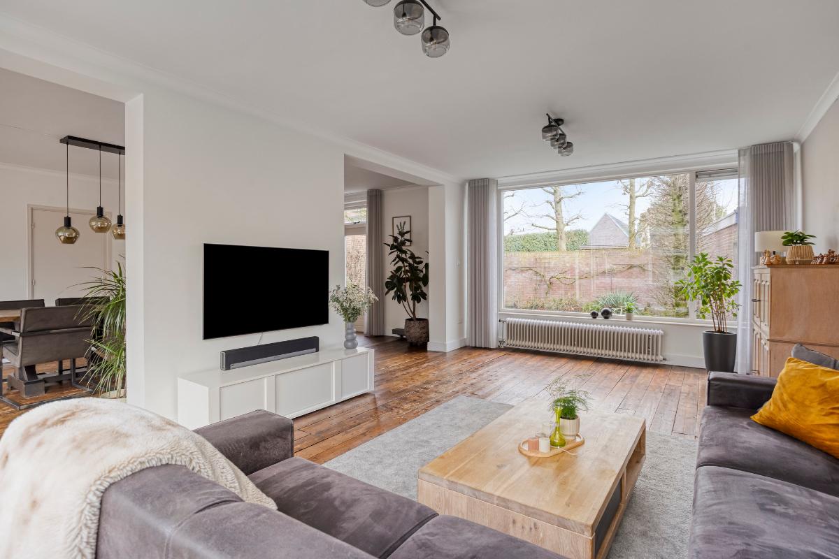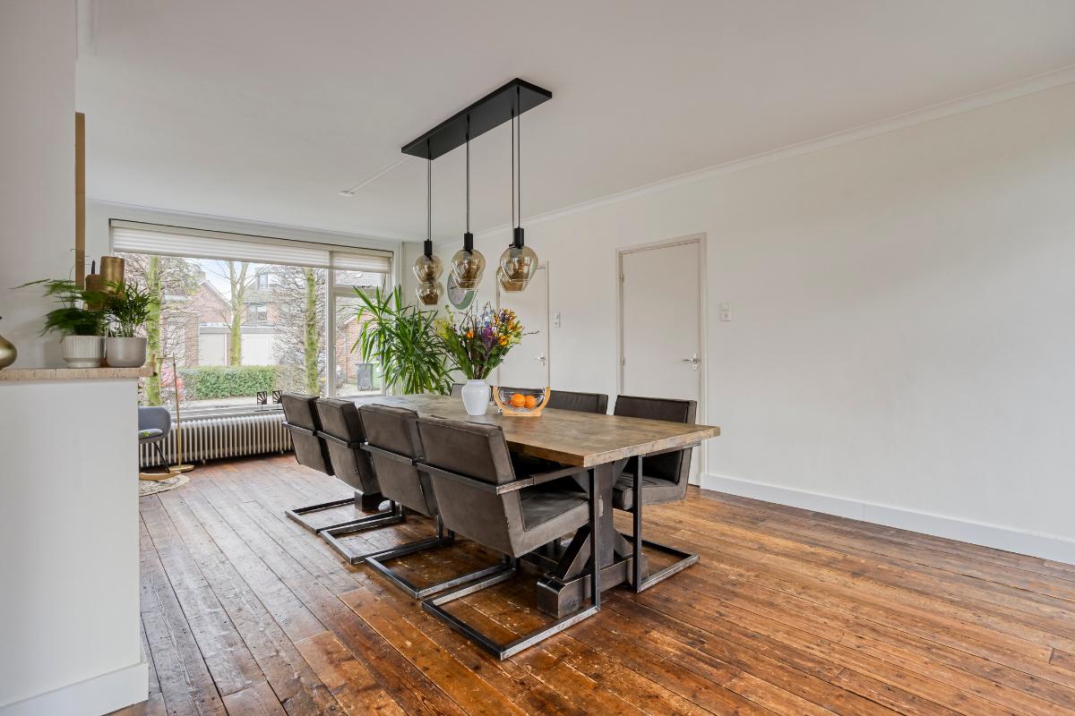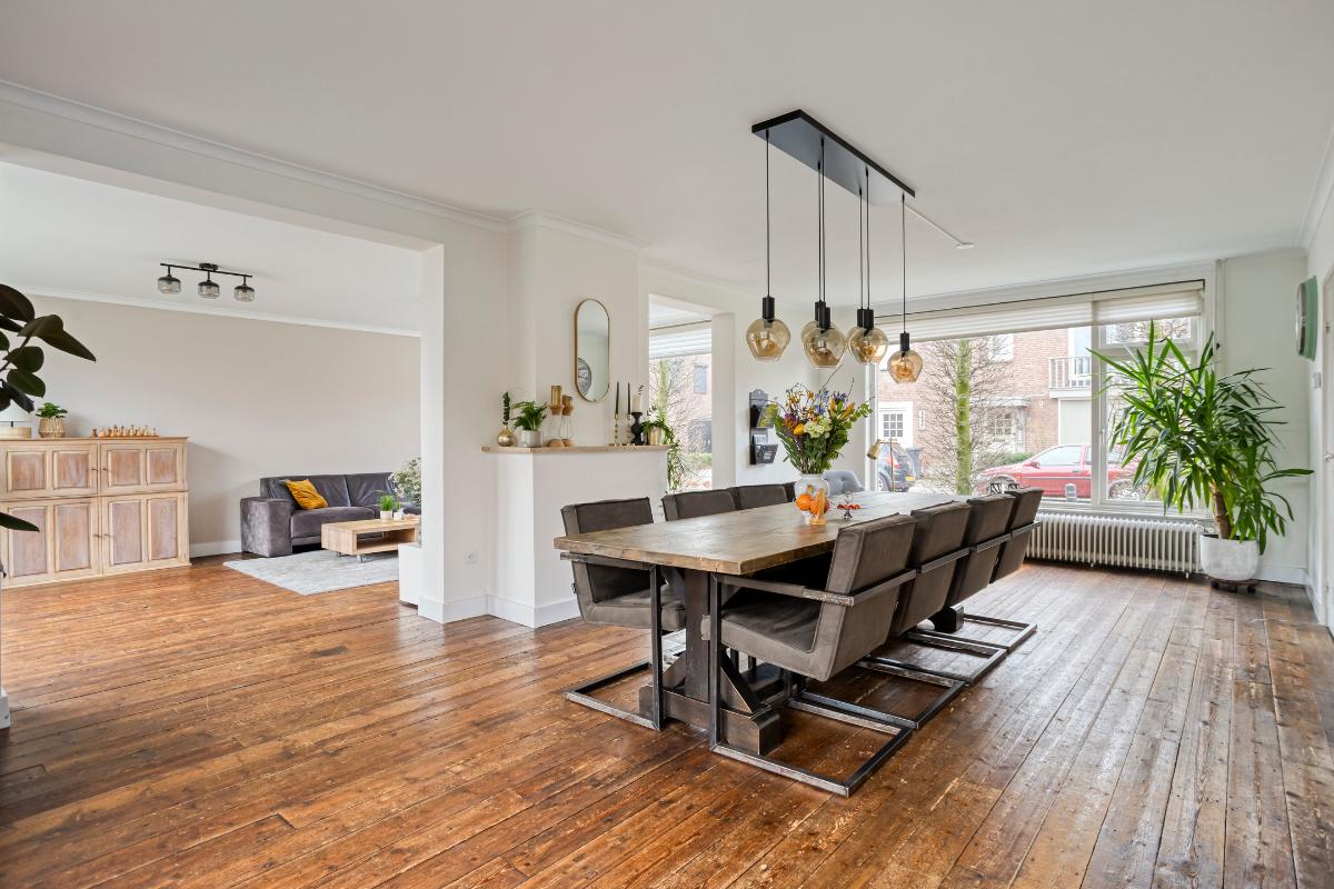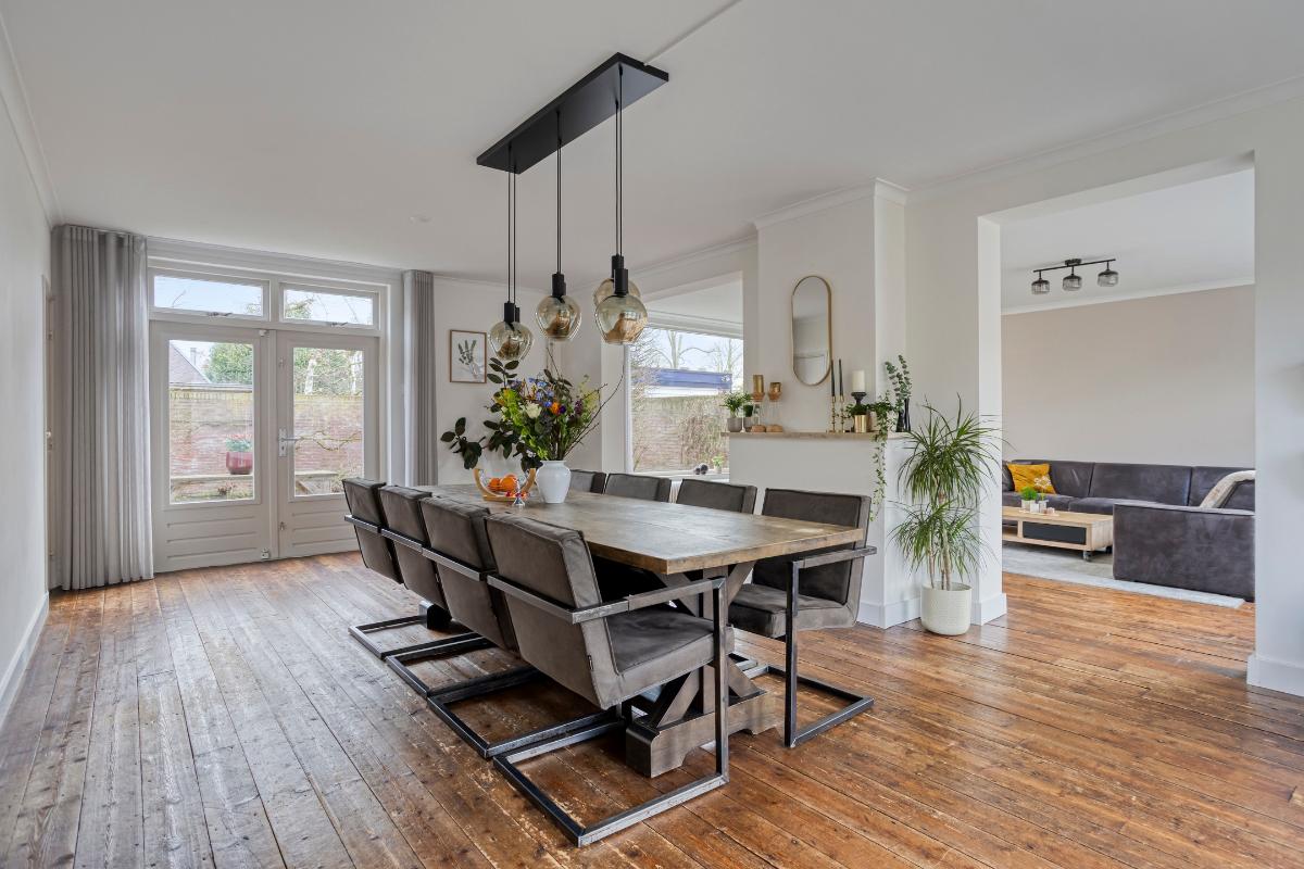 WOONKAMER / EETKAMER De sfeervolle en lichte living is opgedeeld in een aangebouwde zitkamer aan de ene zijde en een eetkamer aan de andere zijde. Beide ruimtes beschikken over een houten planken vloer, strak stucwerk op de wanden en plafonds met sierlijsten. Vanuit de eetkamer geven openslaande deuren toegang tot het terras. Daarnaast beschikt deze ruimte over een schouw met rookkanaal (thans niet in gebruik), een praktische inbouwkast en een deur naar de keuken.