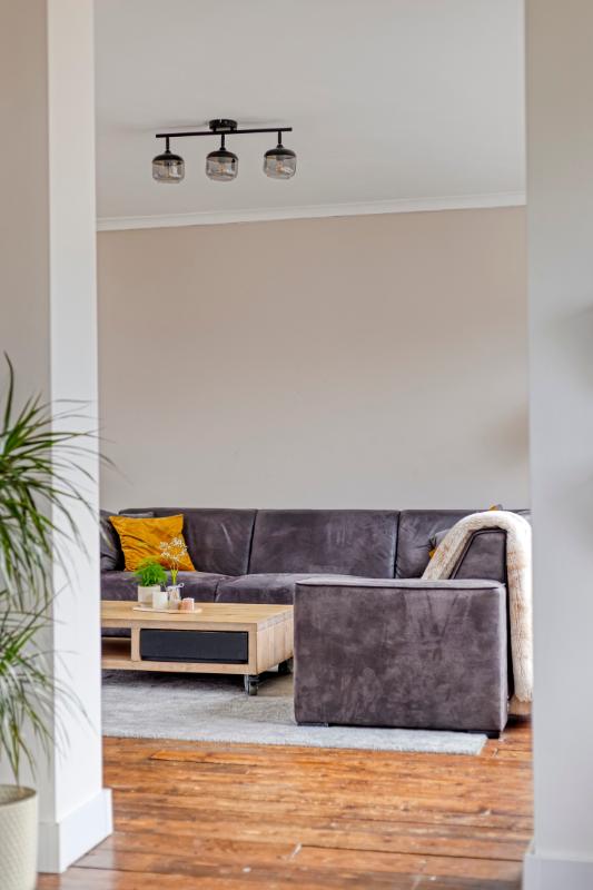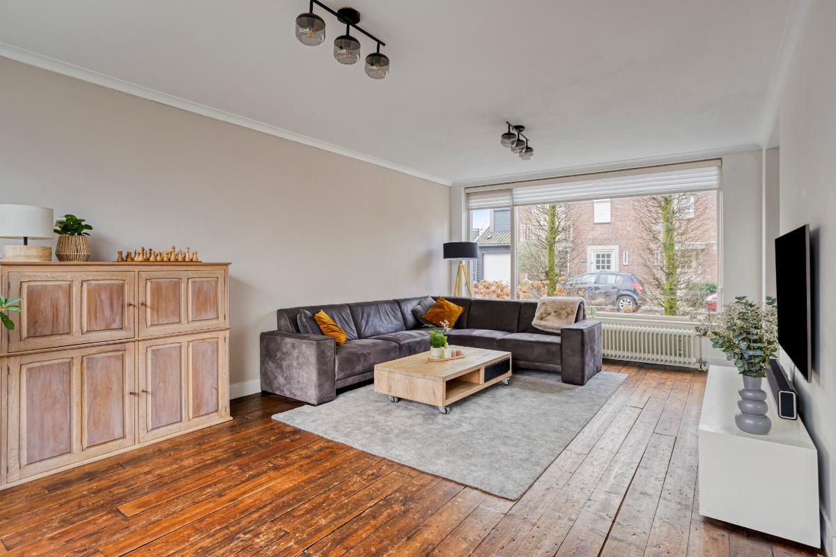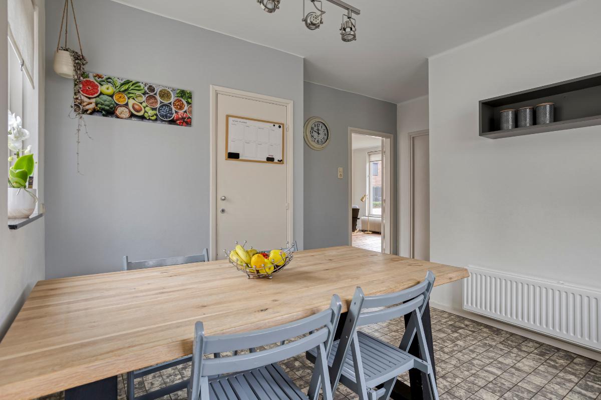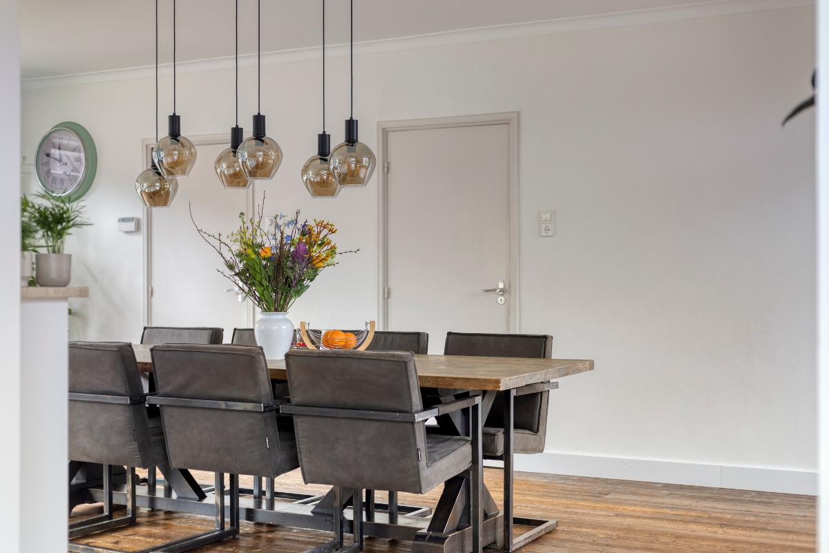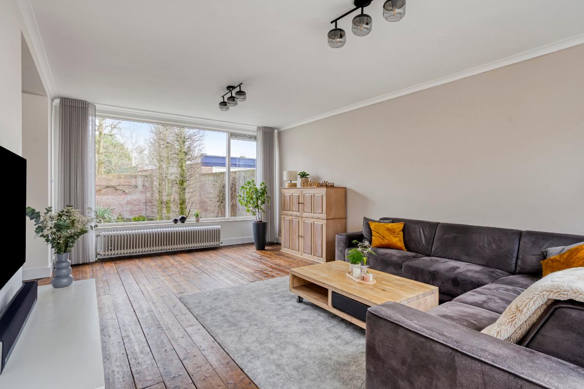 WOONKAMER / EETKAMER De sfeervolle en lichte living is opgedeeld in een aangebouwde zitkamer aan de ene zijde en een eetkamer aan de andere zijde. Beide ruimtes beschikken over een houten planken vloer, strak stucwerk op de wanden en plafonds met sierlijsten. Vanuit de eetkamer geven openslaande deuren toegang tot het terras. Daarnaast beschikt deze ruimte over een schouw met rookkanaal (thans niet in gebruik), een praktische inbouwkast en een deur naar de keuken.