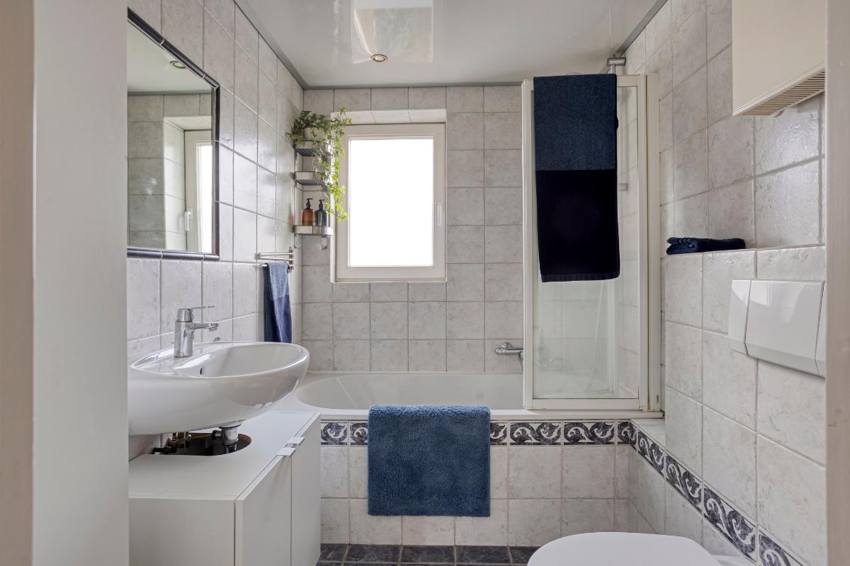 BADKAMER Volledig betegelde badkamer voorzien van een ligbad met thermostaatkraan en douchescherm, vaste wastafel met mengkraan, wandcloset en een spanplafond met inbouwspots.