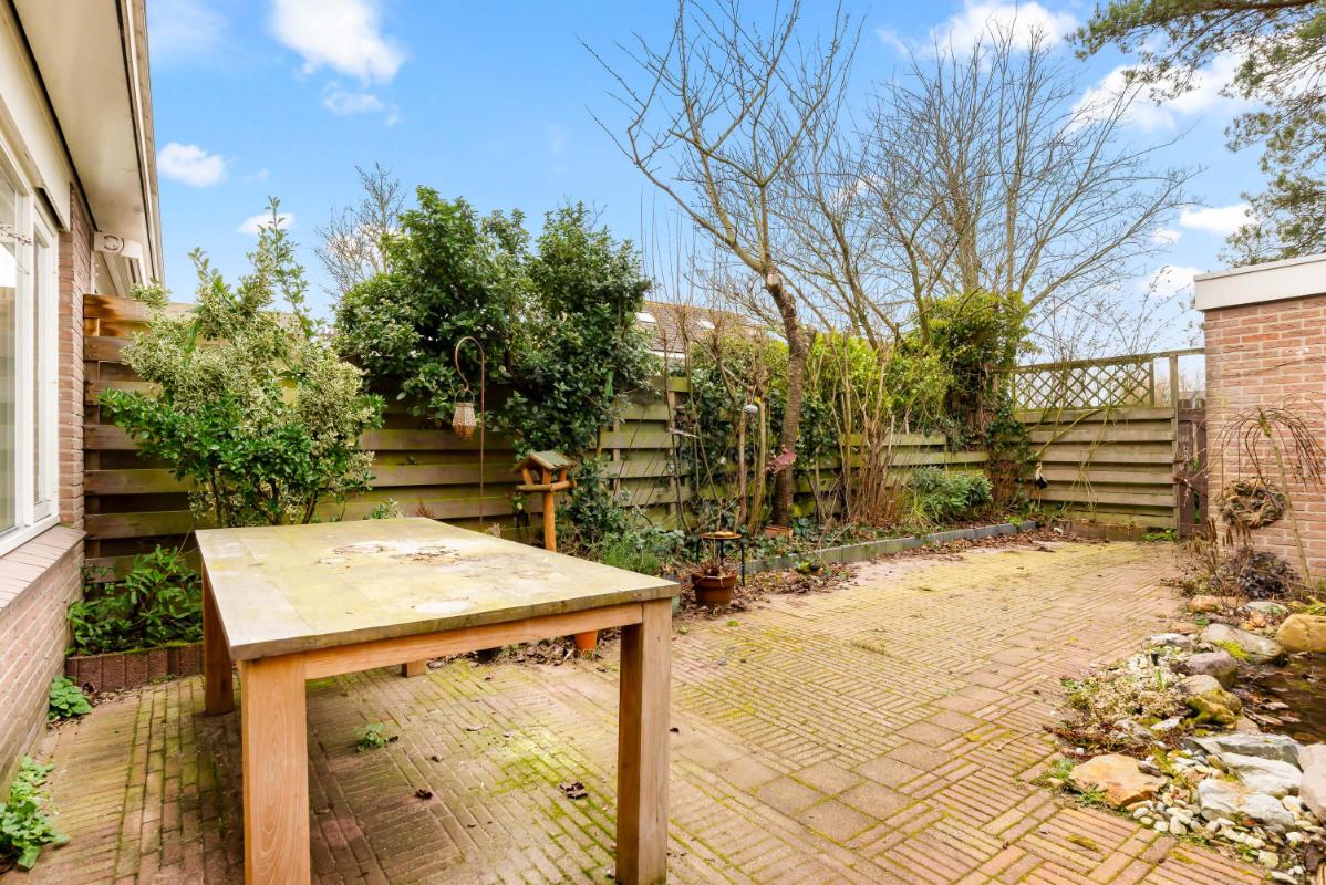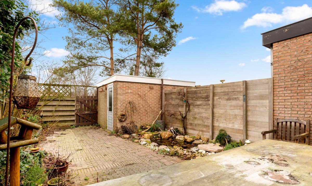 Tuin met privacy en zon Vanuit de woonkamer kijkt u vrij uit over de achtertuin. Dankzij het ontbreken van directe achterburen geniet u hier van optimale privacy. De tuin is gelegen op het noordwesten, waardoor u heerlijk profiteert van de middag- en avondzon. In de vrijstaande stenen berging (ca. 7 m²) is voldoende ruimte voor fietsen en extra opslag.