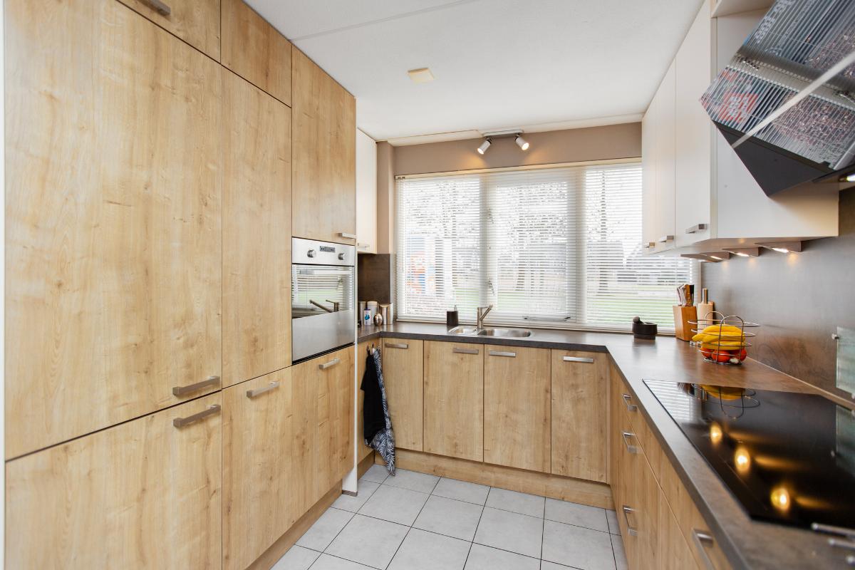 Begane grond: Entree, gang met meterkast (vernieuwde groepenkast met voldoende groepen), toilet met een fonteintje en de trap naar de verdieping. Deur naar de tuingerichte woonkamer waar een voorraadkast onder de trap is gerealiseerd. Vanuit de zithoek heeft u een heerlijk weids uitzicht over de ruim 13 meter diepe achtertuin. Aan de voorzijde bevindt zich de keurige in een houtlook uitgevoerde keuken met veel kastruimte en diverse inbouwapparatuur, zoals een koel-vriescombinatie, vaatwasser, oven, 5-pits inductie kookplaat, afzuigkap, 10L close in boiler, 1 hoekkast plus 1 hoek carrouselkast. De gehele begane grond is voorzien van vloerverwarming.