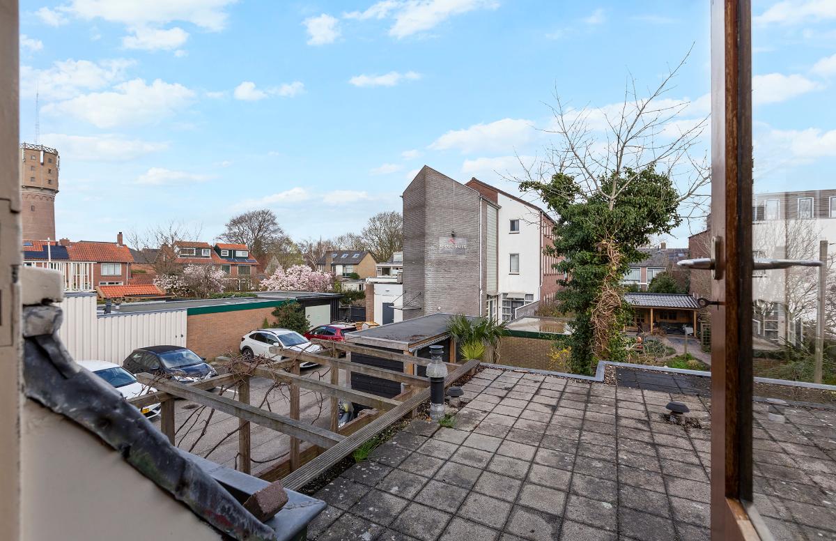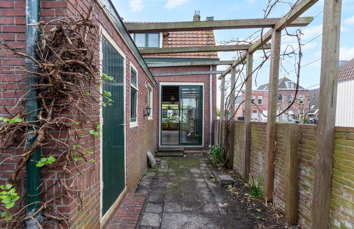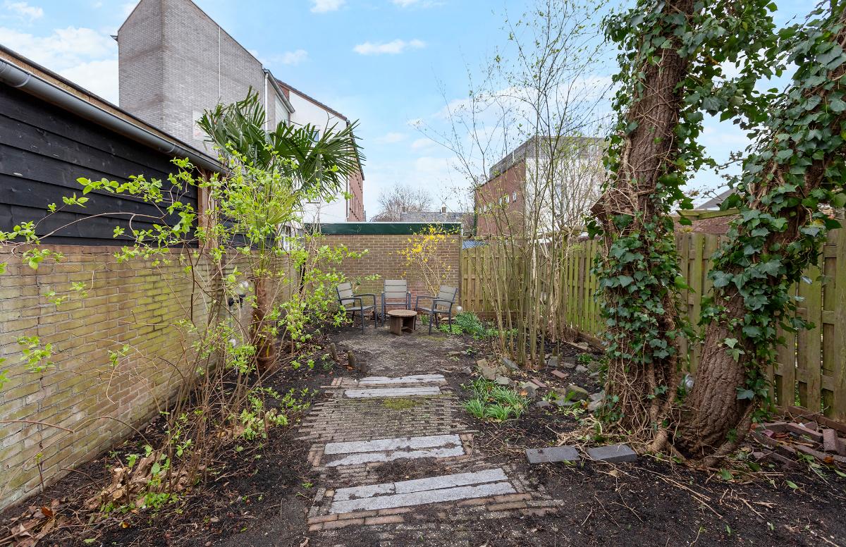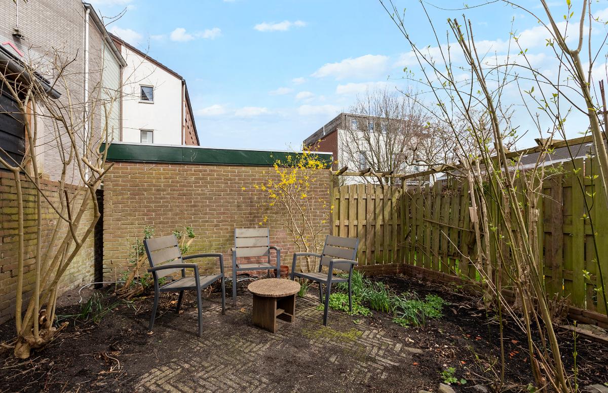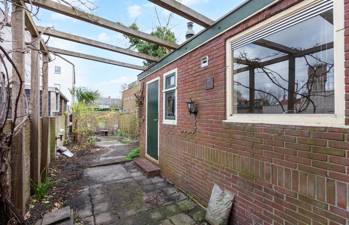 Buiten: Een diepe achtertuin (ca. 15 meter lang vanaf de achtergevel gemeten, deels ca. 8 meter) op het noordoosten gelegen. Door de diepte en de situering ten opzichte van omliggende bebouwing, is er volop van de zon te genieten. Er is een achterom aanwezig.