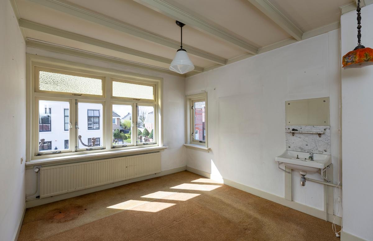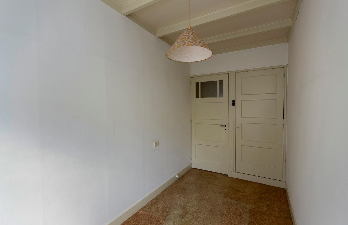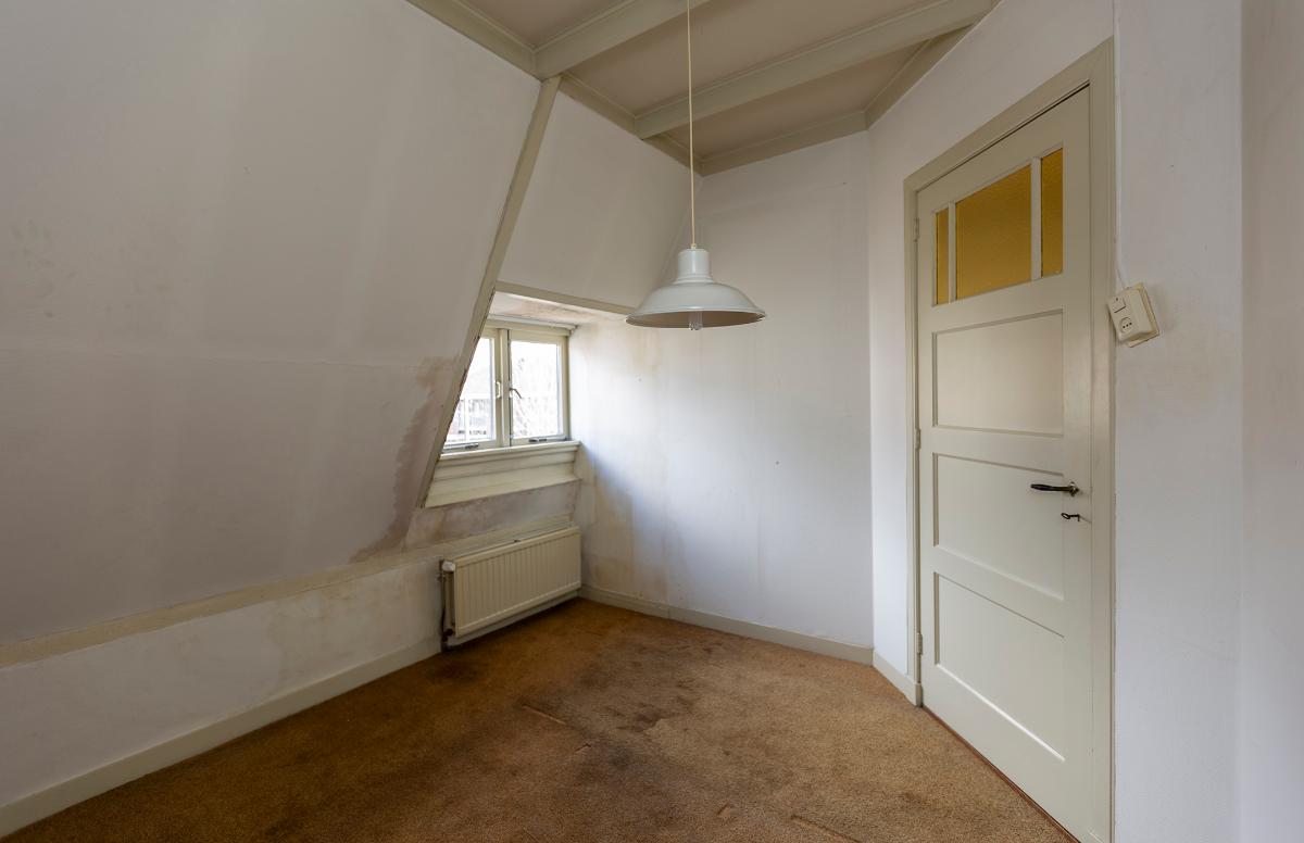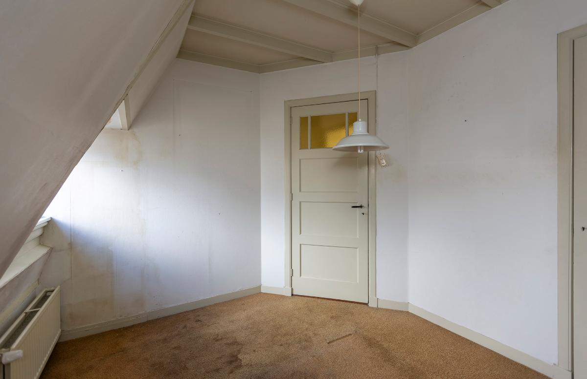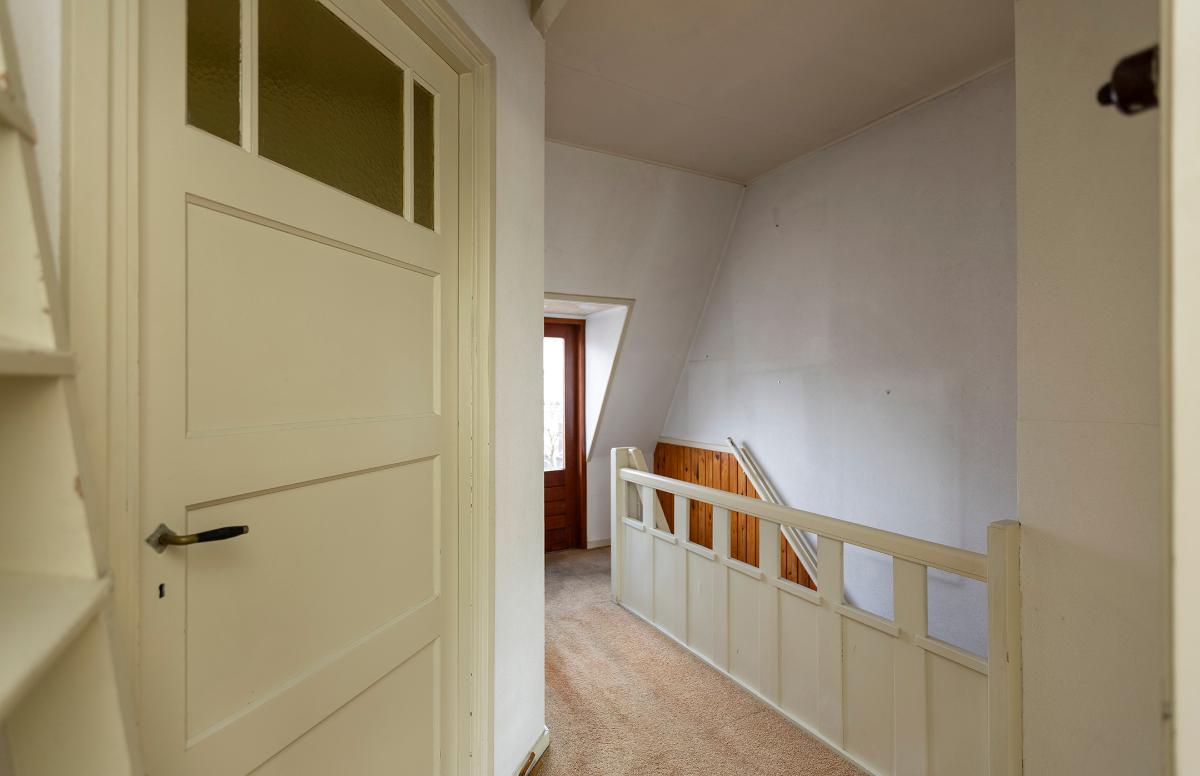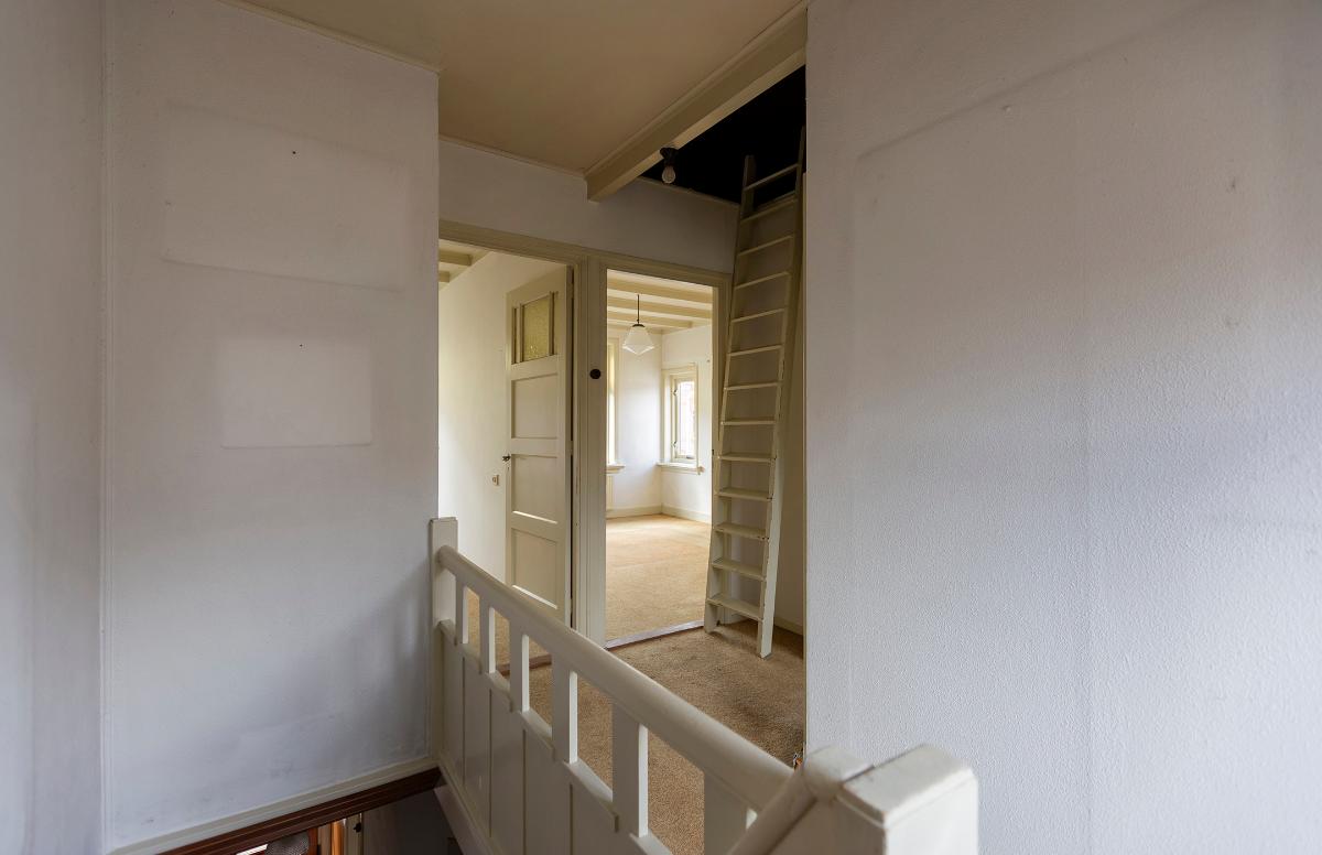 Eerste verdieping: overloop met een deur naar het plat boven de keuken. Aan de achterzijde is een slaapkamer en aan de voorzijde zijn nog eens 2 kamers. Alle kamers zijn voorzien van een inbouwkast. Op de overloop is een luik en een losse trap naar de royale bergzolder waar de lichtinval via een koekoek aan de voorzijde komt.