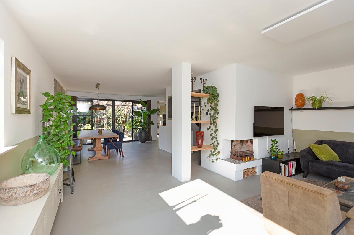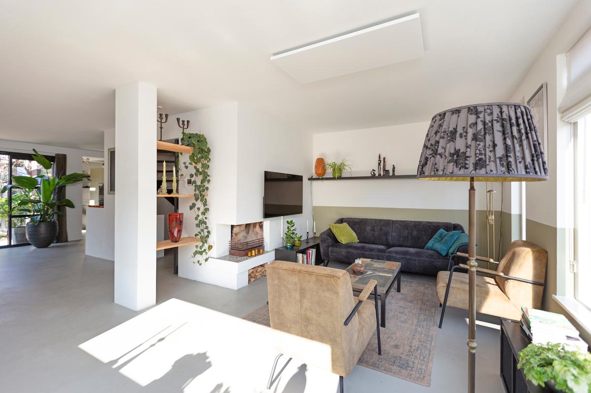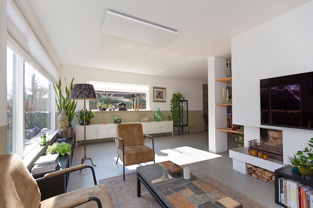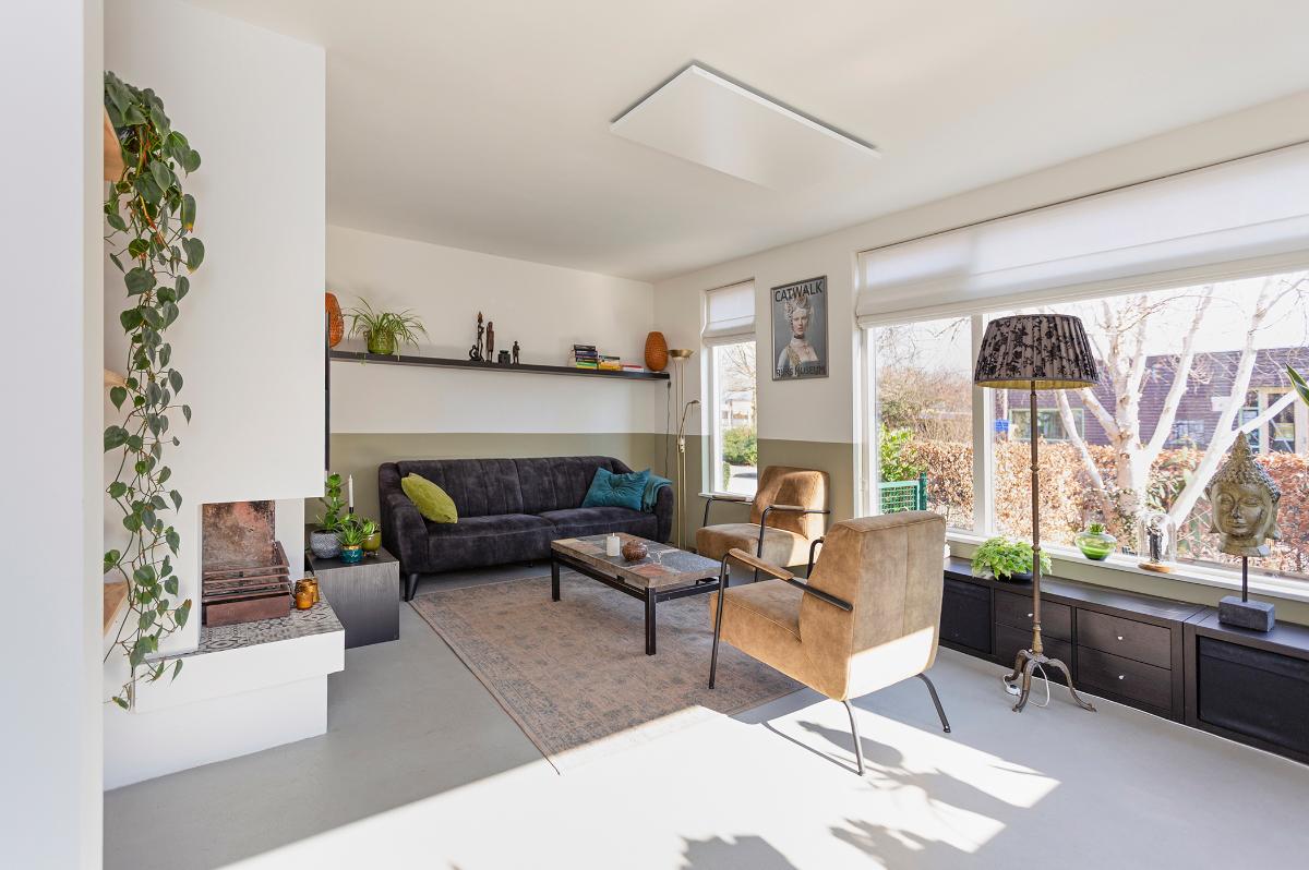Begane grond: Entree, hal met moderne meterkast met voldoende groepen (geheel vernieuwd in 2019) , toilet met een fonteintje, kast, open hardhouten trap naar de verdieping. Taats deur naar de ruime L-vormige living met een (hoek)openhaard (thans niet meer in gebruik, wel eenvoudig weer in gebruik te nemen), groot voor- en zijraam en een grote schuifpui naar de tuin. De open keuken loopt deels over in de uitbouw en is in een hoekopstelling geplaatst en is voorzien van diverse apparatuur zoals een vaatwasser, inductie kookplaat, afzuigkap, 2 ovens alsmede een ‘losse’ koel-vriescombinatie. De hele begane grond is voorzien van een fraaie cementdekvloer. Zowel de woonkamer als de bijkeuken zijn voorzien van vloerverwarming. Vanuit de hal is een deur naar de studeer-,werk- of slaapkamer en er is een deur naar de ruime garage die is voorzien van een geïsoleerde deur, elektra en verwarming.
