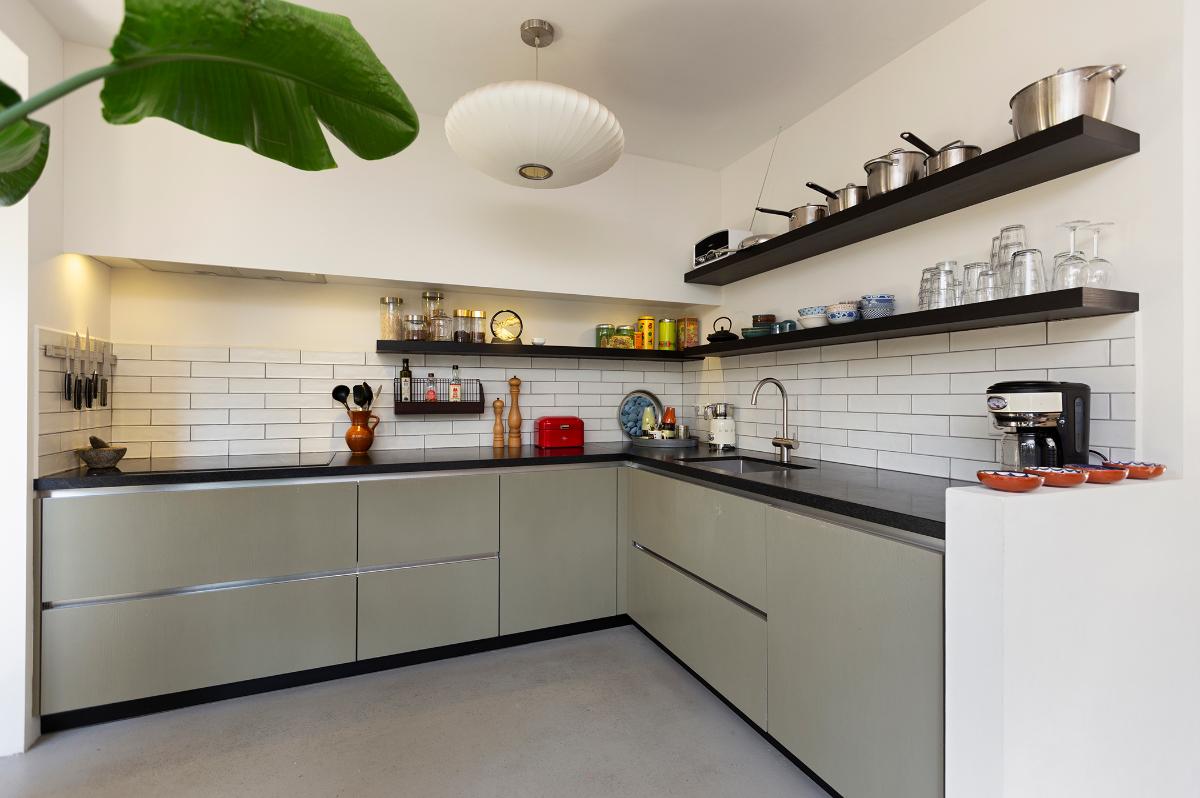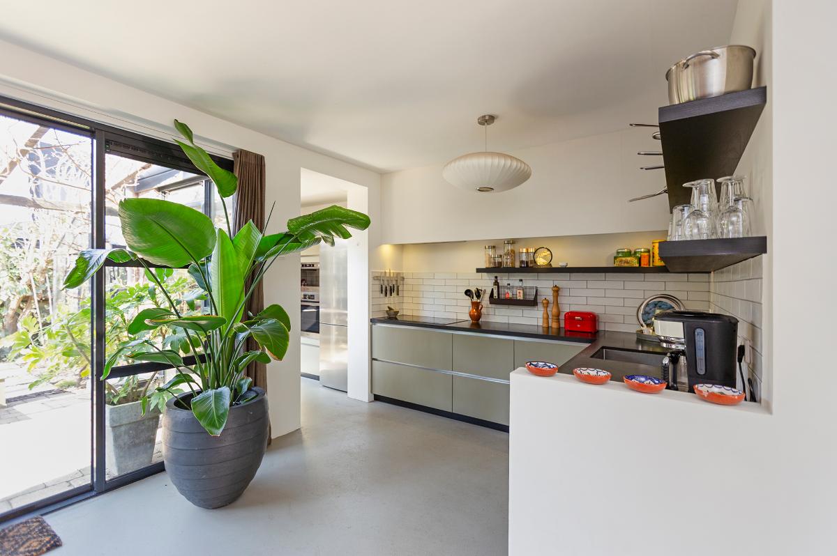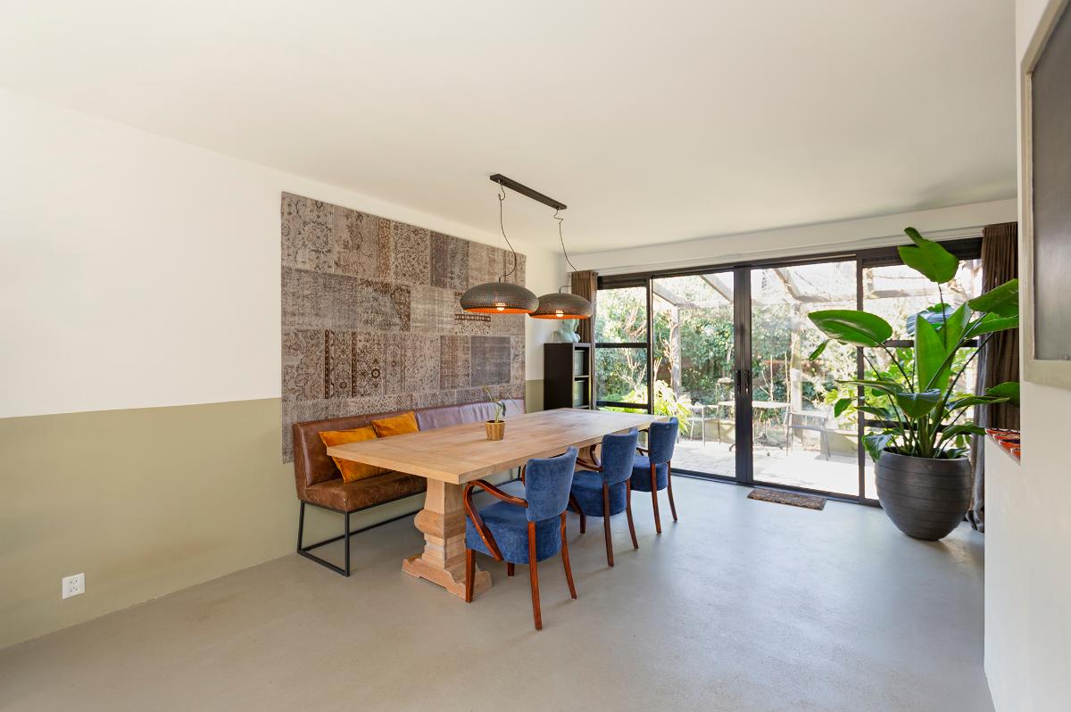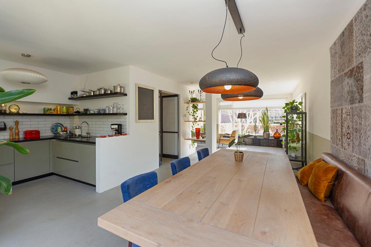 Begane grond: Entree, hal met moderne meterkast met voldoende groepen (geheel vernieuwd in 2019) , toilet met een fonteintje, kast, open hardhouten trap naar de verdieping. Taats deur naar de ruime L-vormige living met een (hoek)openhaard (thans niet meer in gebruik, wel eenvoudig weer in gebruik te nemen), groot voor- en zijraam en een grote schuifpui naar de tuin. De open keuken loopt deels over in de uitbouw en is in een hoekopstelling geplaatst en is voorzien van diverse apparatuur zoals een vaatwasser, inductie kookplaat, afzuigkap, 2 ovens alsmede een ‘losse’ koel-vriescombinatie. De hele begane grond is voorzien van een fraaie cementdekvloer. Zowel de woonkamer als de bijkeuken zijn voorzien van vloerverwarming. Vanuit de hal is een deur naar de studeer-,werk- of slaapkamer en er is een deur naar de ruime garage die is voorzien van een geïsoleerde deur, elektra en verwarming.