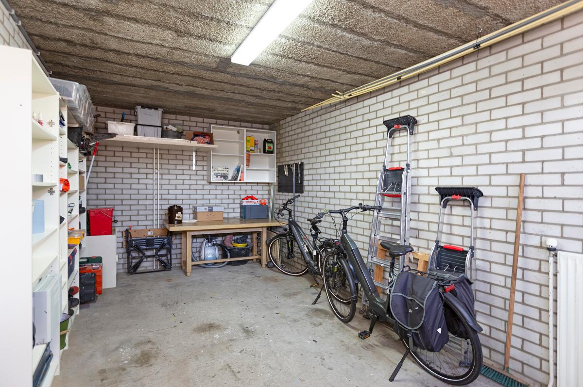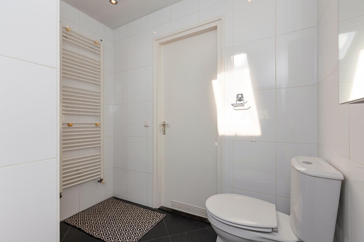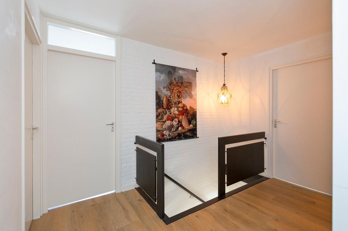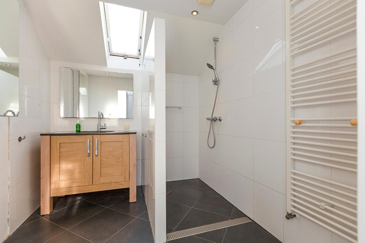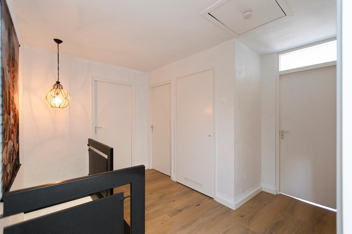 Eerste verdieping: Ruime overloop, kast met opstelplaats combi ketel (Intergas HR combiketel uit 2016). Grote slaapkamer aan de voorzijde met een ruime inloopkast. De badkamer is vanaf de overloop bereikbaar en is voorzien van een inloop douche, 2e toilet, wastafel, design radiator en Velux dakraam. Tweede slaapkamer aan de voorzijde (boven de garage) met bergruimte. 3 slaapkamers aan de achterzijde waarvan 1 met toegang tot het dakterras/balkon met eveneens een grote bergruimte. De slaapkamer aan de achterzijde die grenst aan de badkamer is thans in gebruik als waskamer omdat hier ook de aansluitpunten voor de wasmachine en droger zijn gemaakt. Vanaf de overloop is een luik met Vlizotrap naar de flinke, deels bevloerde flinke bergzolder met een stahoogte van 1,76m onder de nok.