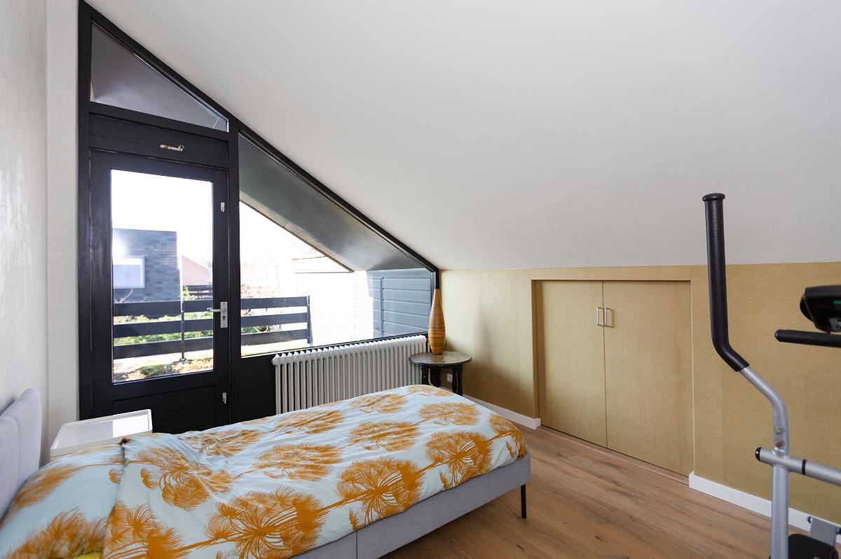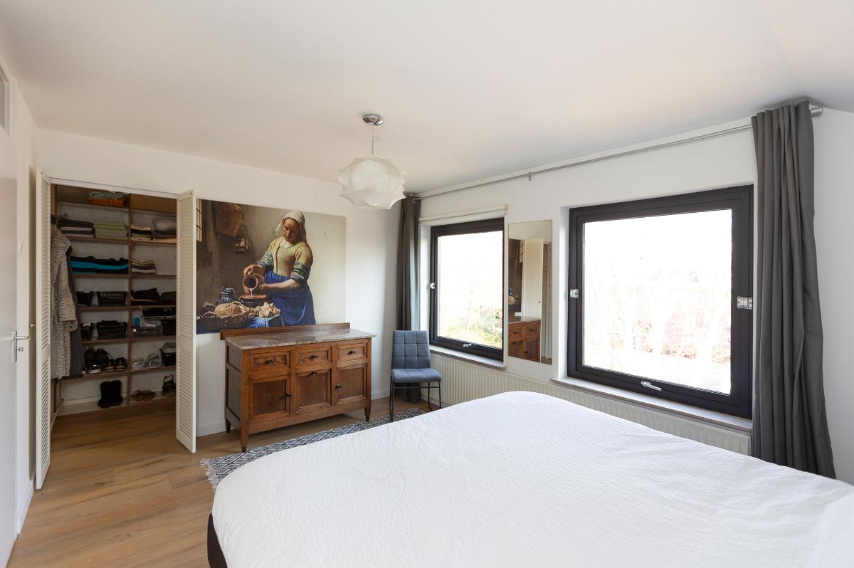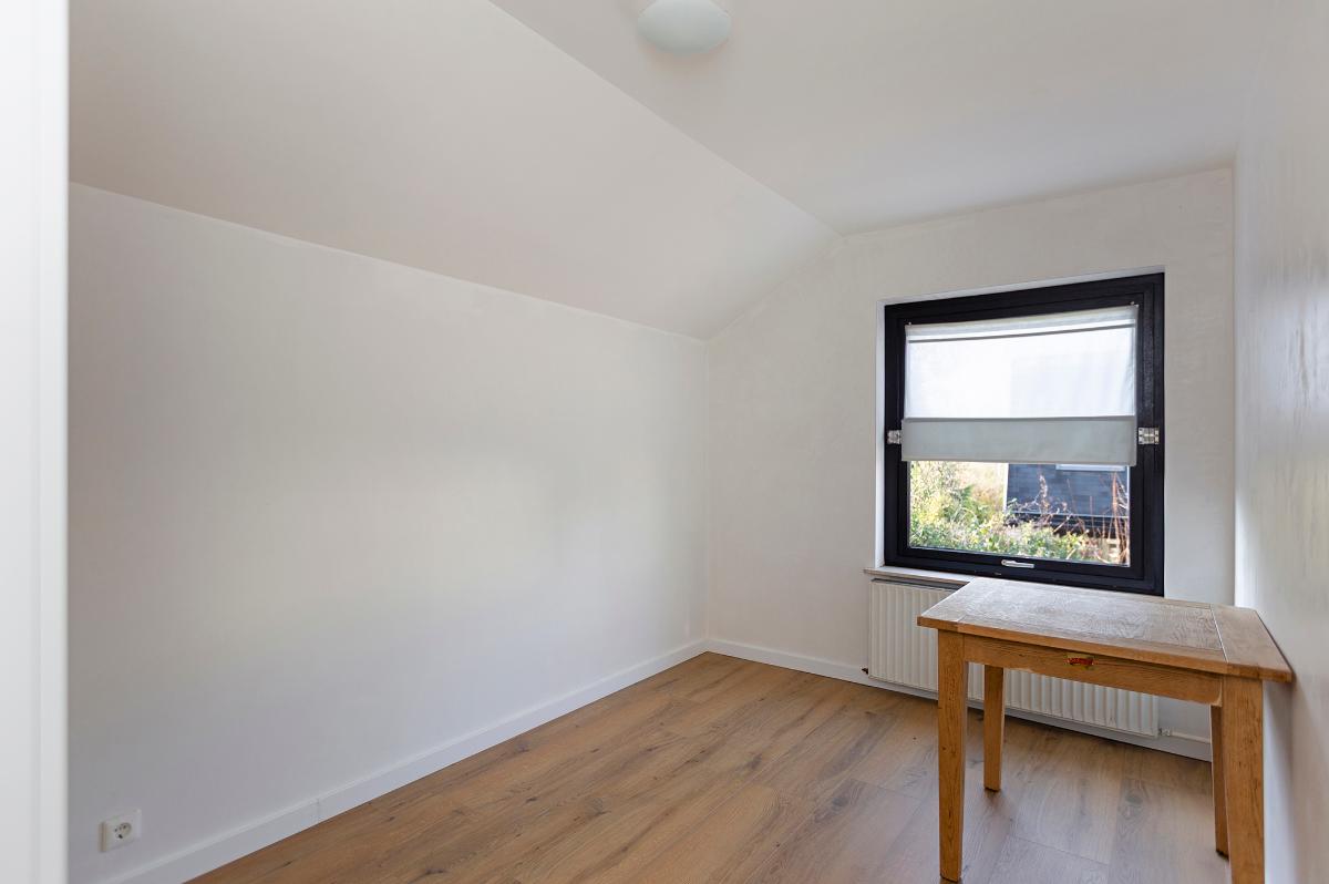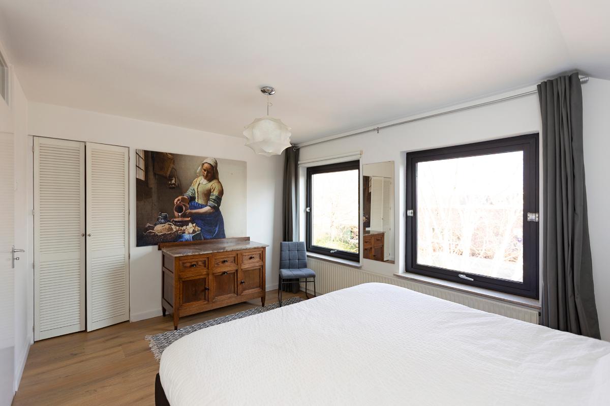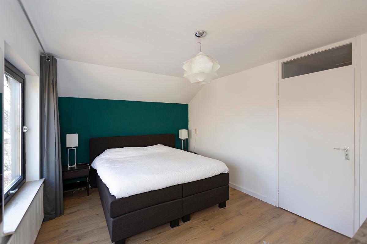 Eerste verdieping: Ruime overloop, kast met opstelplaats combi ketel (Intergas HR combiketel uit 2016). Grote slaapkamer aan de voorzijde met een ruime inloopkast. De badkamer is vanaf de overloop bereikbaar en is voorzien van een inloop douche, 2e toilet, wastafel, design radiator en Velux dakraam. Tweede slaapkamer aan de voorzijde (boven de garage) met bergruimte. 3 slaapkamers aan de achterzijde waarvan 1 met toegang tot het dakterras/balkon met eveneens een grote bergruimte. De slaapkamer aan de achterzijde die grenst aan de badkamer is thans in gebruik als waskamer omdat hier ook de aansluitpunten voor de wasmachine en droger zijn gemaakt. Vanaf de overloop is een luik met Vlizotrap naar de flinke, deels bevloerde flinke bergzolder met een stahoogte van 1,76m onder de nok.