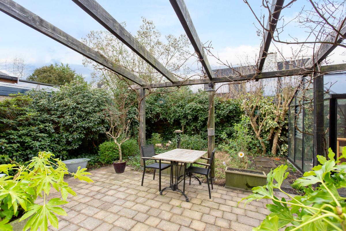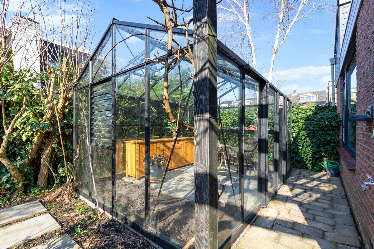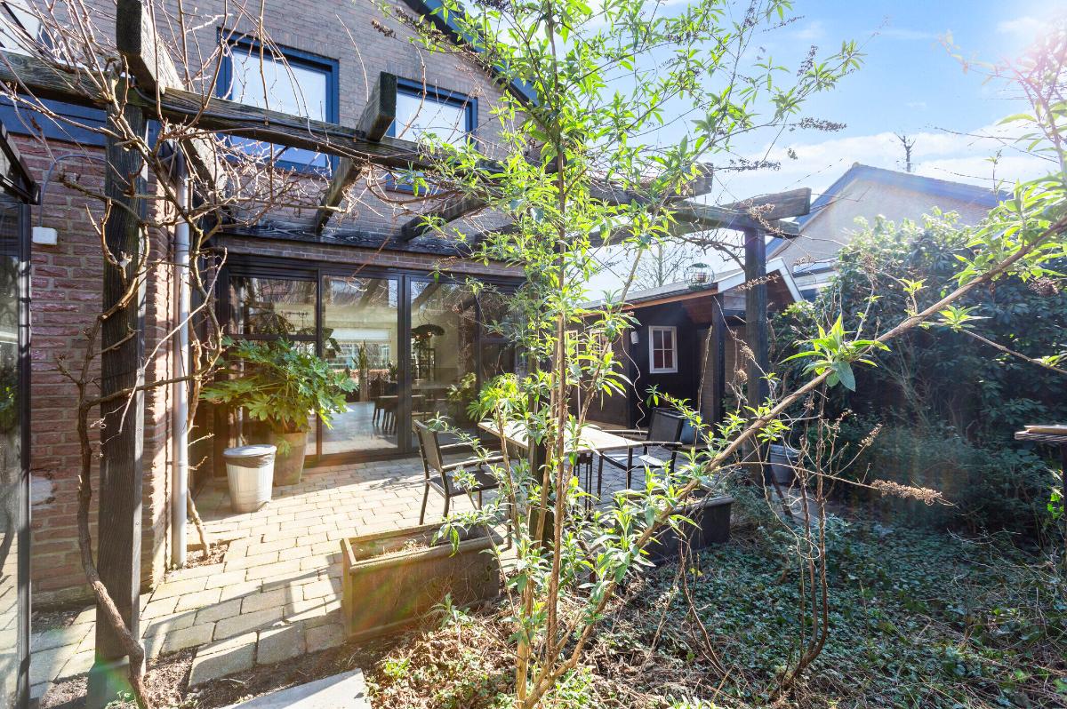 Buiten: Een heerlijke volop privacy biedende achtertuin welke op het zuidwesten is gesitueerd en waar de zijtuin op het zuiden ligt. Er is een glazen kas (ter overname) en een houten tuinhuis met een kleine veranda.
