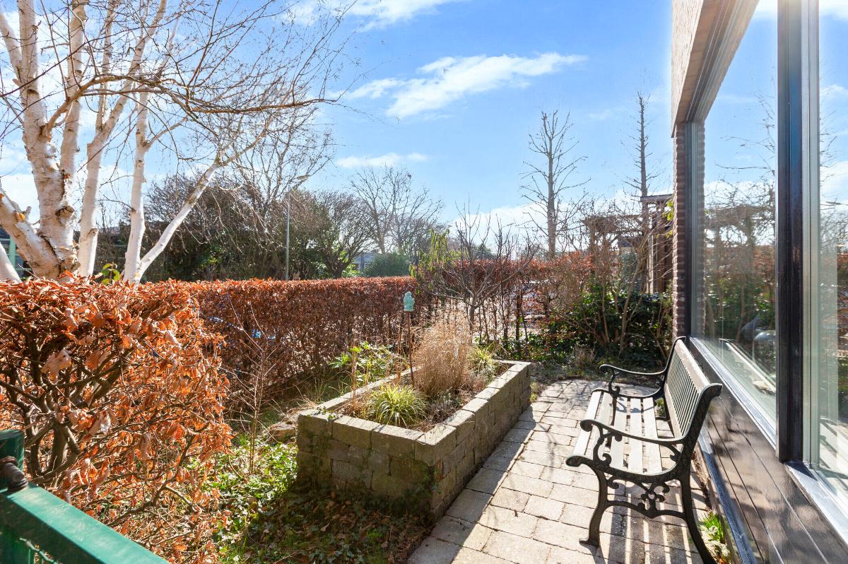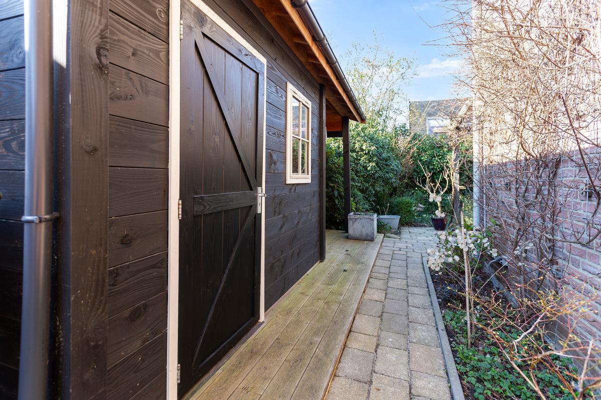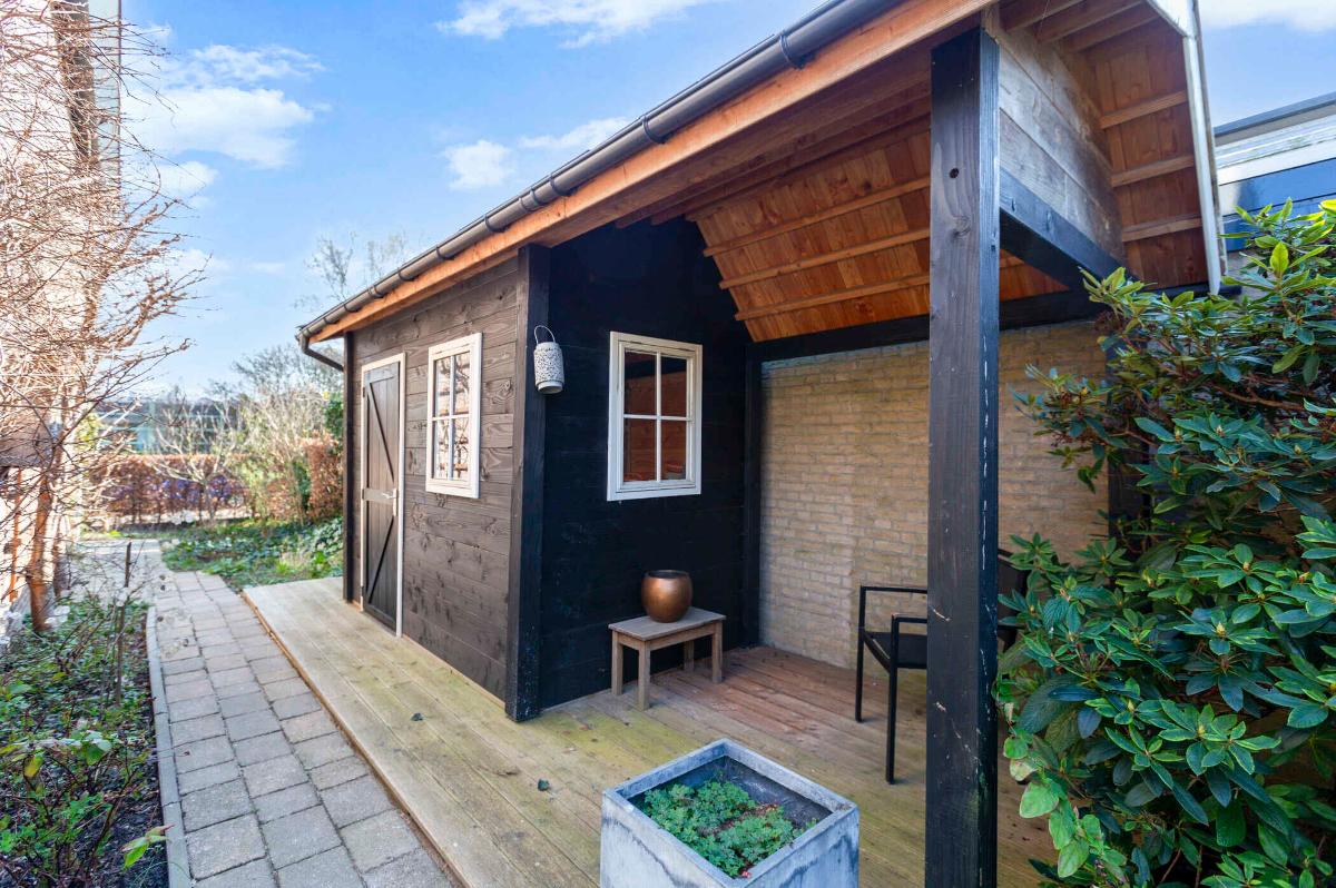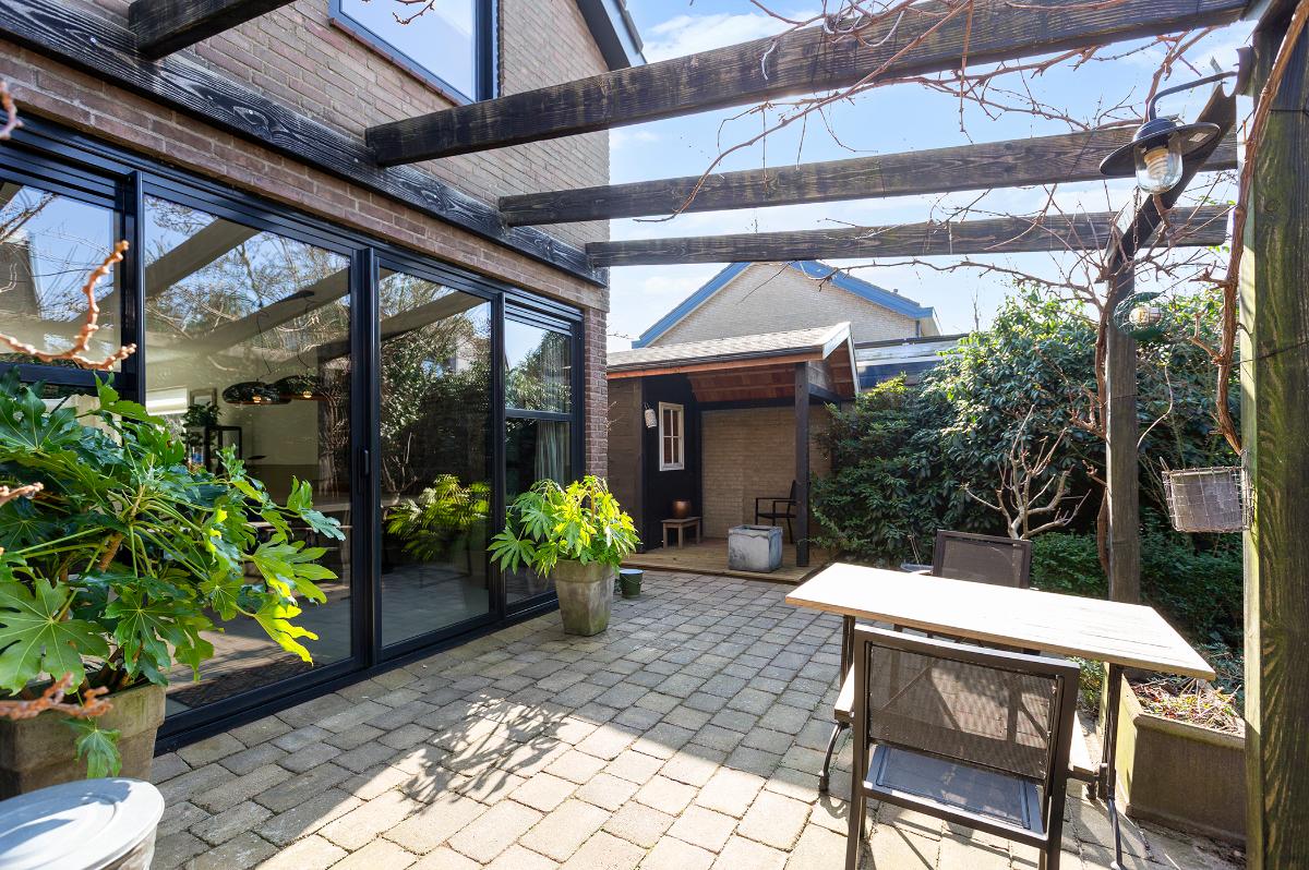 Buiten: Een heerlijke volop privacy biedende achtertuin welke op het zuidwesten is gesitueerd en waar de zijtuin op het zuiden ligt. Er is een glazen kas (ter overname) en een houten tuinhuis met een kleine veranda.