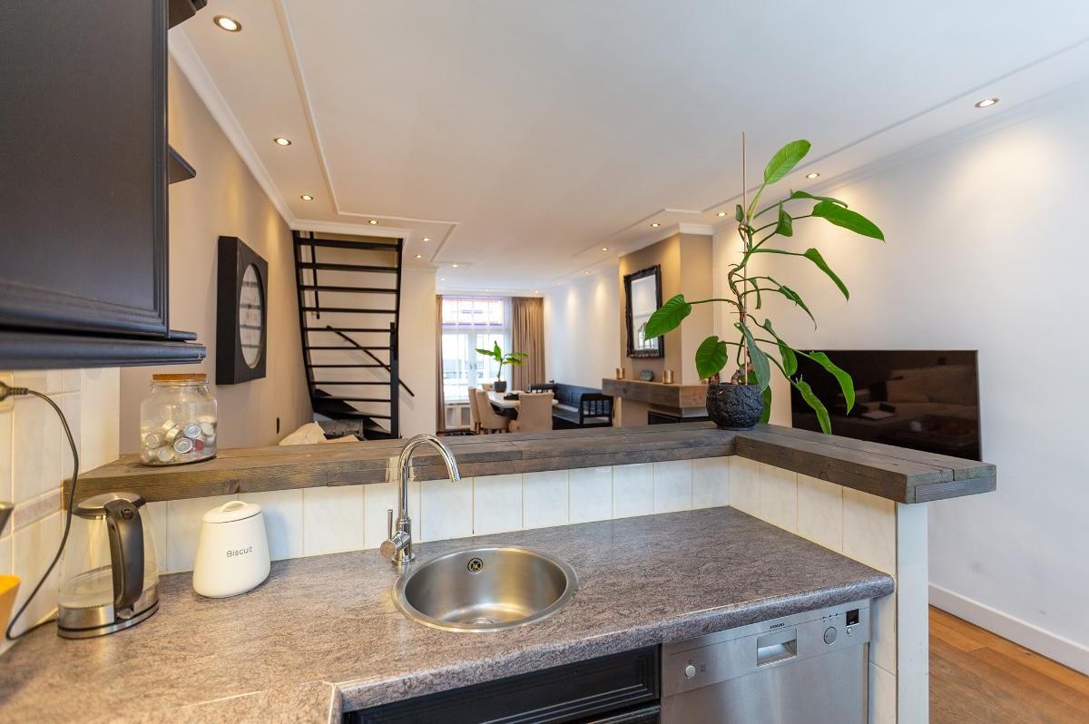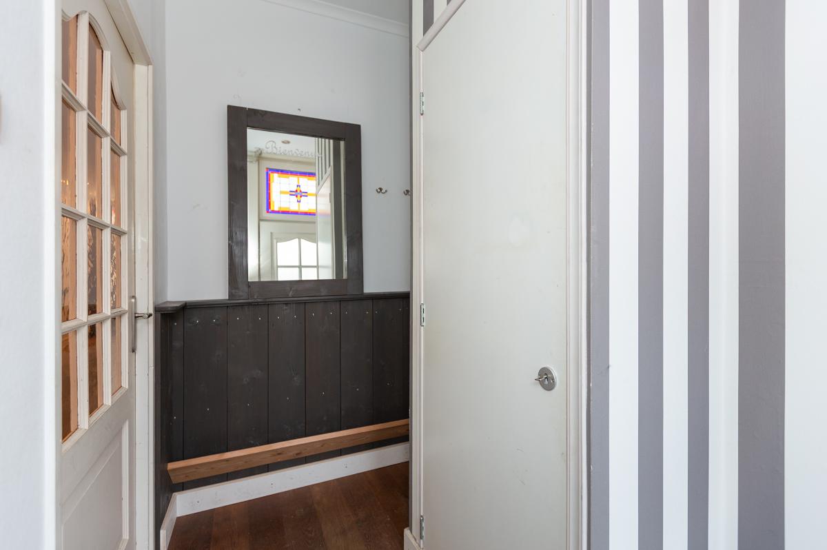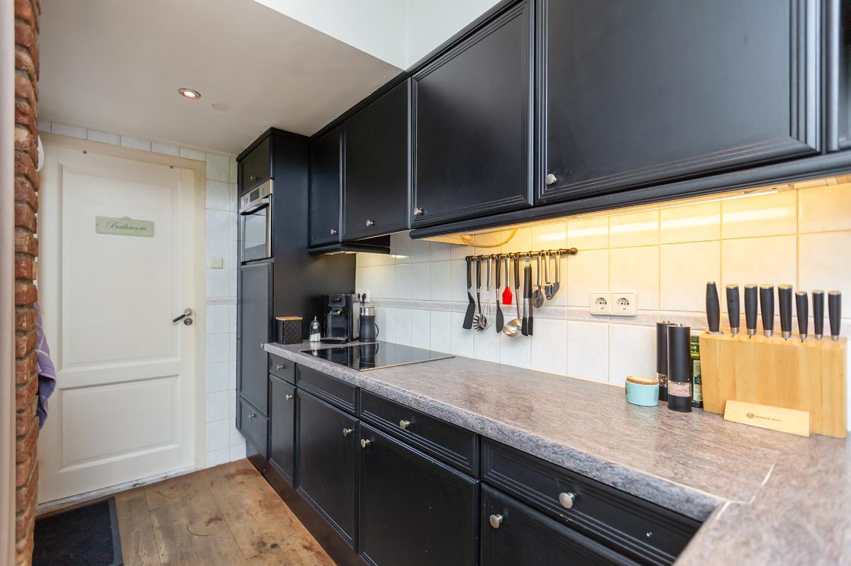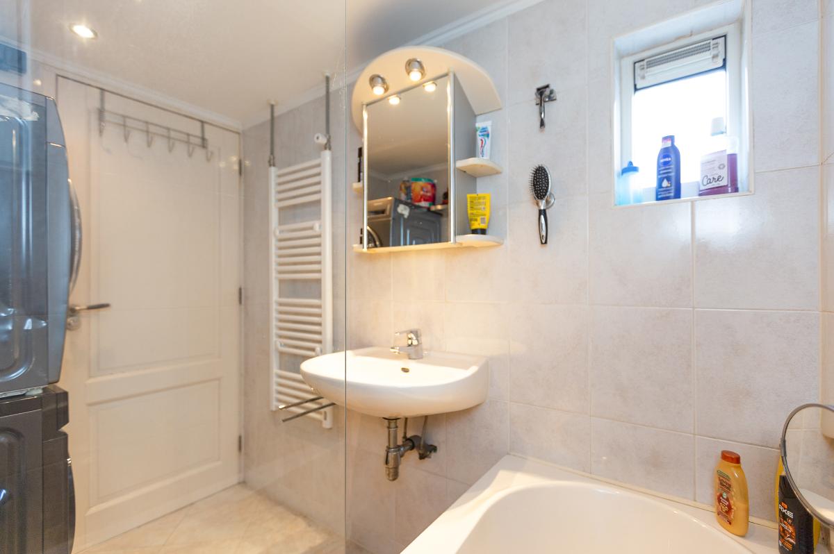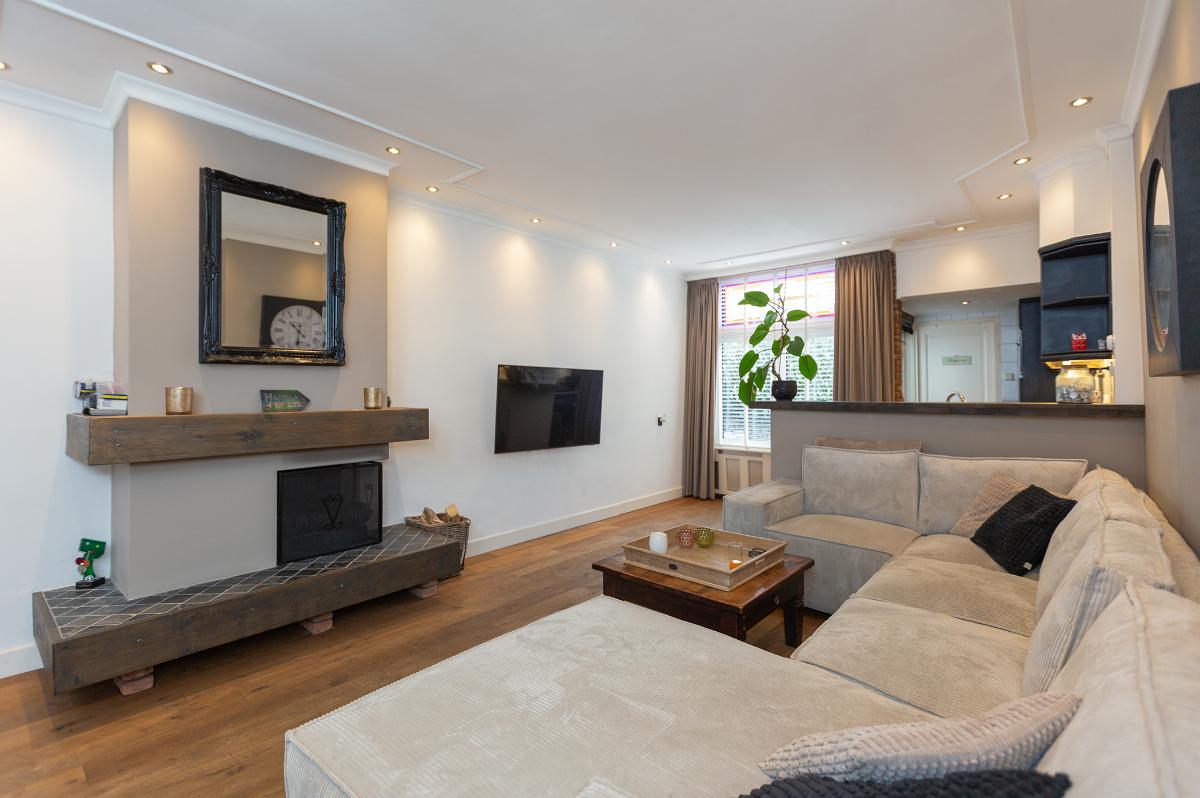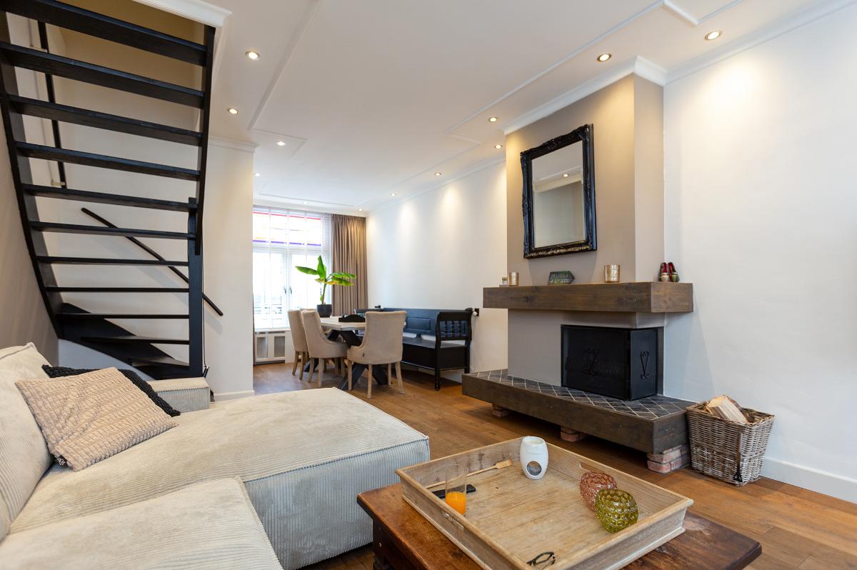 Begane grond: Entree, hal met garderobe-nis en meterkast (6 groepen + aardlekschakelaar). Ruime living van ca. 35 m² met een sfeervolle, werkende openhaard en zowel aan de voor- als achterzijde glas-in-lood in de bovenlichten. De gehele benedenverdieping is afgewerkt met een eiken lamellen parketvloer. Aan de achterzijde van de woning treft u de keuken en de badkamer. De half open keuken is in een hoek opgesteld en voorzien van een keramische 4-pits kookplaat, afzuigkap, koelkast, combimagnetron en vaatwasmachine en heeft door het haaks geplaatste aanrecht toch een verbinding met de woonkamer. Aangrenzend de badkamer met een ligbad/douche, wastafel, vrij hangend toilet en designradiator. Ook is de badkamer voorzien van vloerverwarming en aansluitingen voor de was/droog apparatuur.