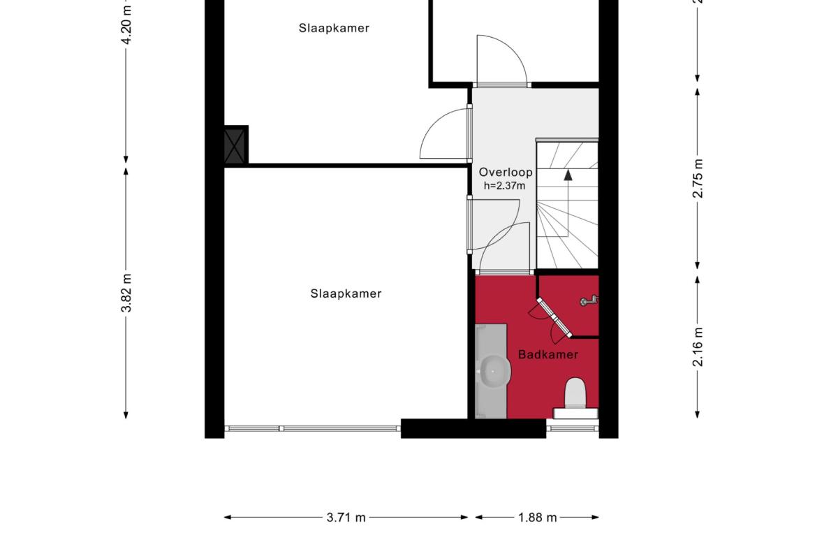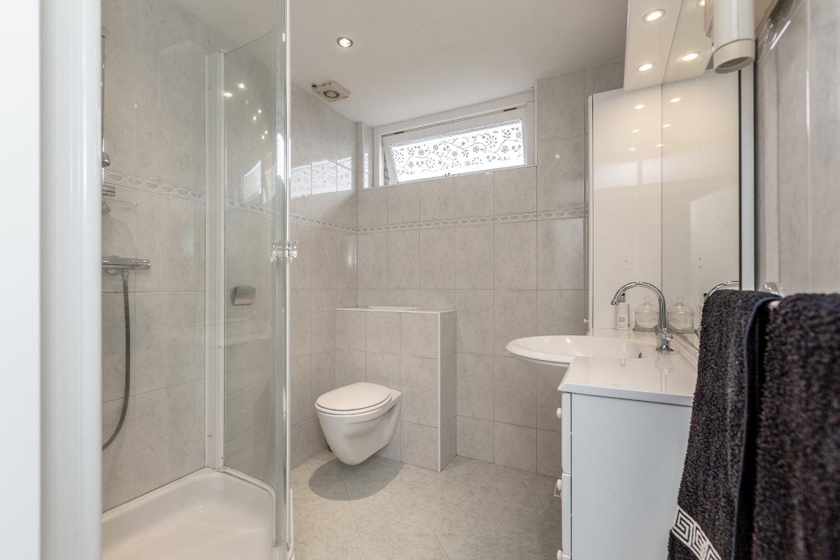1e verdieping: Hier is de overloop met de toegang tot de 3 fijne slaapkamers. De badkamer heeft eveneens een prettige maatvoering en is voorzien van een douchecabine, 2e toilet en een wastafelmeubel.