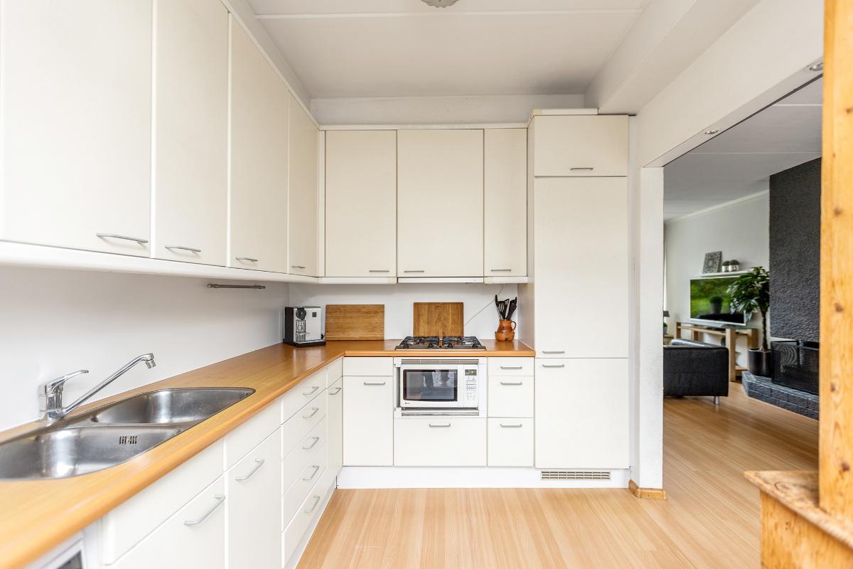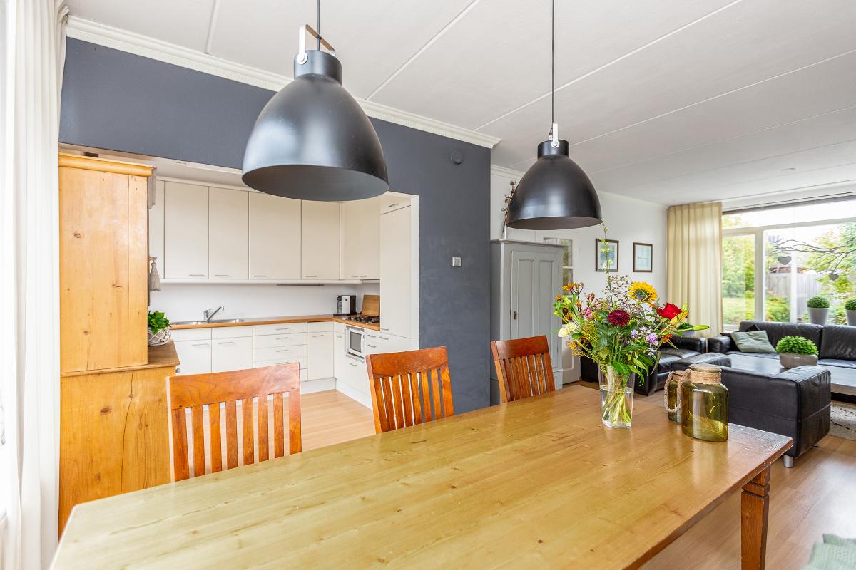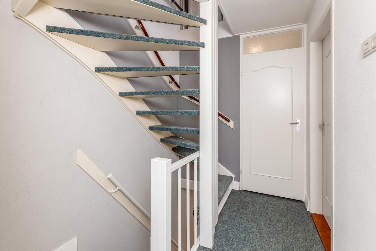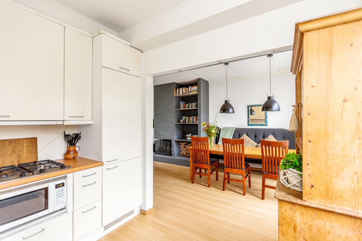 Begane grond: Ruime gang met meterkast en bergkast, extra kastruimte onder de trap naar de verdieping, waar ook de toiletruimte is gemaakt. De lichte en ruime woonkamer is voorzien van een laminaatvloer en van grote ramen waardoor er veel prettig daglicht binnenkomt. Er is een open haard voor heerlijk warme en sfeervolle avonden. Doorgang naar de open keuken welke in een hoekopstelling is geplaatst en is voorzien van een ingebouwde gaskookplaat, afzuigkap, combi magnetron, vaatwasmachine, koel-vrieskast en naast diverse kastjes is er ook een carrouselkast. Deur naar de tuin.