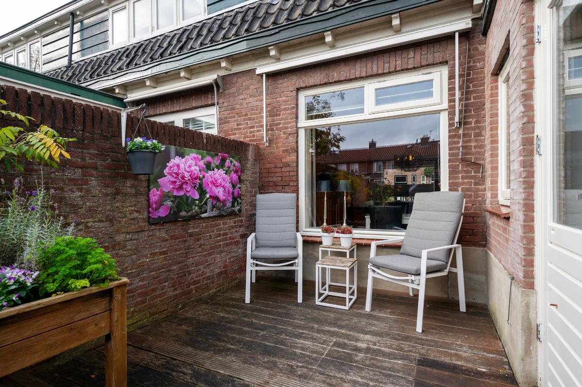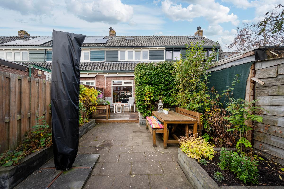 Achtertuin: Een heerlijke, diepe achtertuin van bijna 14 meter op het zuidoosten waar je kunt genieten van de geborgenheid die deze plek met zich meebrengt. Er staat een vrijstaande houten berging met veranda en er is een achterom. De bouwstijl van de berging in combinatie met de woning en de sfeervolle tuinaanleg ademen rust en gezelligheid uit.