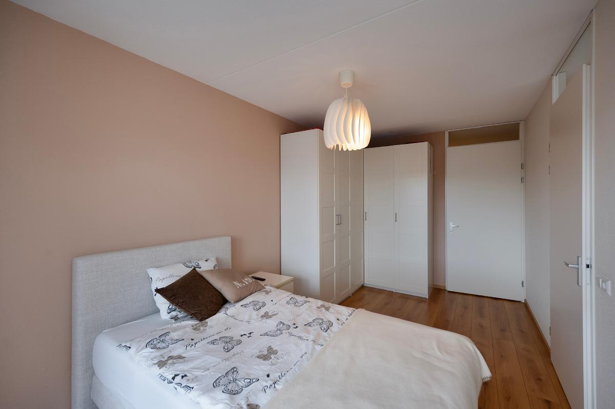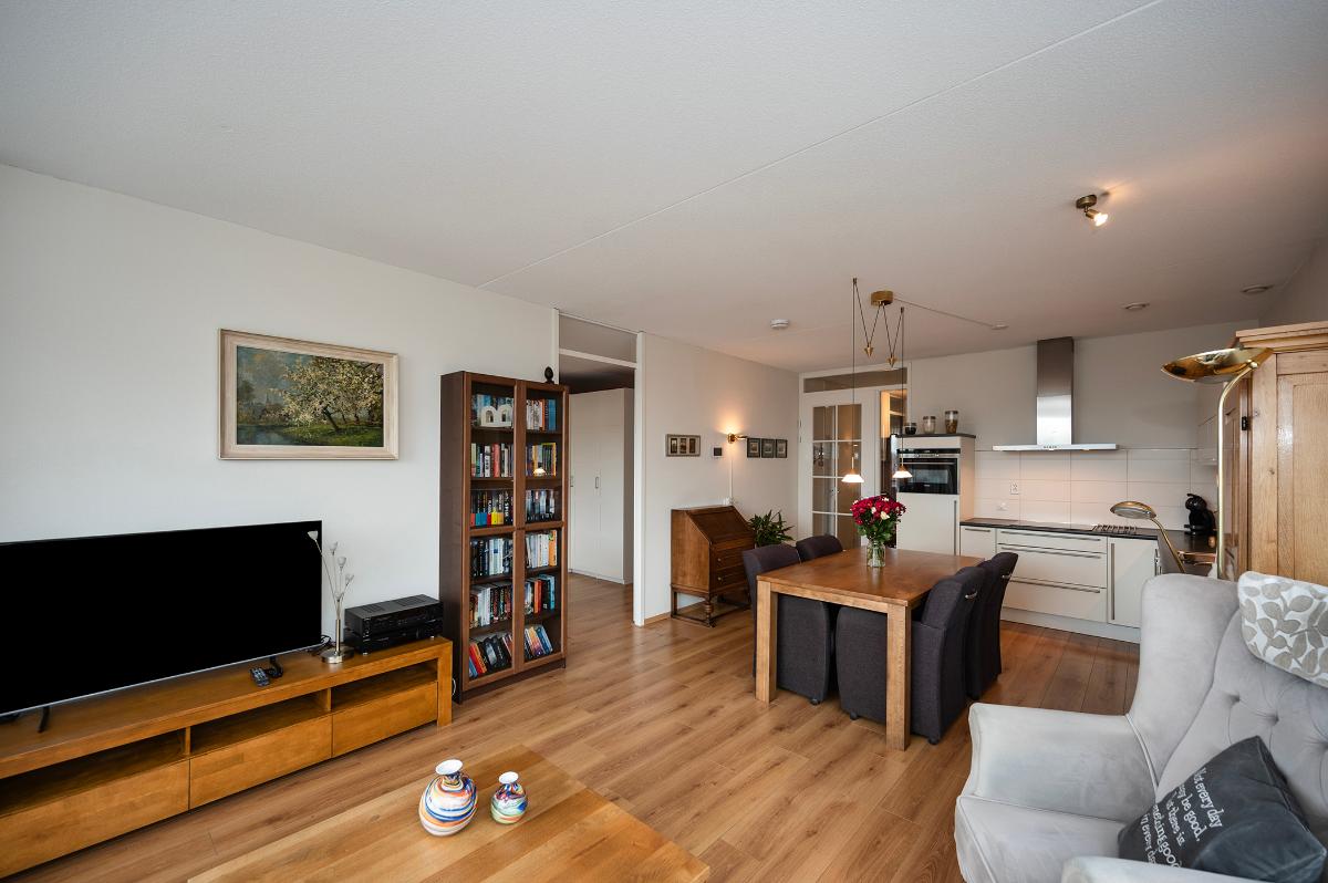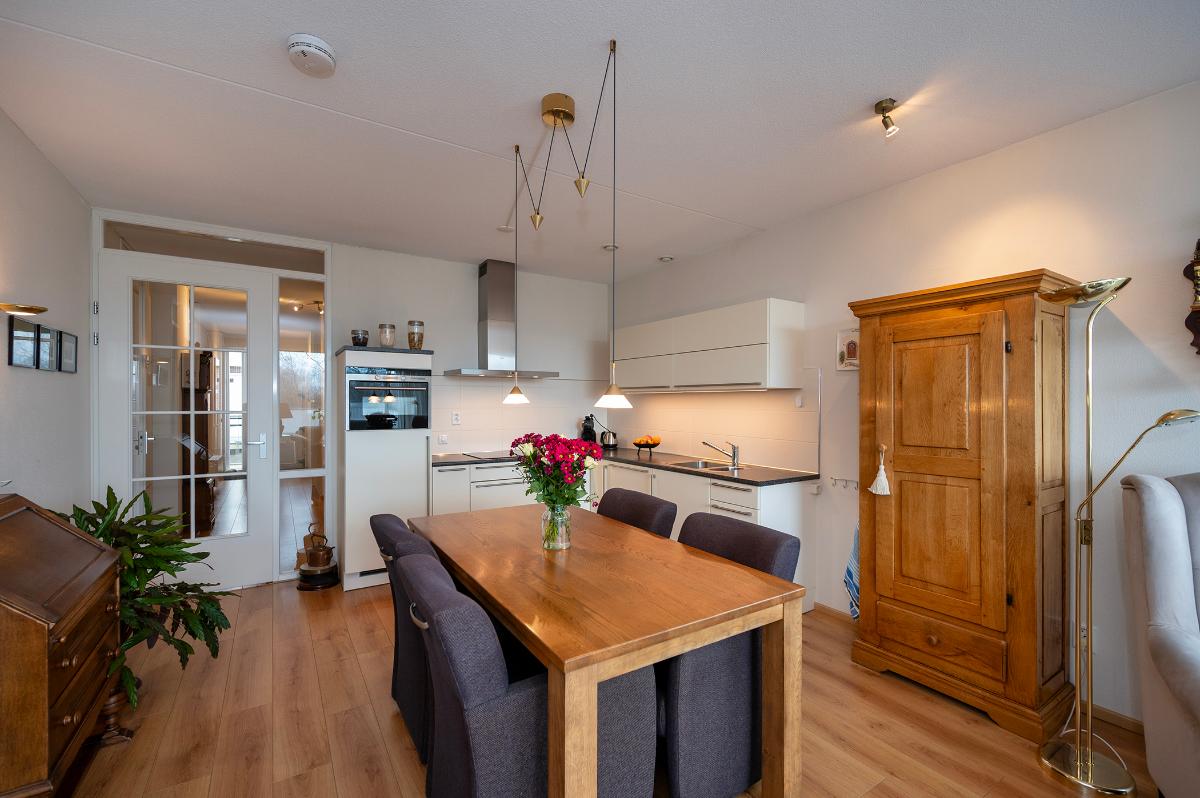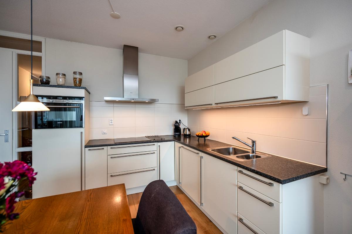 Wonen op de derde woonlaag (2e verdieping): Entree van de woning, brede gang met een moderne meterkast met voldoende groepen, een toilet met fonteintje, 2 slaapkamers aan de galerij-zijde, een bergkast met de opstelplaats voor de cv ketel (Intergas HR combi ketel uit 2025) en aansluitpunt voor de wasmachine en droger. De ruime badkamer is voorzien van een 2e toilet, wastafel meubel alsmede een inloop douche. Zowel vanuit de woonkamer als de badkamer is de toegang tot de 3e slaapkamer. Deze ruimte heeft een deur naar het balkon/terras. De lichte en prettige woonkamer heeft mede vanwege het zij-raam een fraai en ver uitzicht door de Willem de Zwijgerstraat. In het woongedeelte is eveneens een deur naar het balkon/terras. De keuken is geïntegreerd in de woonkamer en is voorzien van een ingebouwde koelkast, combi magnetron, inductie kookplaat, afzuigkap (recirculatie), vaatwasser en carrousel kast .