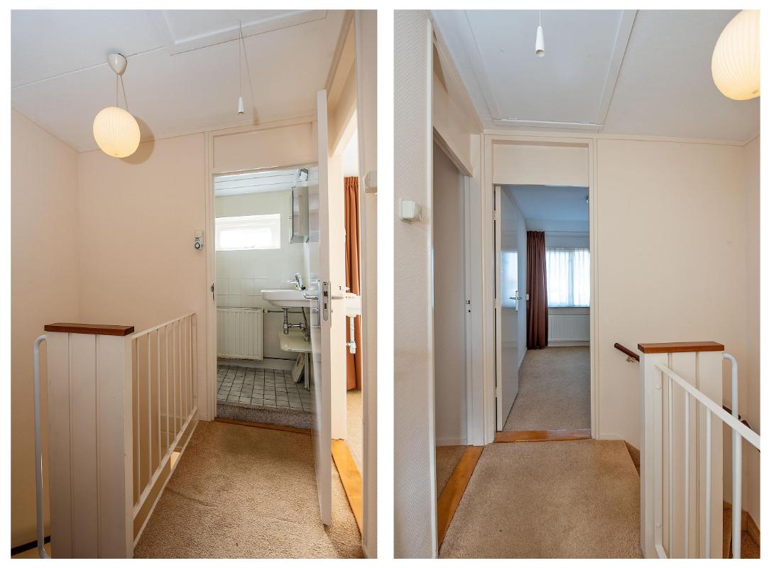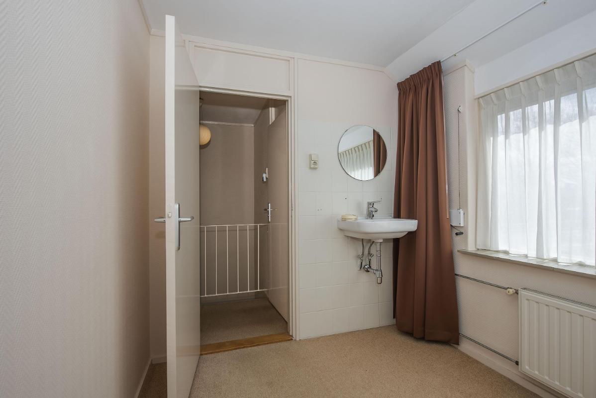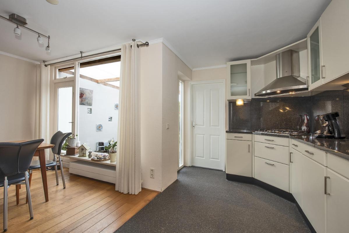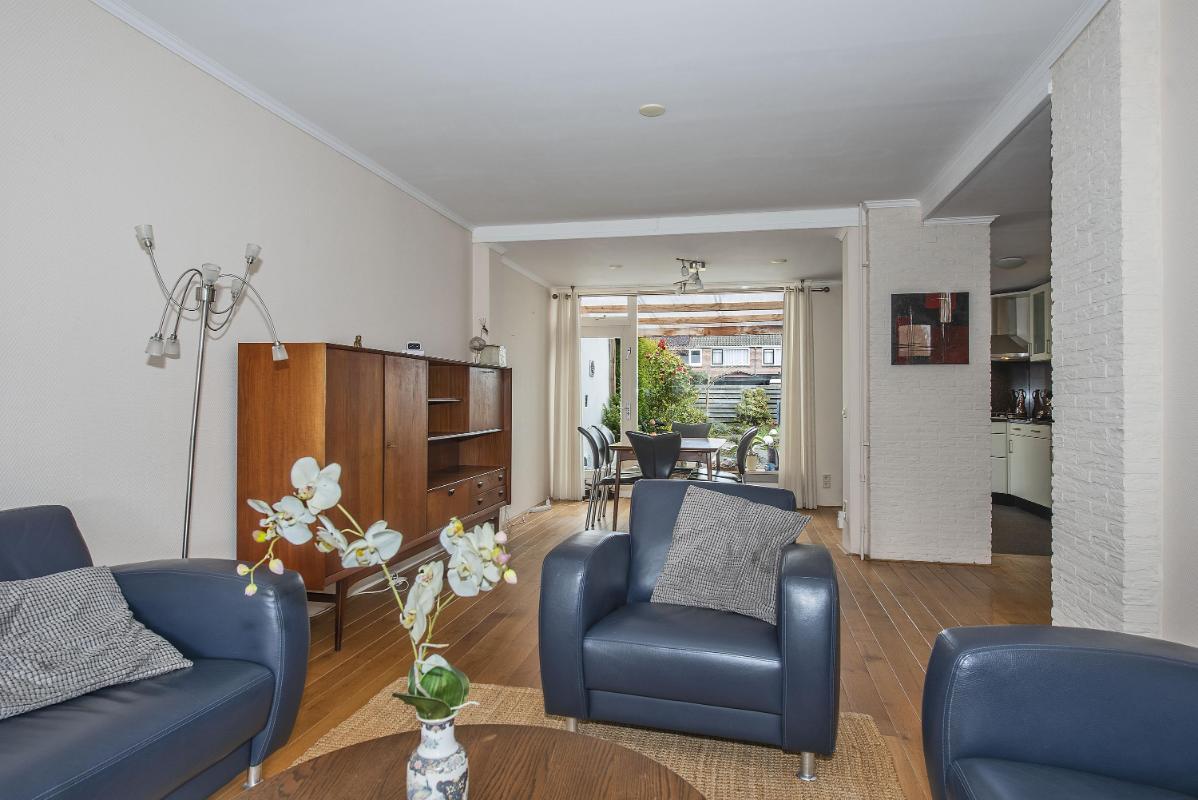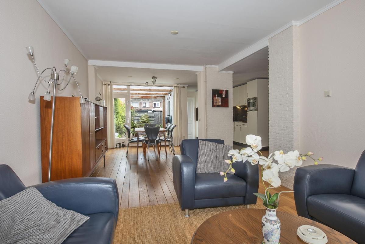 Indeling: Begane grond: entree, toilet met fontein, meterkast en praktische trap-/provisiekast, uitgebouwde woonkamer voorzien van een fraaie parketvloer, eethoek met deur naar de tuin/overkapping, open keuken voorzien van 4-pits gaskookplaat, afzuigkap, combi- oven/magnetron, koelkast en vaatwasser, bijkeuken met cv-opstelling en opstelling wasapparatuur, en toegang tot achtertuin. 1e verdieping: overloop, 3 slaapkamers allen voorzien van vaste bergruimte, waarvan de slaapkamer aan de voorzijde tevens beschikt over een wastafel en rolluik, eenvoudige doucheruimte met douche en wastafel. Zolder: middels vlizotrap bereikbare bergzolder.