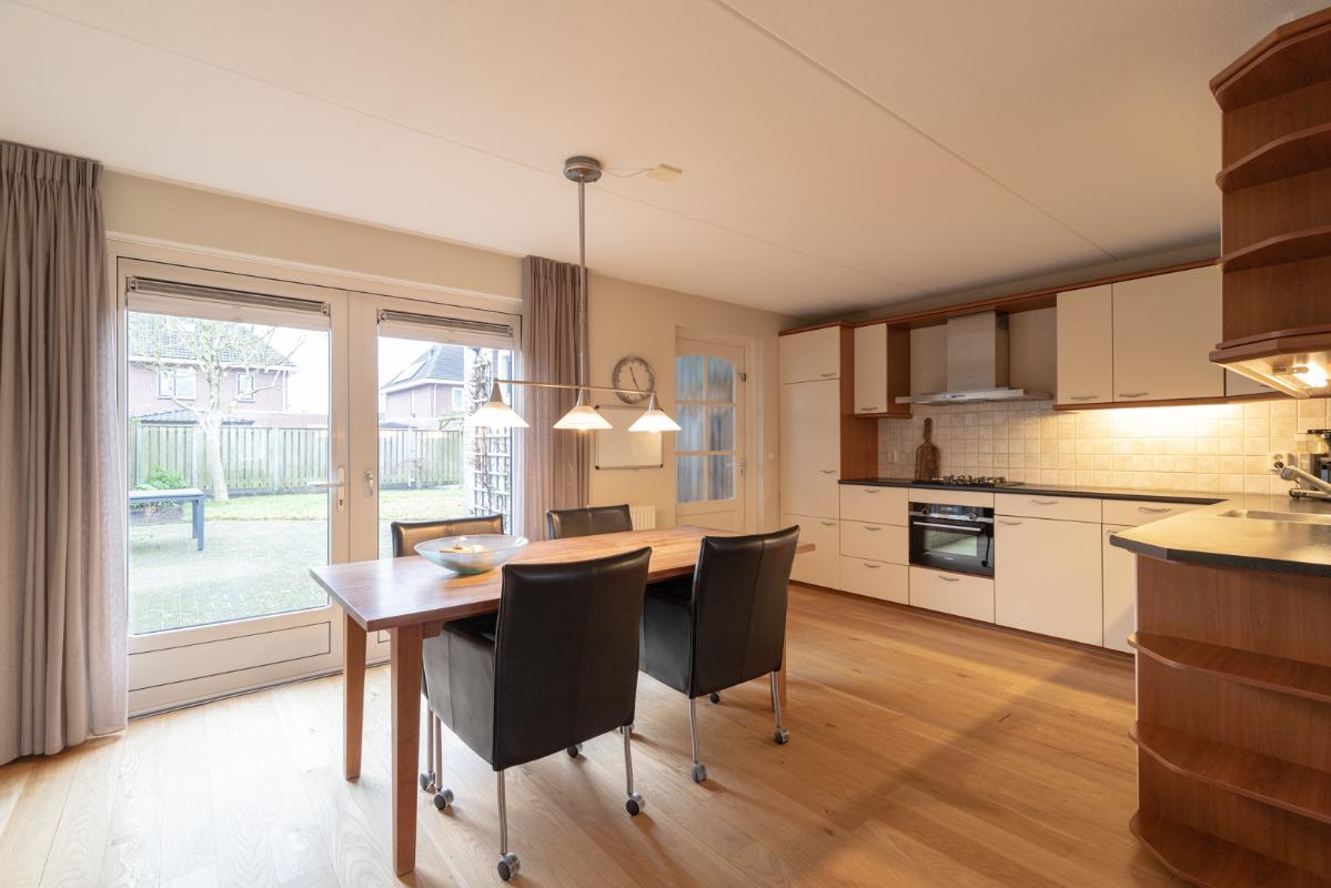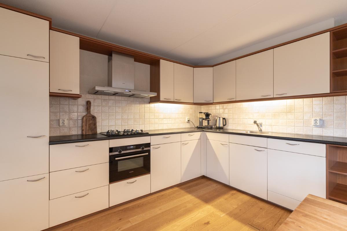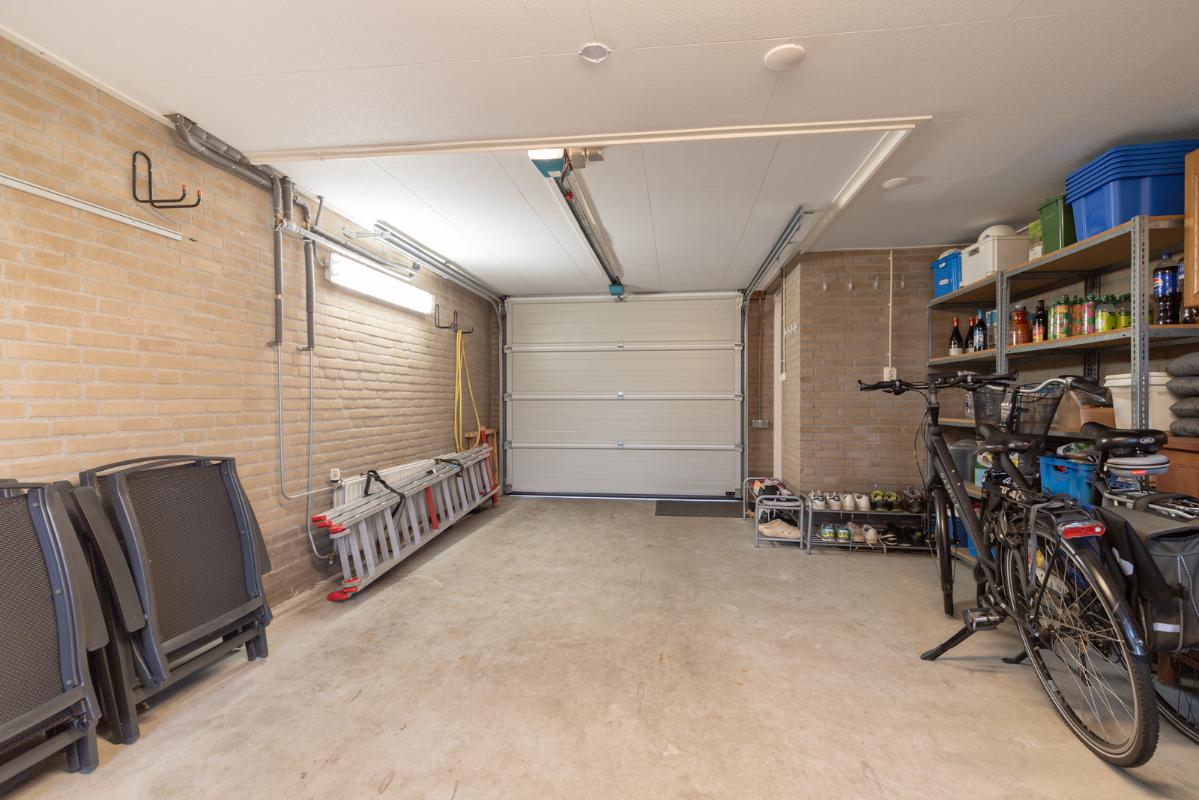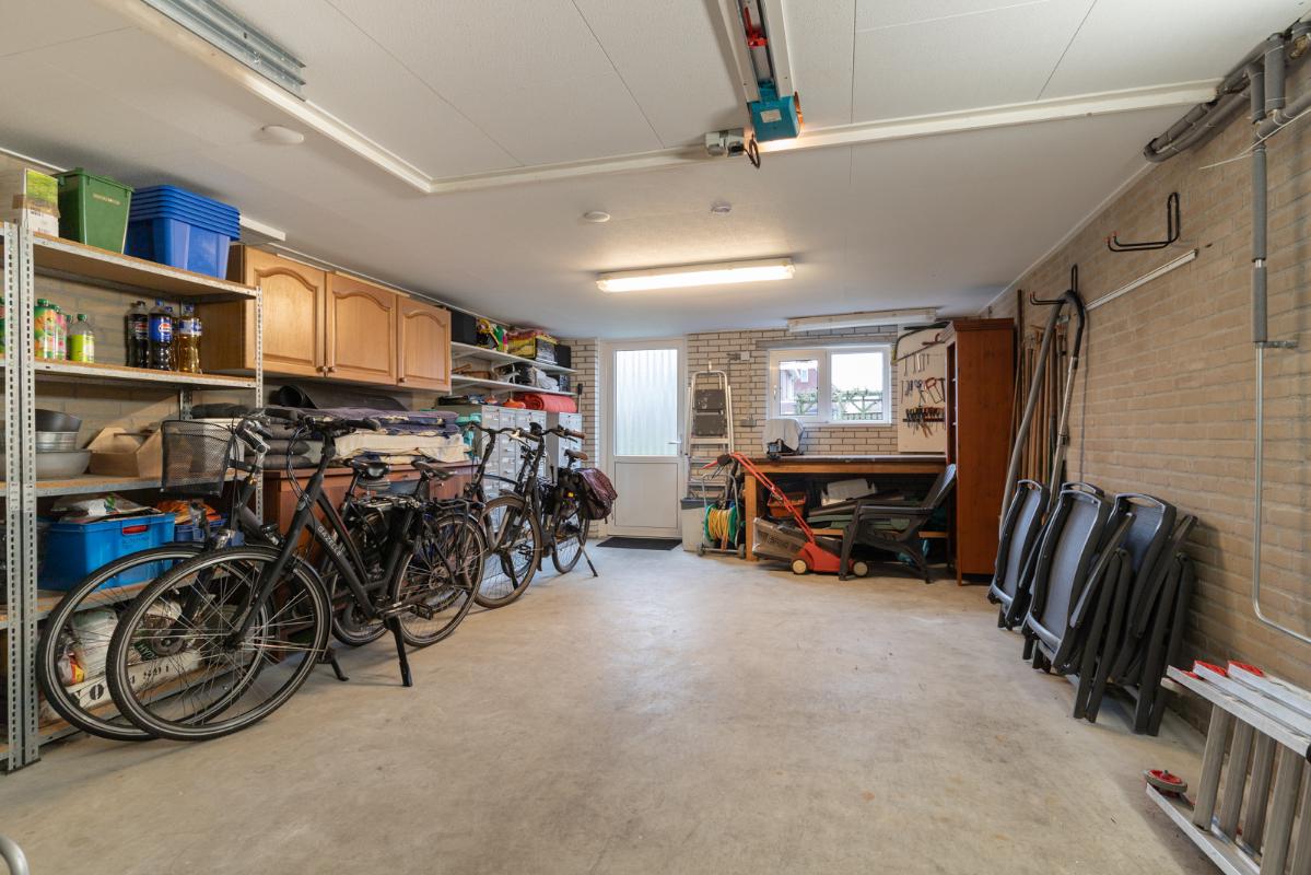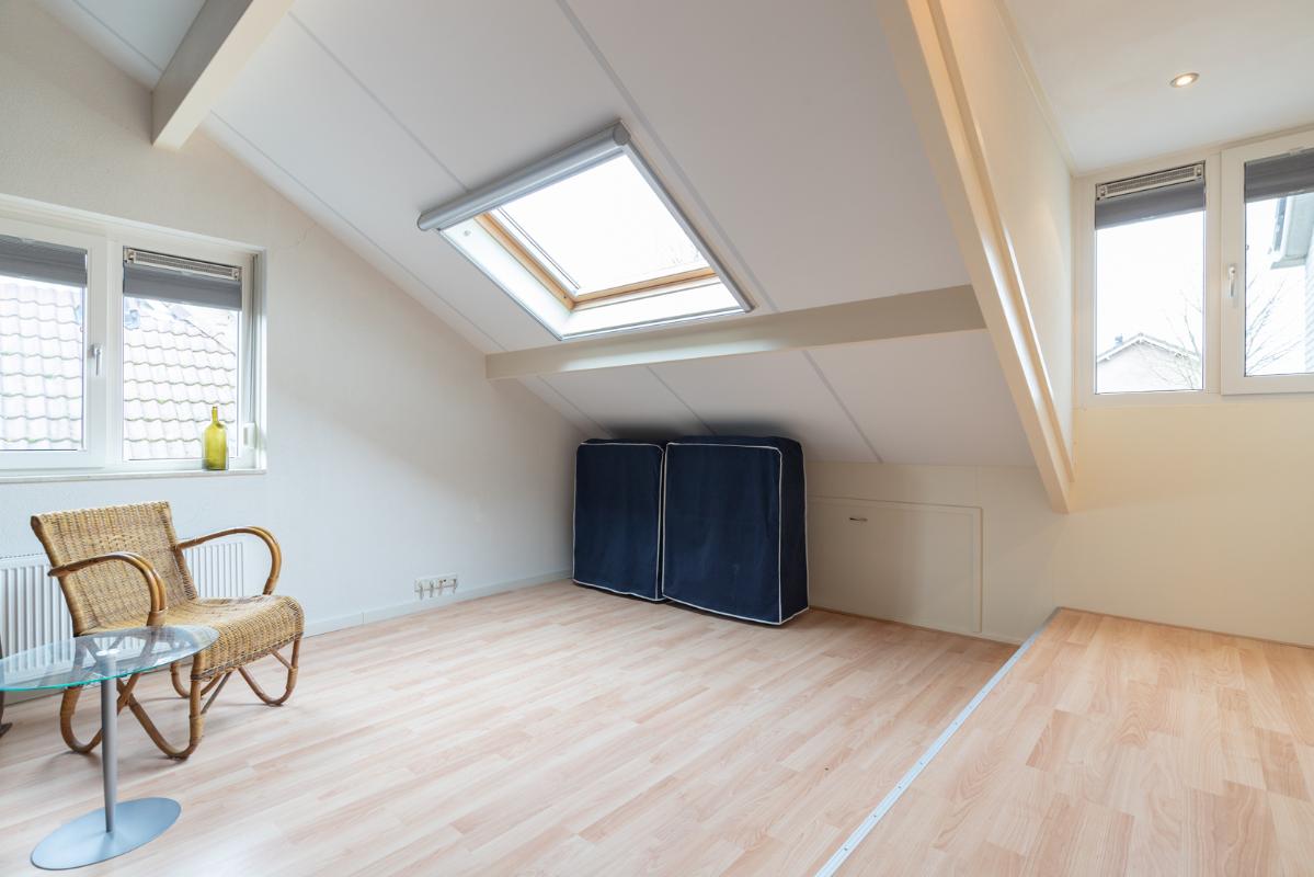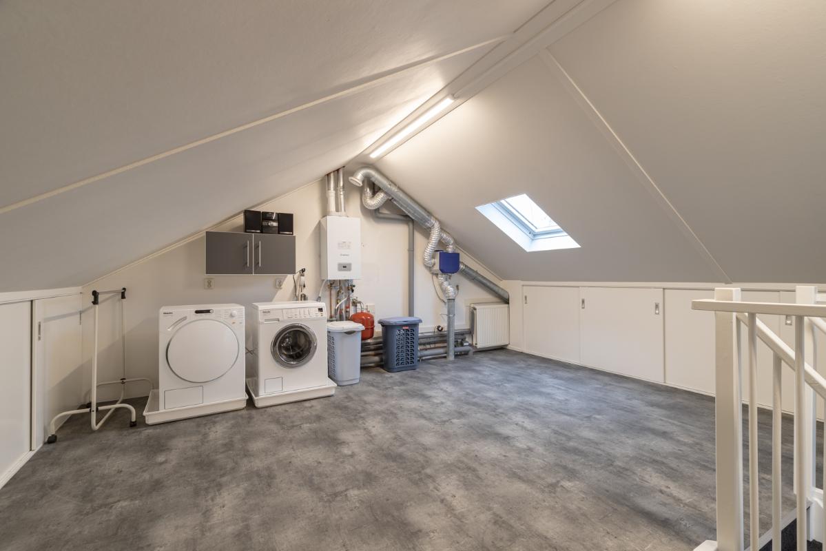 INDELING: Begane grond: overdekte entree/hal met toilet, garderobe en binnendoor naar de geïsoleerde garage; een royale L-vorm woonkamer met open keuken (circa 48m²) met openslaande deuren naar het terras en de tuin. De keurige en lichte keuken in hoekopstelling is voorzien van een gaskookplaat, afzuigschouw, koelkast, combi-oven (2021), vaatwasser (2021) en veel kastruimte. Direct naast de keuken toegang tot de bijkeuken met deur naar de tuin. Eerste verdieping: overloop, een eenvoudige maar nette badkamer (voorzien van ligbad, douche, wastafel en toilet) en 4 ruim bemeten slaapkamers (circa 28, 20, 12 en 8m²), waarvan de grootste met toegang tot het dakterras aan de tuinzijde. Tweede verdieping: via vaste trap te bereiken zolderverdieping (circa 28m² vloeroppervlakte) met Velux dakraam en extra bergruimte achter de knieschotten. Er is hier een uitstekende mogelijkheid om een 5e slaap-/werkkamer te realiseren.