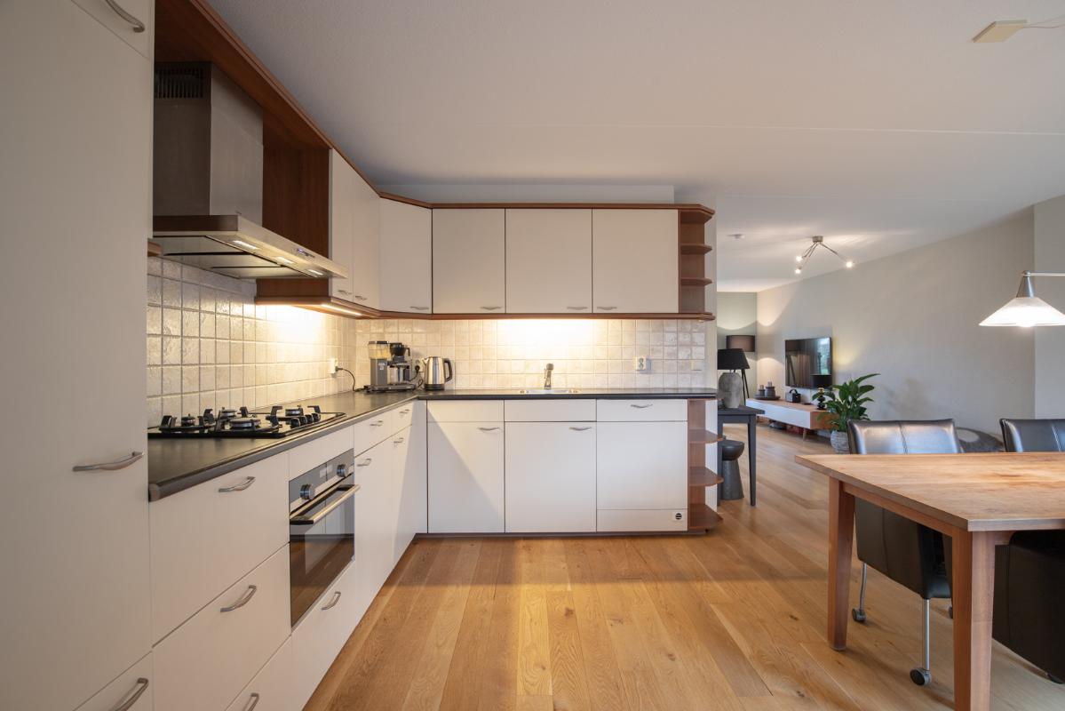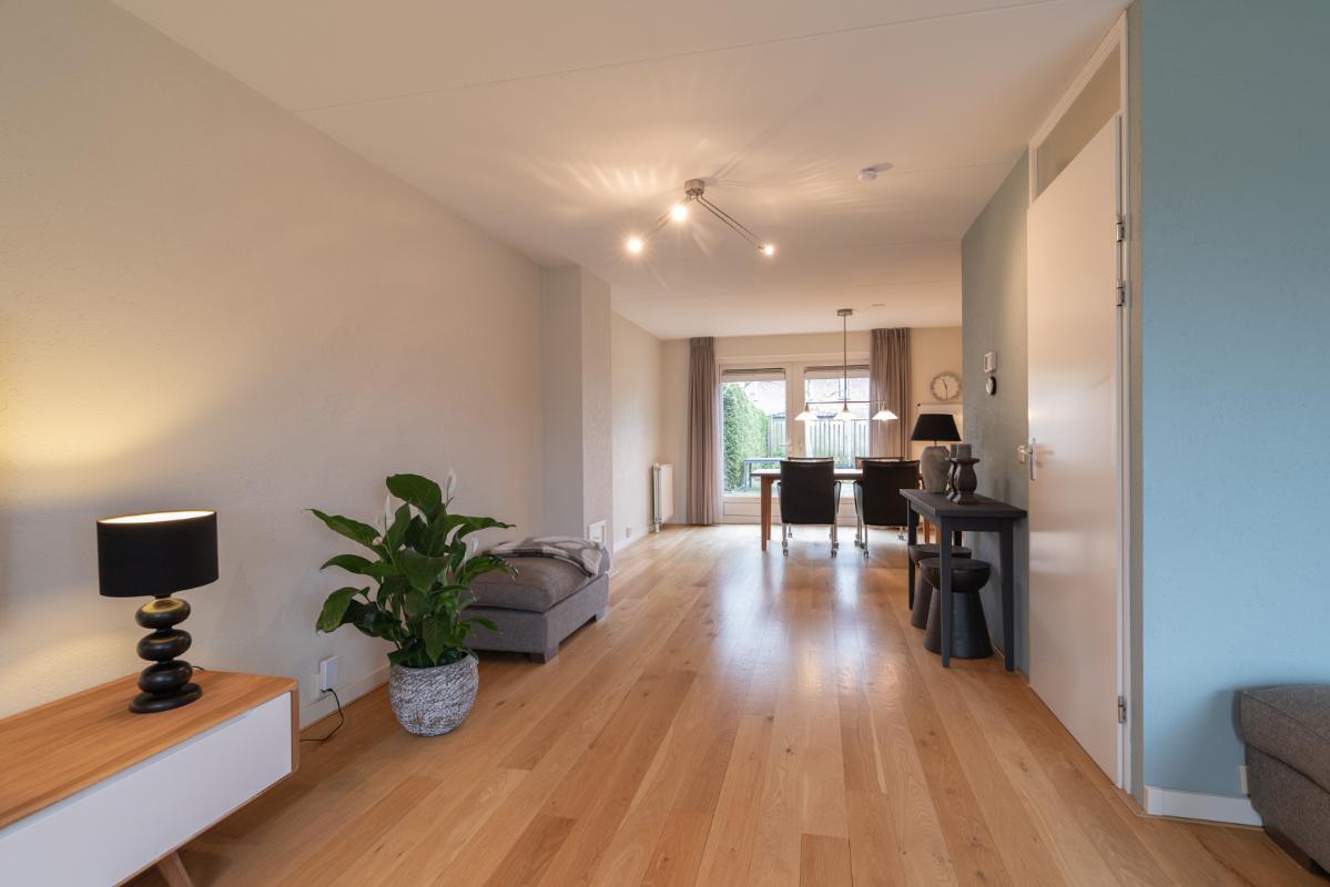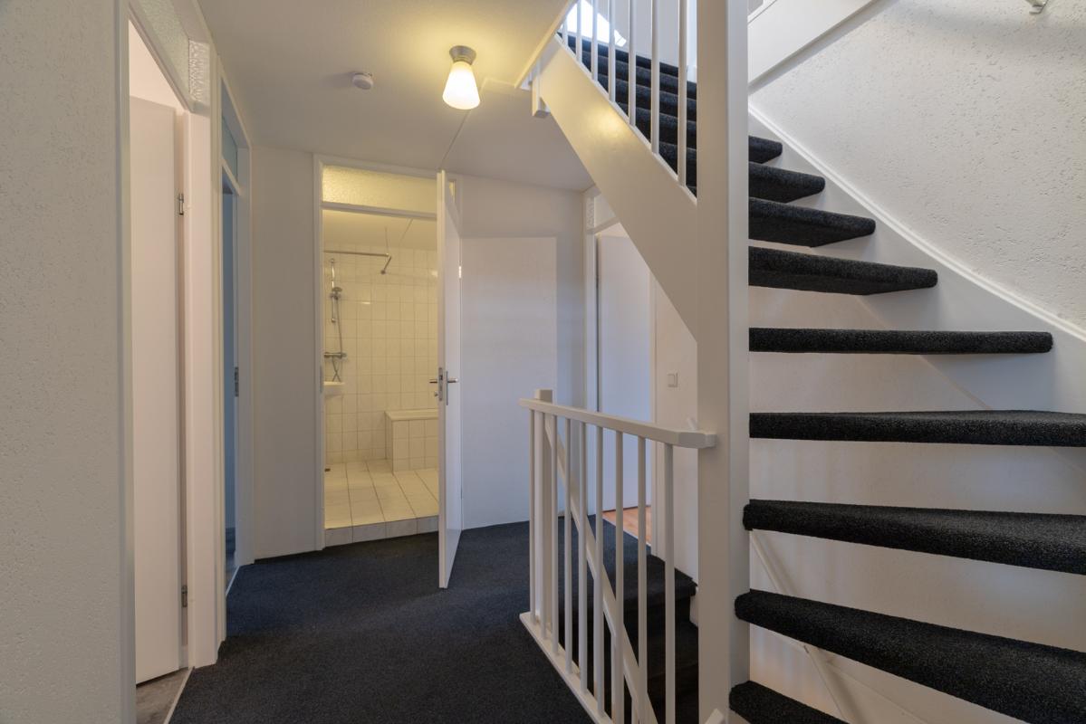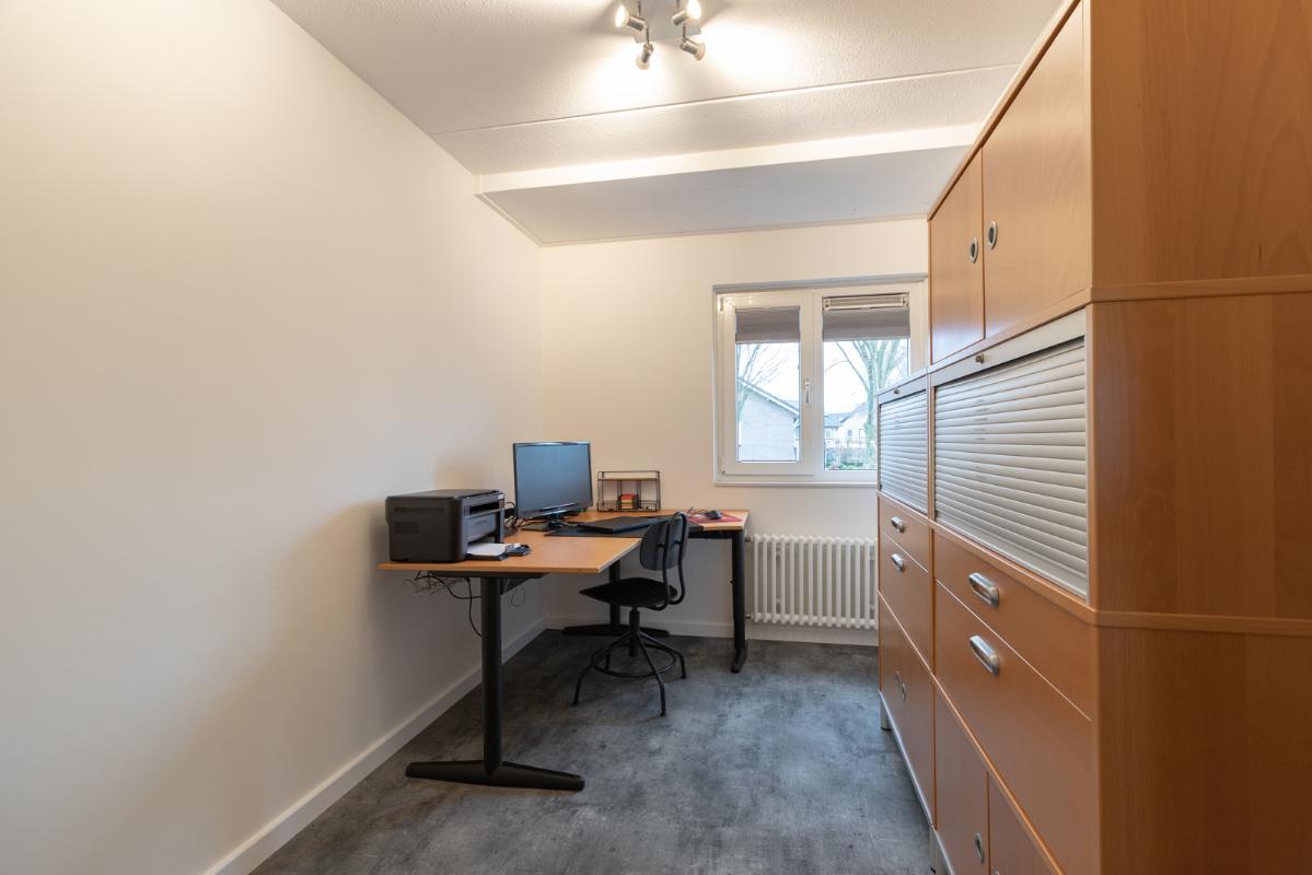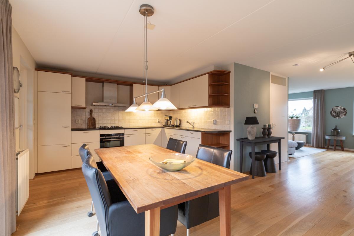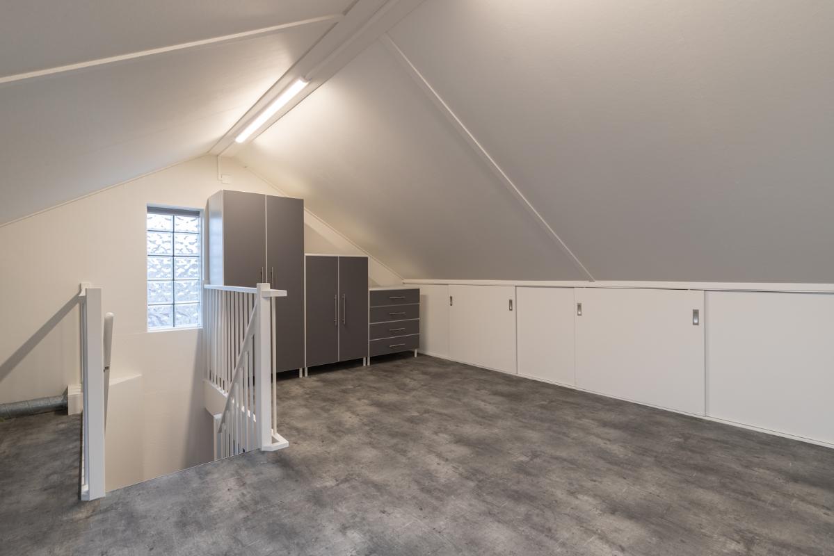 INDELING: Begane grond: overdekte entree/hal met toilet, garderobe en binnendoor naar de geïsoleerde garage; een royale L-vorm woonkamer met open keuken (circa 48m²) met openslaande deuren naar het terras en de tuin. De keurige en lichte keuken in hoekopstelling is voorzien van een gaskookplaat, afzuigschouw, koelkast, combi-oven (2021), vaatwasser (2021) en veel kastruimte. Direct naast de keuken toegang tot de bijkeuken met deur naar de tuin. Eerste verdieping: overloop, een eenvoudige maar nette badkamer (voorzien van ligbad, douche, wastafel en toilet) en 4 ruim bemeten slaapkamers (circa 28, 20, 12 en 8m²), waarvan de grootste met toegang tot het dakterras aan de tuinzijde. Tweede verdieping: via vaste trap te bereiken zolderverdieping (circa 28m² vloeroppervlakte) met Velux dakraam en extra bergruimte achter de knieschotten. Er is hier een uitstekende mogelijkheid om een 5e slaap-/werkkamer te realiseren.