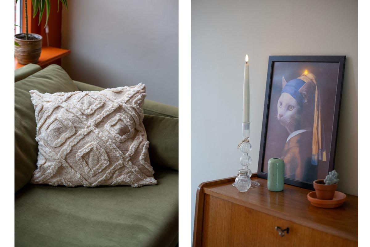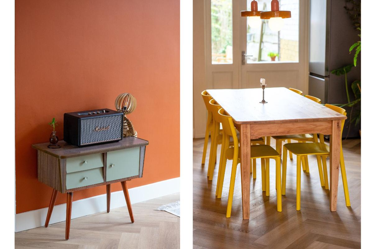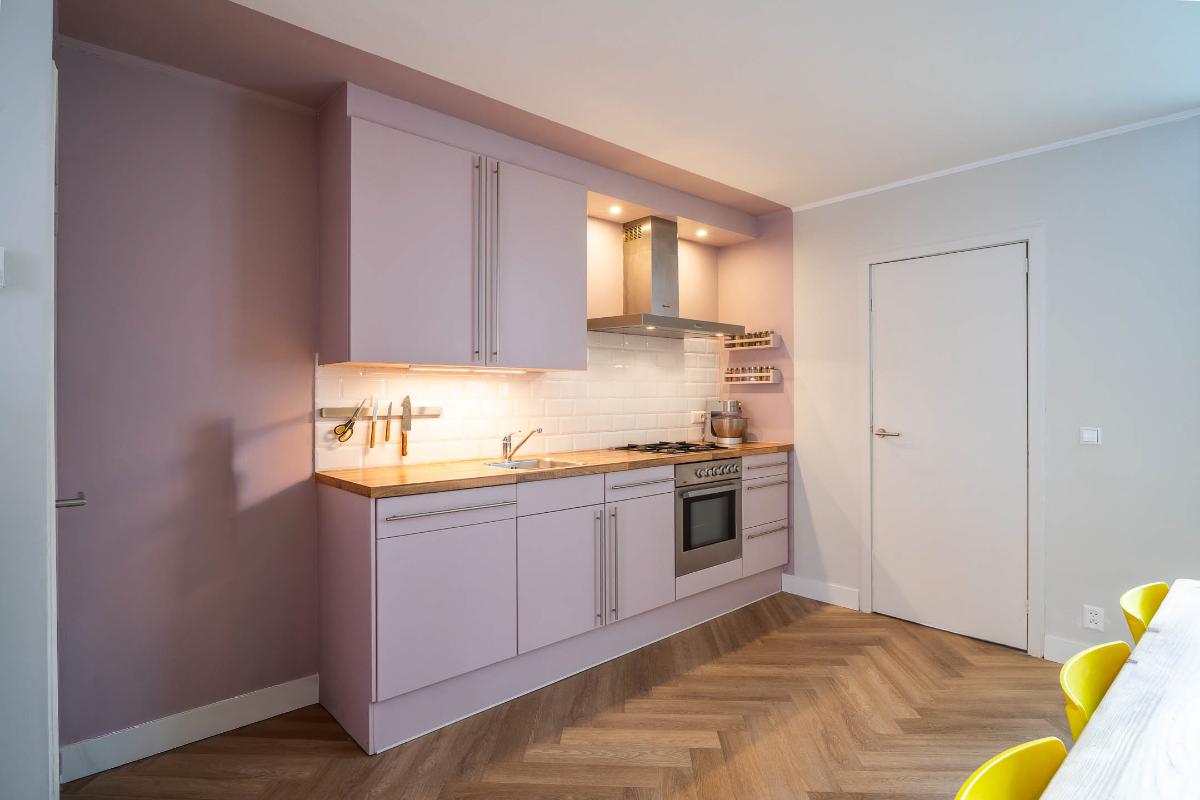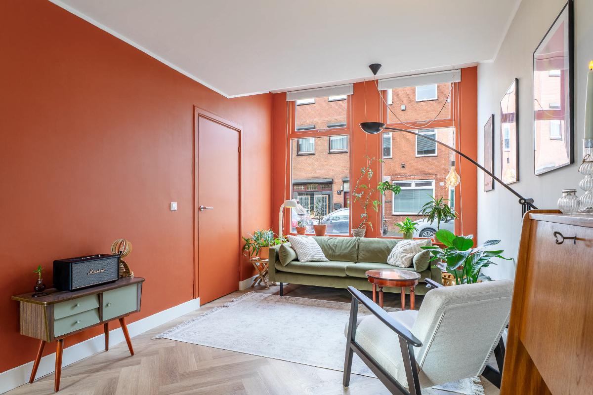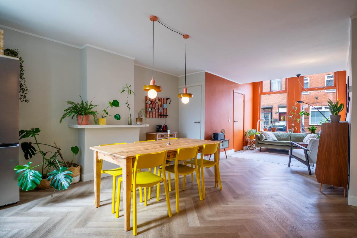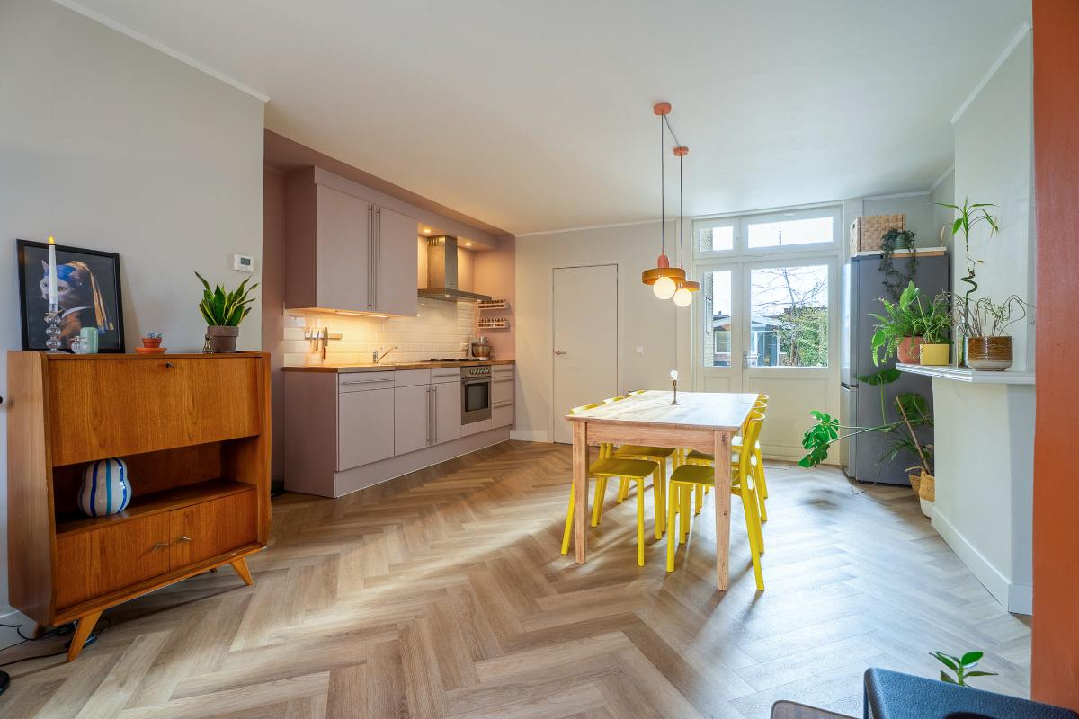 WOONKAMER De sfeervolle woonkamer (ca. 28m²) is voorzien van een prachtige (visgraat) pvc-vloer met vloerverwarming, stucwerk wand- en plafondafwerking, meterkast en een royale trapkast met hierin de aansluitingen ten behoeve van de wasapparatuur en de verdeler voor de vloerverwarming. Door de grote raampartijen kent de woonkamer op ieder moment van de dag een bijzonder fijne lichtinval. Aan de achterzijde staat de woonkamer in open verbinding met de keuken en is direct tuincontact mogelijk middels de openslaande tuindeuren. Daarnaast is aan de achterzijde toegang tot de slaapkamer.