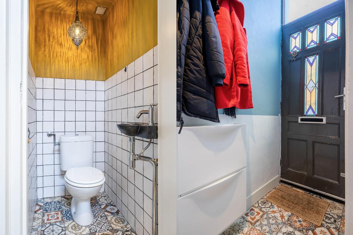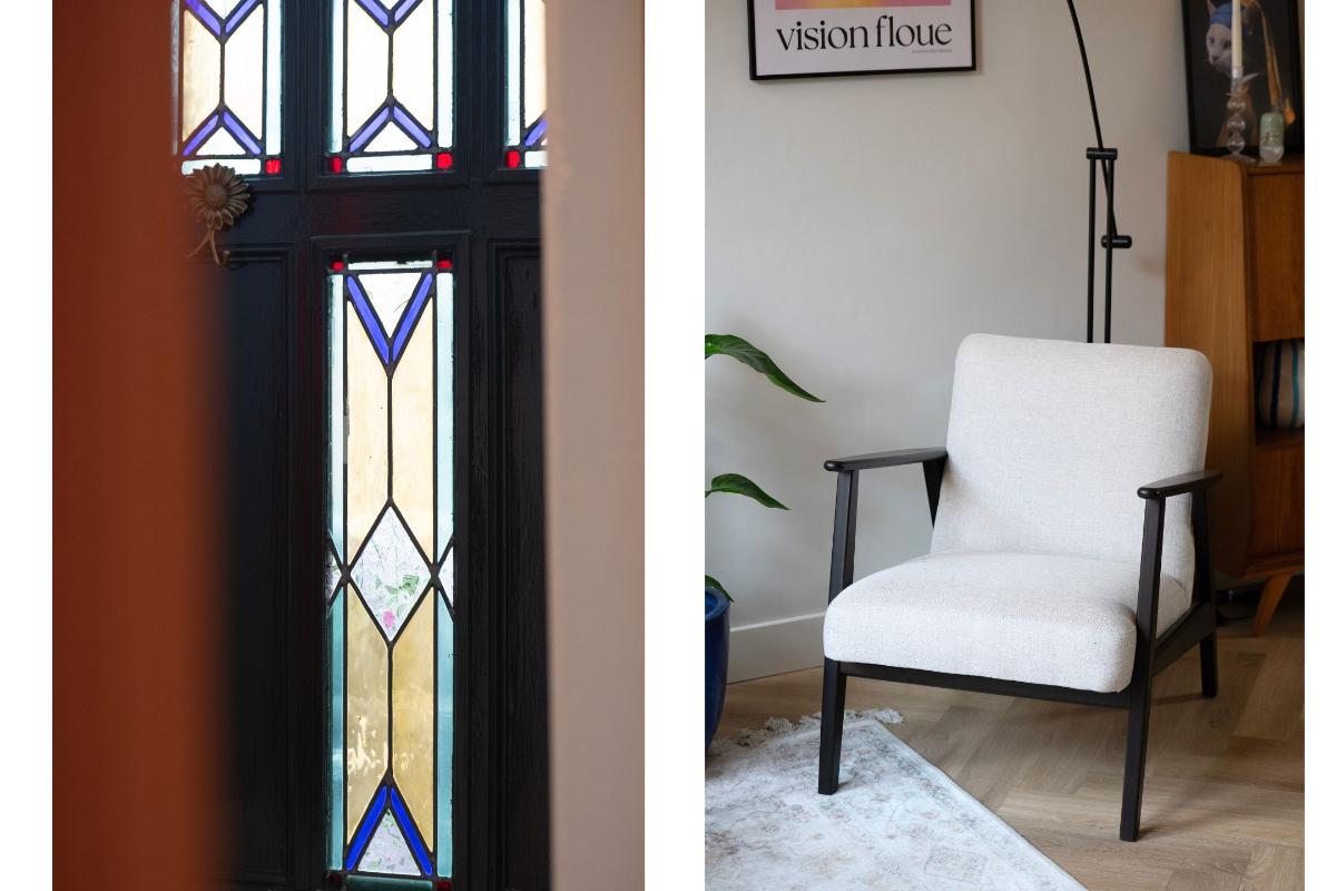 INDELING ENTREE/HAL Middels een eigen entree is toegang tot de hal, die is voorzien van een authentieke glas-in-lood glaspartij, garderobe en sfeervolle Portugese tegelvloer. Vanuit de hal is de woonkamer en toiletruimte bereikbaar.