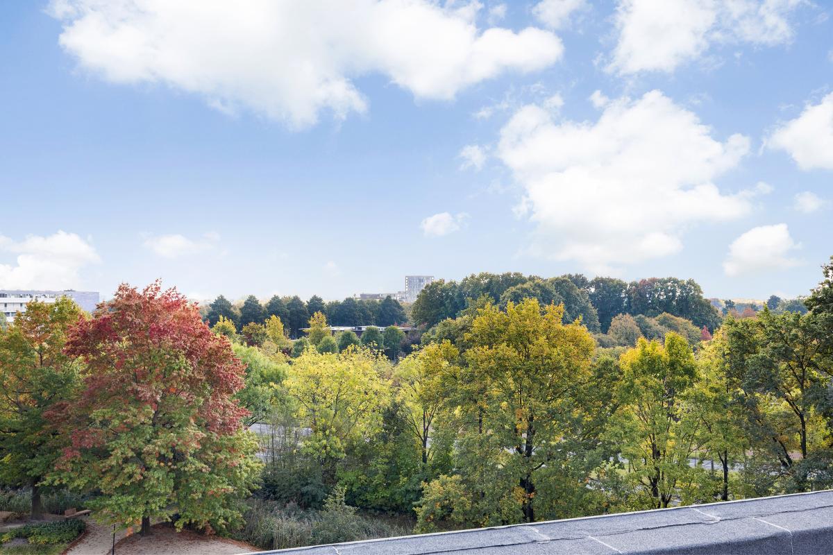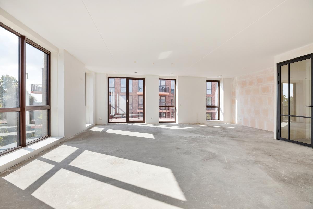 Een riante woonkamer met grote raampartijen en toegang tot het terras op het zuidwesten. Hier geniet u van veel lichtinval en een prachtig uitzicht over het park. De woonkamer biedt volop ruimte voor een zithoek, eethoek en eventueel een werkplek.
