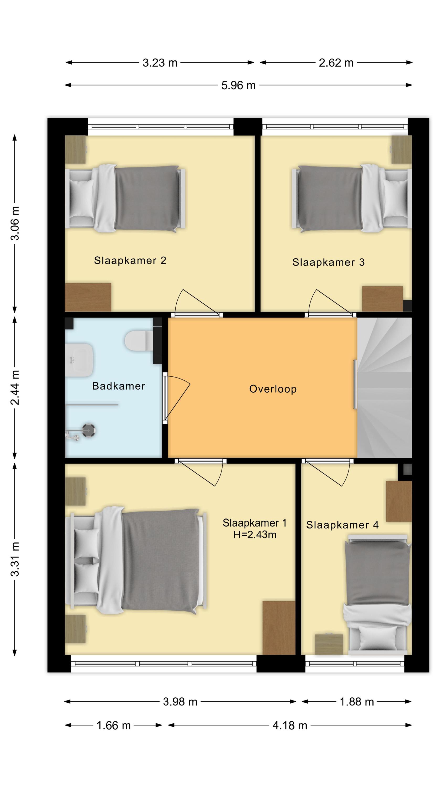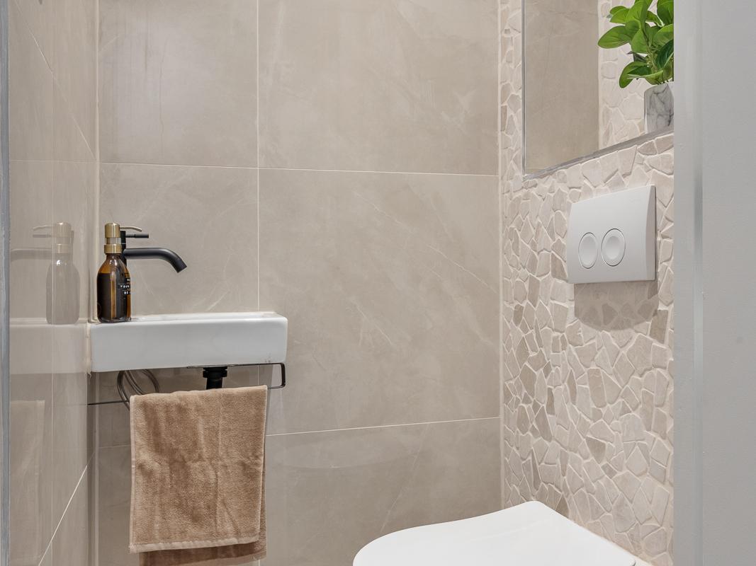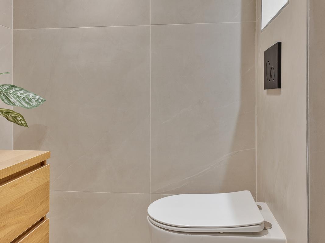Eerste verdieping – Vier slaapkamers en moderne badkamer; Op de eerste verdieping bevinden zich vier volwaardige slaapkamers, elk voorzien van een strakke laminaatvloer en neutrale afwerking. De kamers zijn geschikt als kinderkamer, werkkamer of logeerkamer. De badkamer is modern en luxe ingericht met een ruime inloopdouche, een stijlvol wastafelmeubel, een tweede toilet en comfortabele vloerverwarming.