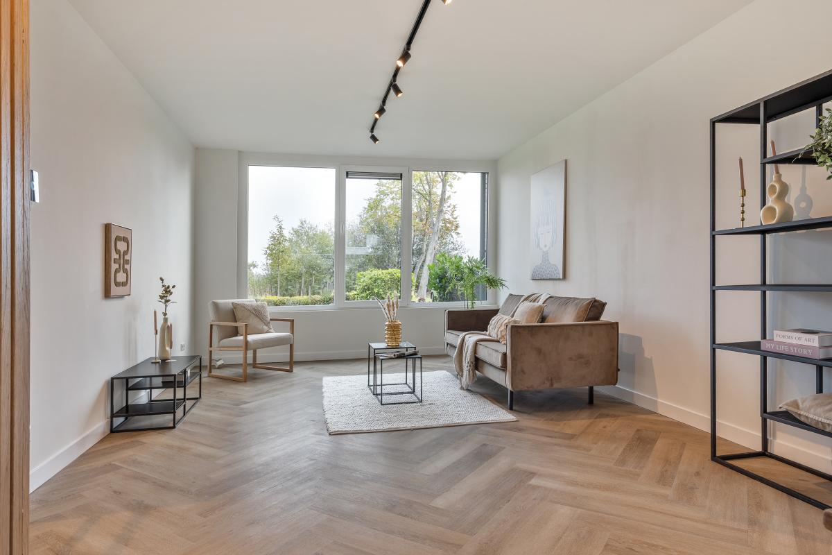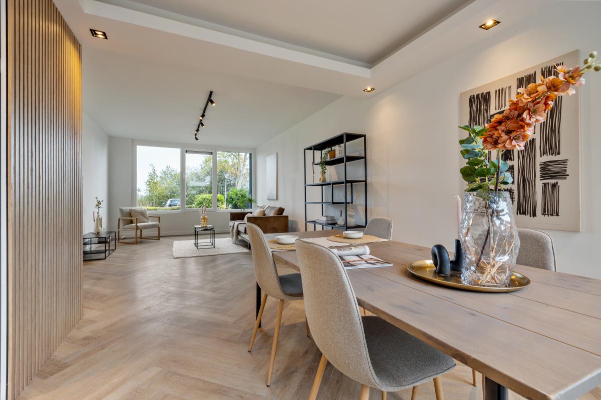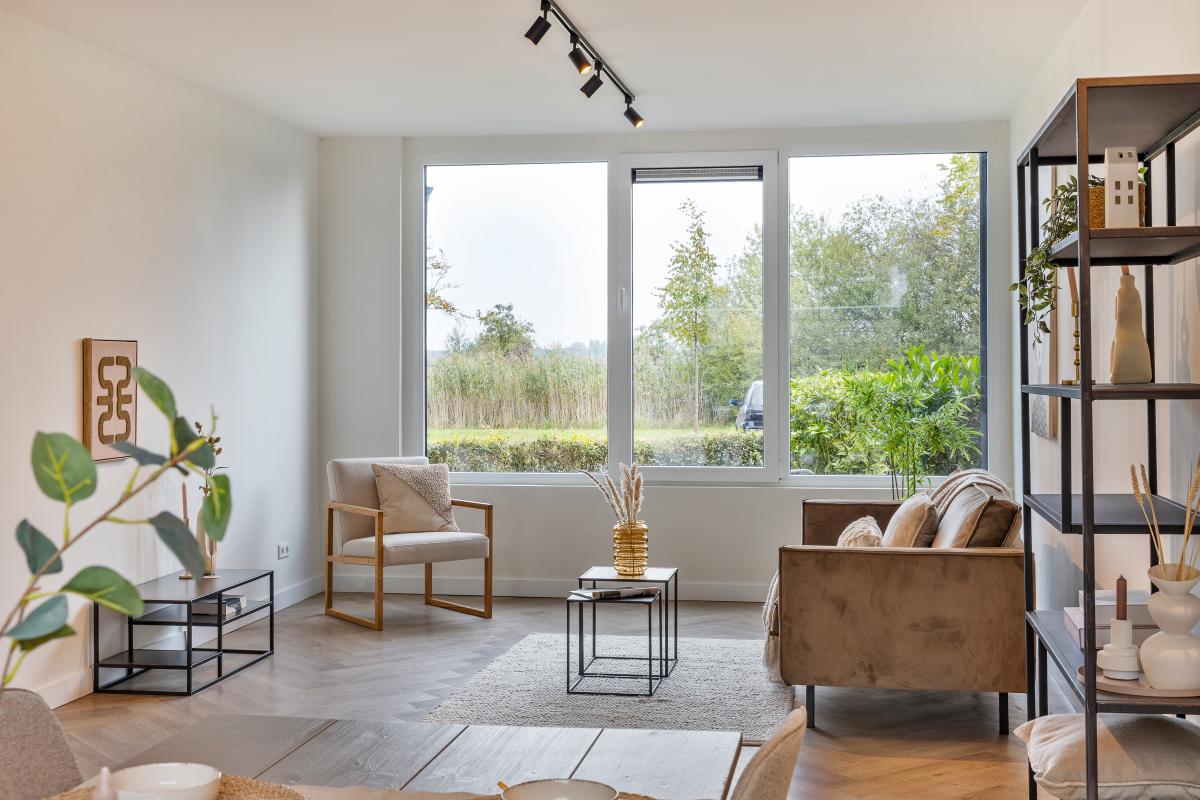 Begane grond – Licht, luxe en leefcomfort; Bij binnenkomst valt direct de hoogwaardige afwerking op. De ruime woonkamer met open keuken is voorzien van een stijlvolle pvc-visgraatvloer en vloerverwarming, wat zorgt voor een warme en moderne uitstraling. Grote raampartijen aan de voorzijde bieden een prachtig uitzicht over het natuurgebied en laten veel daglicht binnen. De open keuken is strak en luxe uitgevoerd, met moderne inbouwapparatuur zoals een inductiekookplaat, combi-oven, vaatwasser, quooker, inbouw koffiemachine, een koelkast en vriezer. De keuken biedt veel werk- en opbergruimte en sluit naadloos aan op de leefruimte. Via de achterzijde bereikt u de zonnige tuin op het zuidwesten – een heerlijke plek om te ontspannen, te tuinieren of te genieten van lange zomeravonden.