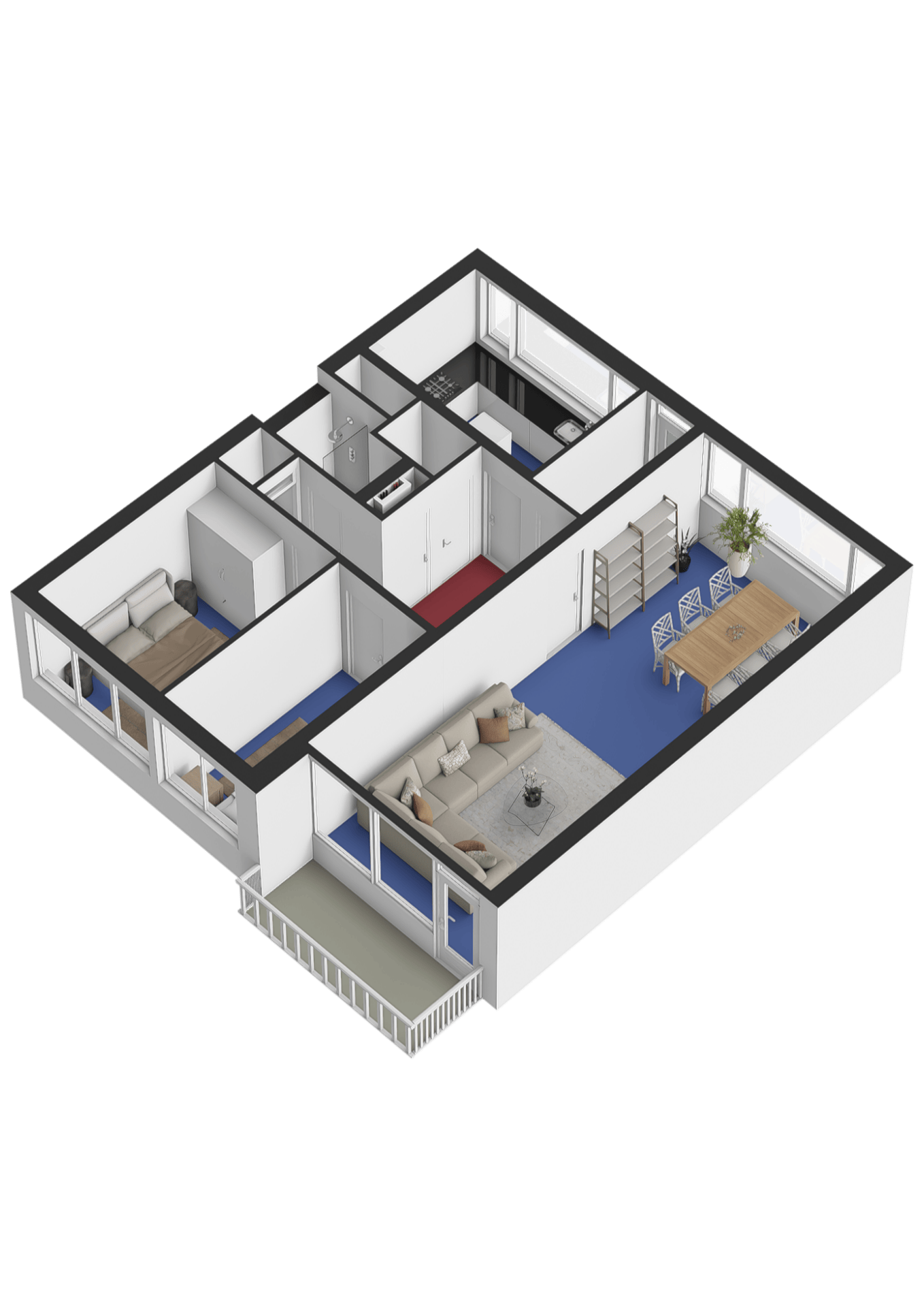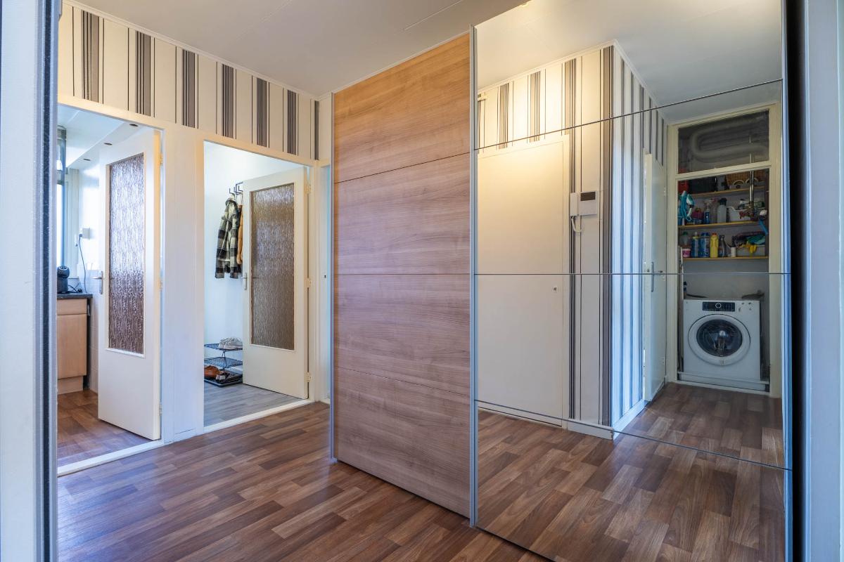 ENTREE (6e etage) Via de galerij bereik je de voordeur van het appartement, deze geeft toegang tot de hal. Vanuit de hal zijn de ruime woonkamer, keuken, 2 slaapkamers, badkamer en toiletruimte bereikbaar. In de hal bevinden zich tevens de vernieuwde meterkast én een praktische bergkast met de aansluitingen ten behoeve van de wasapparatuur.