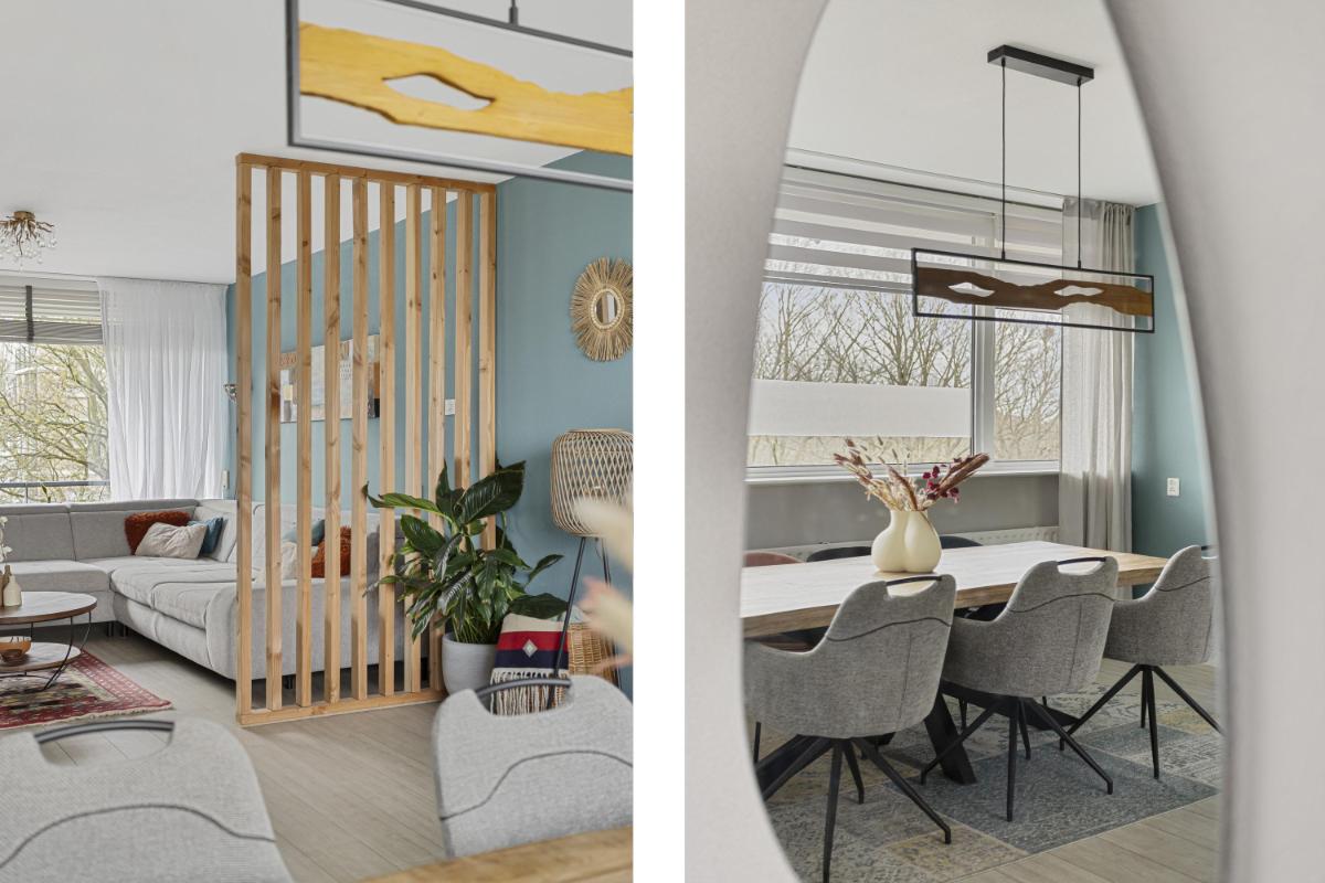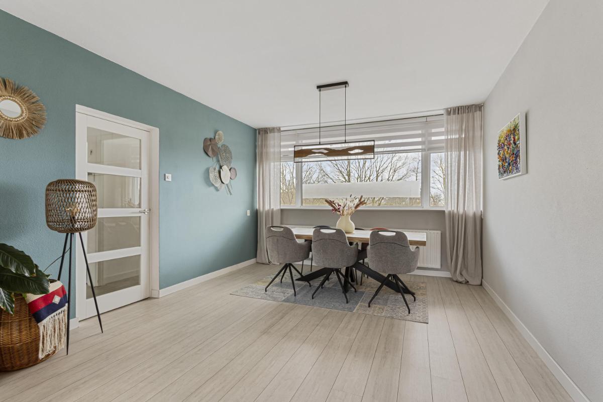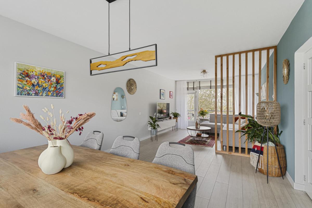 WOON-/EETKAMER De ruime doorzonkamer (ca. 32m²) met veel lichtinval is voorzien van een laminaatvloer, strakke wand- en plafondafwerking en een fraaie roomdevider. Vanuit de woon-/eetkamer kan het balkon, welke is gelegen op het zonnige zuiden en vrij uitzicht heeft over een natuurrijke omgeving, worden bereikt. Het balkon beschikt over een zonnescherm.