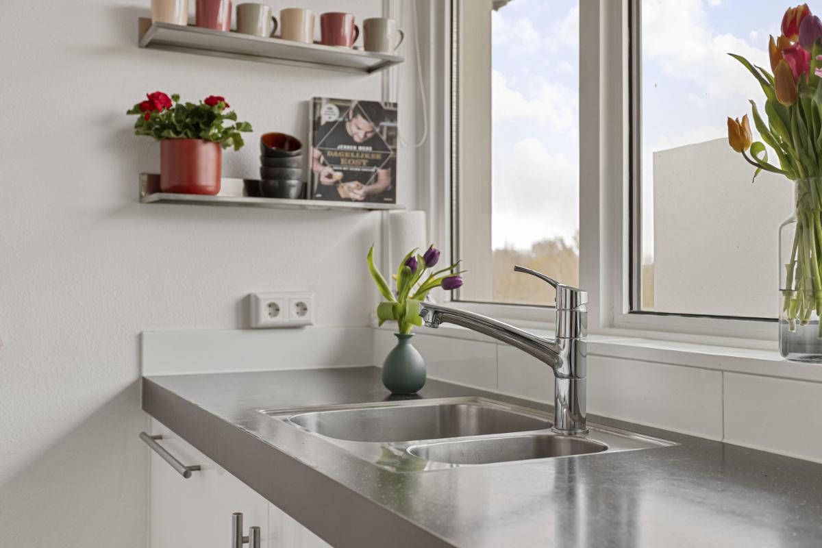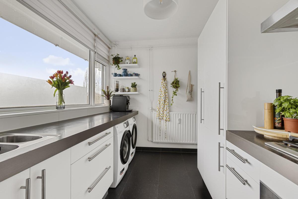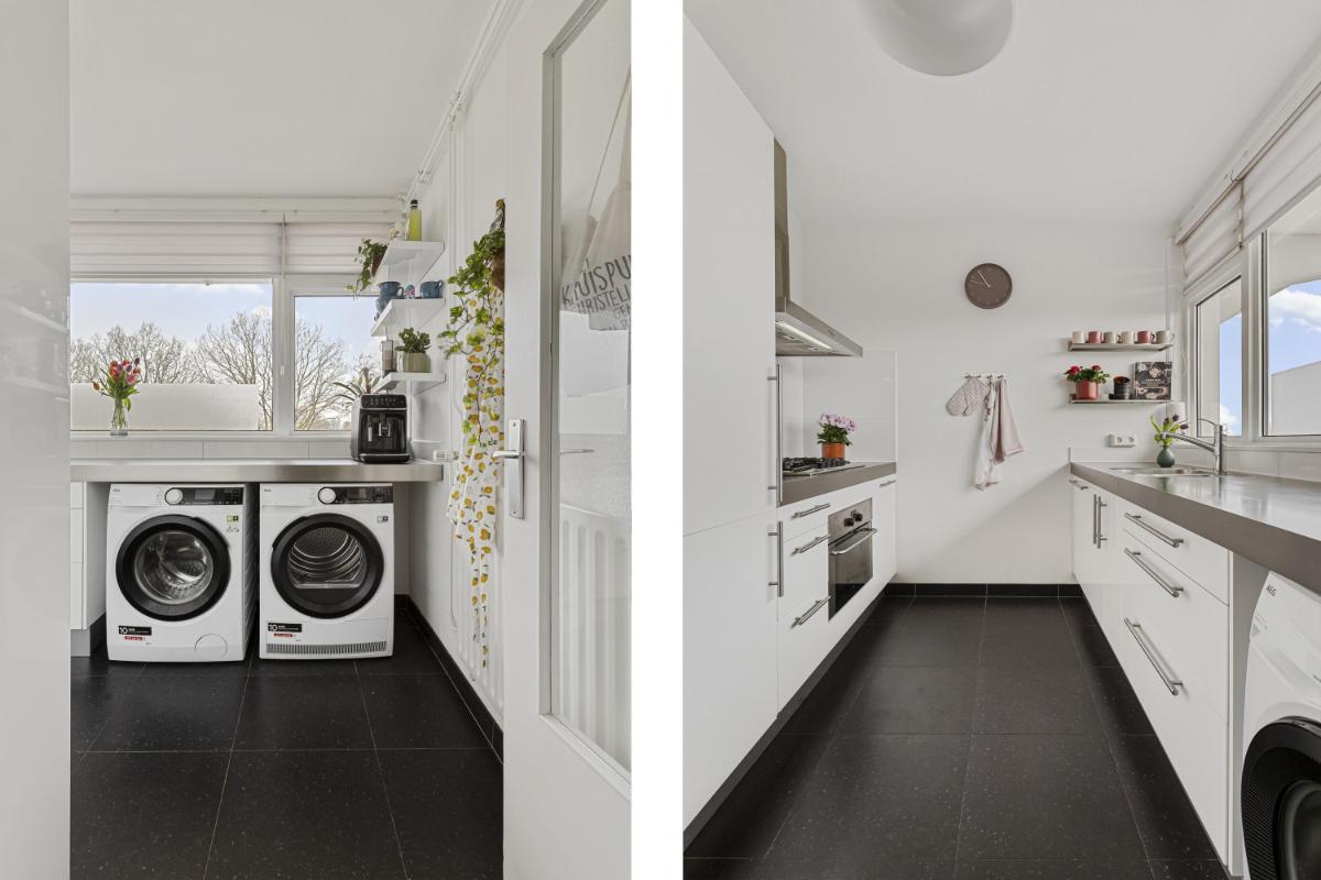KEUKEN De complete keuken in tweetal wandopstellingen is bereikbaar vanuit de hal en voorzien van o.a. een 1,5 spoelbak, een 5-pits gaskookplaat, rvs afzuigschouw, combi-oven, koelkast, vriezer met 3 lades, vaatwasmachine en genoeg opbergruimte. Daarnaast bevinden zich in de keuken tevens de aansluitingen ten behoeve van de wasapparatuur.