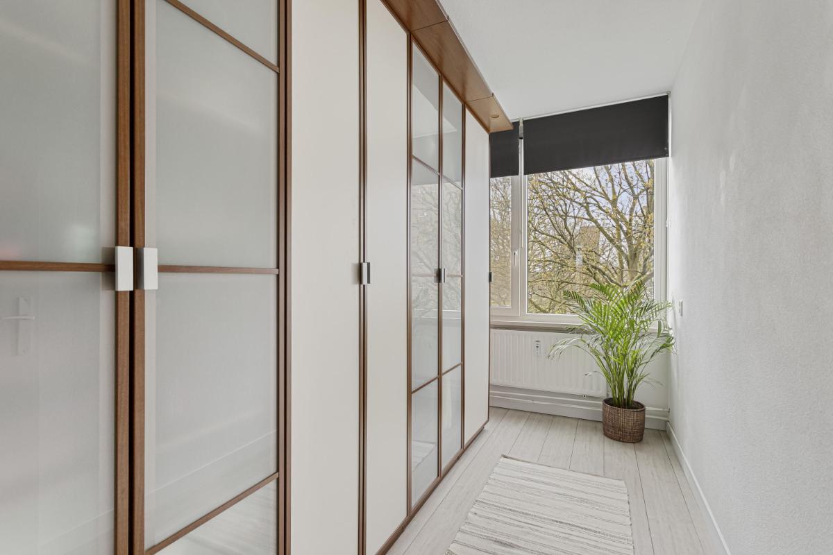 SLAAPKAMERS (2) Het appartement beschikt over twee slaapkamers gelegen aan de achterzijde, waarvan 1 thans in gebruik als kastenkamer. Beide slaapkamers zijn voorzien van kunststof kozijnen (2015), strakke wand- en plafondafwerking, een laminaatvloer en vanuit beide slaapkamers is een prachtig vrij uitzicht over het groen.