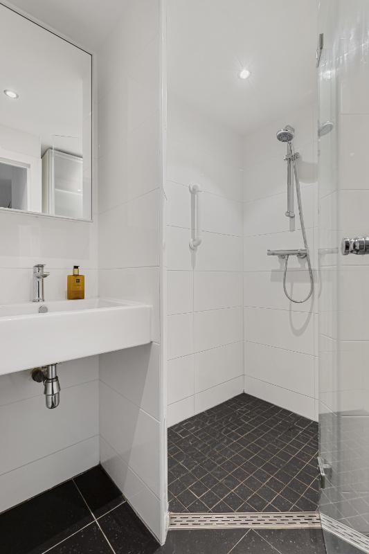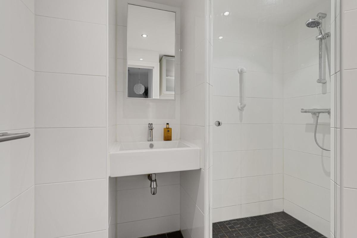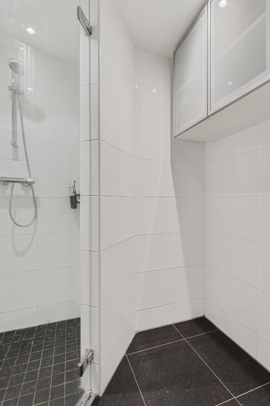 BADKAMER De moderne badkamer is bereikbaar via de hal en beschikt over een inloopdouche, een wastafel met meubel, mechanische ventilatie en inbouwspots.