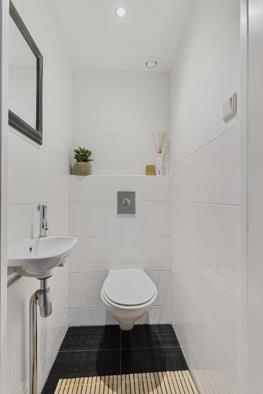TOILETRUIMTE Geheel (in lichte kleurstelling) betegelde toiletruimte met vrijhangend closet en fonteintje.