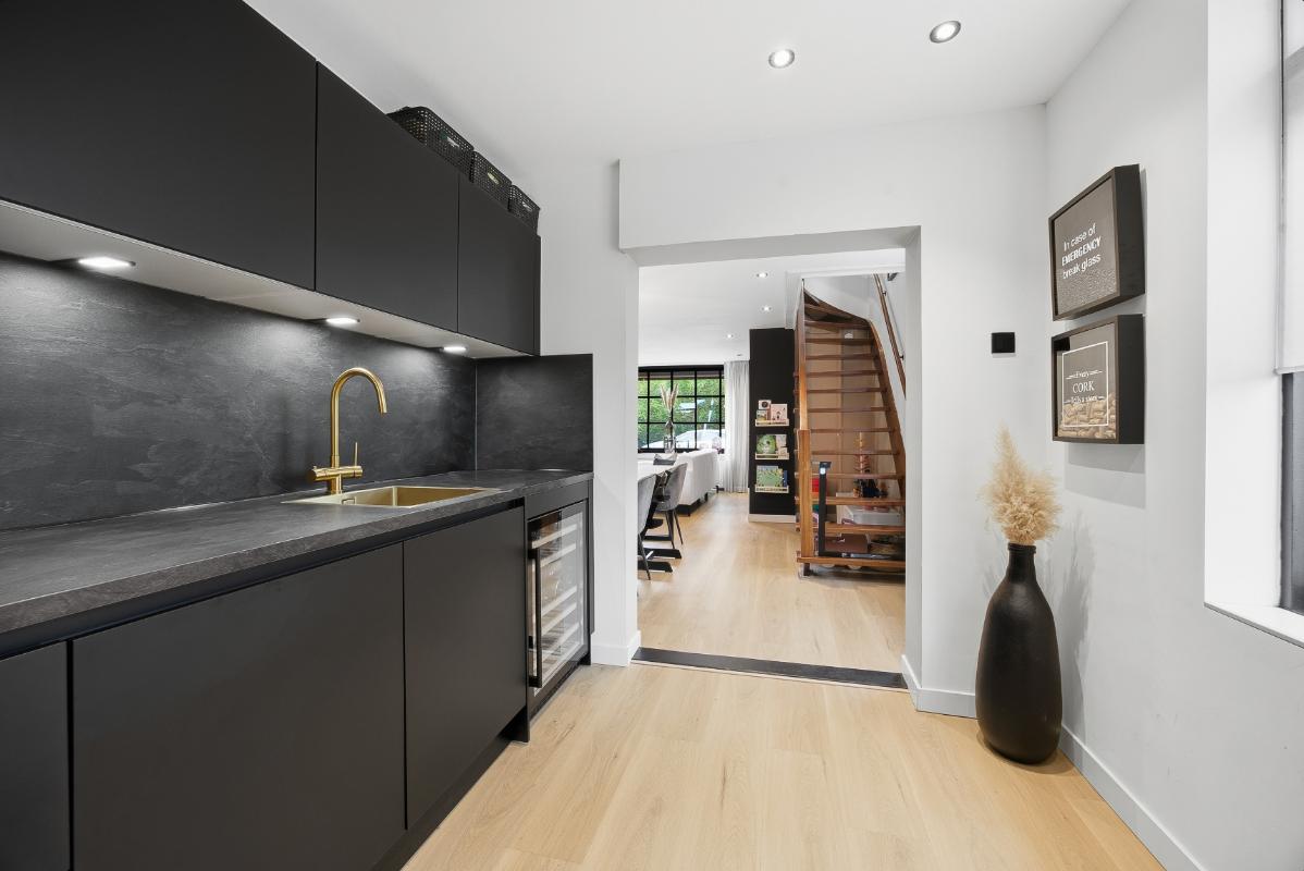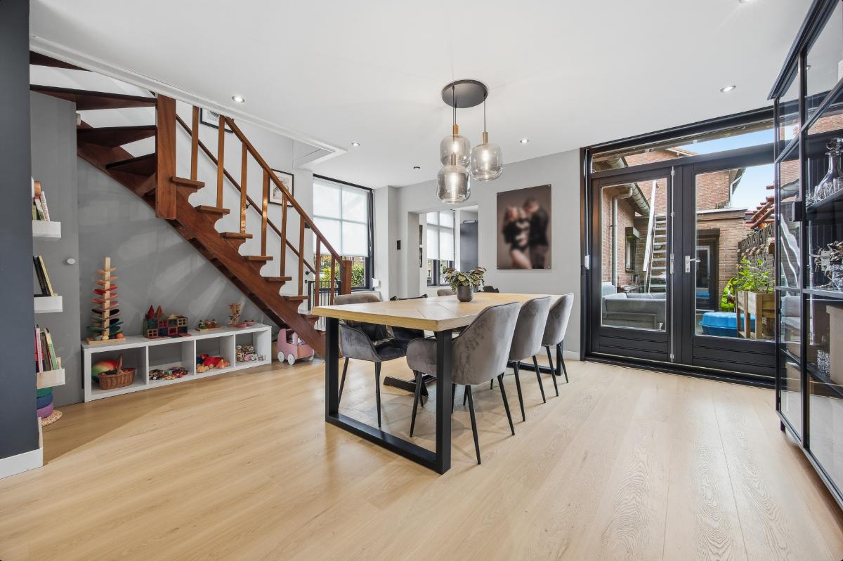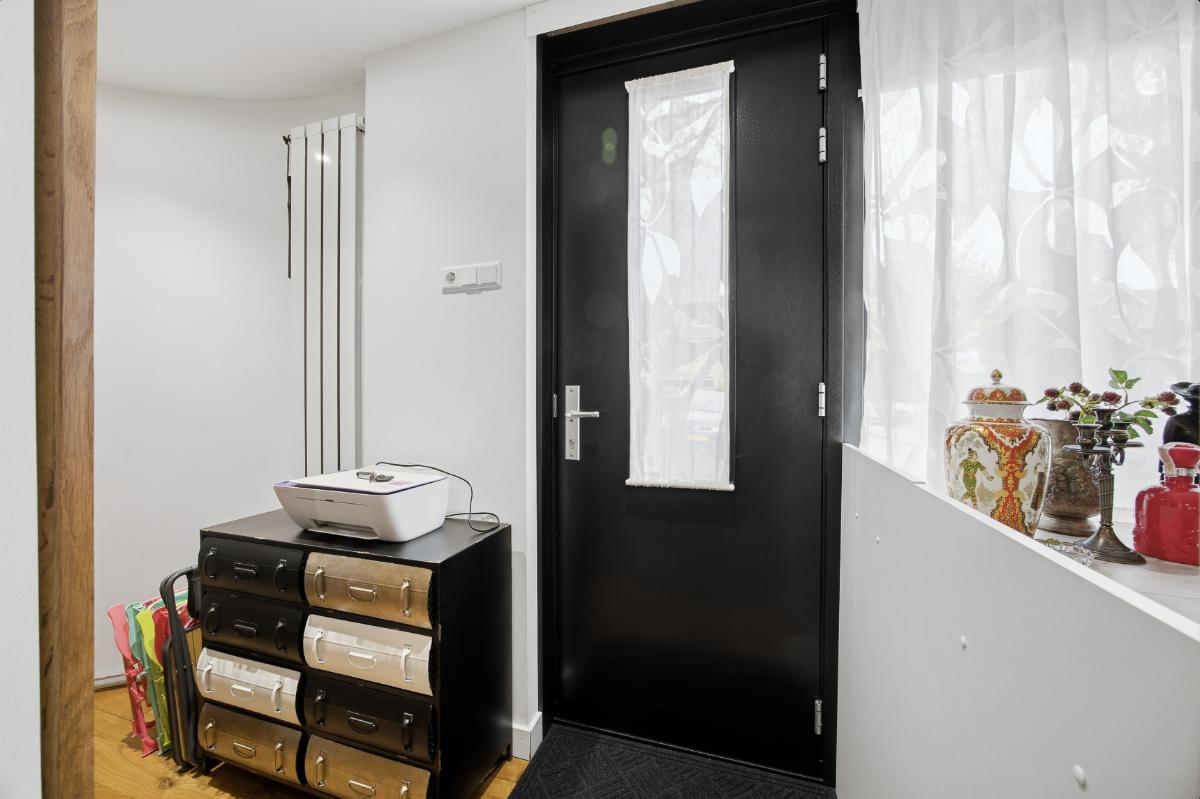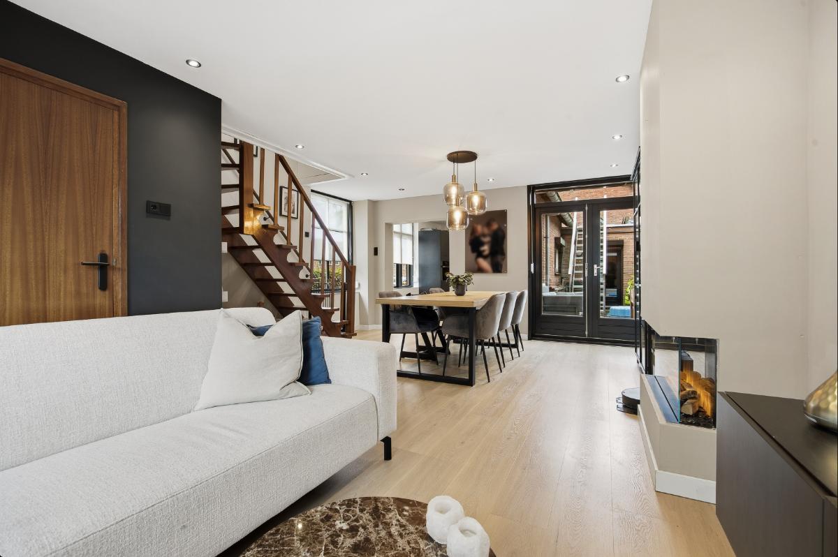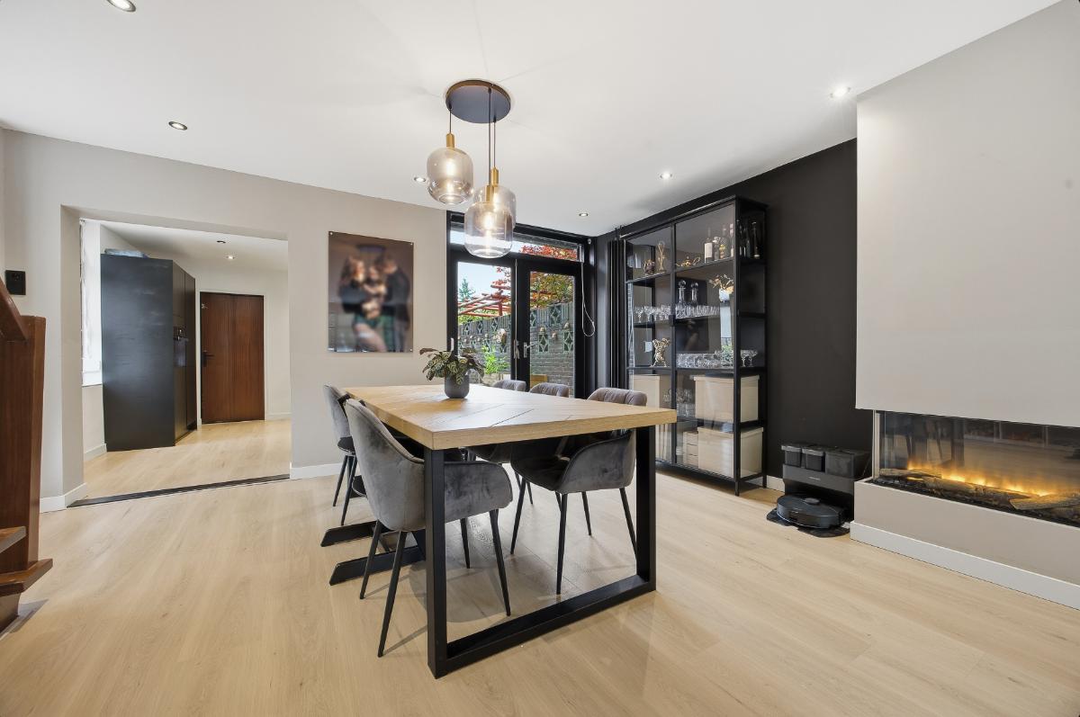 Begane grond: Hal-/entree voorzien van tegelvloer en toegangsdeur naar de woonkamer. De woonkamer is een gezellige leefruimte met elektrische sfeerhaard, openslaande deuren richting de binnentuin, toegang tot de keuken en de trapopgang naar de 1e verdieping. Ruime woonkamer met strak gestukte wanden en een klik pvc vloer. Half open moderne keuken (2023) voorzien van een wijnkoeler, een spoelbak, een warmwaterkraan, een 4-pits BORA inductie kookplaat, een combi-oven, een koel-vriescombinatie, een vaatwasser en een loopdeur naar de bijkeuken/ wasruimte en het toilet. Verder is er via de bijkeuken ook toegang tot de extra leefruimte.