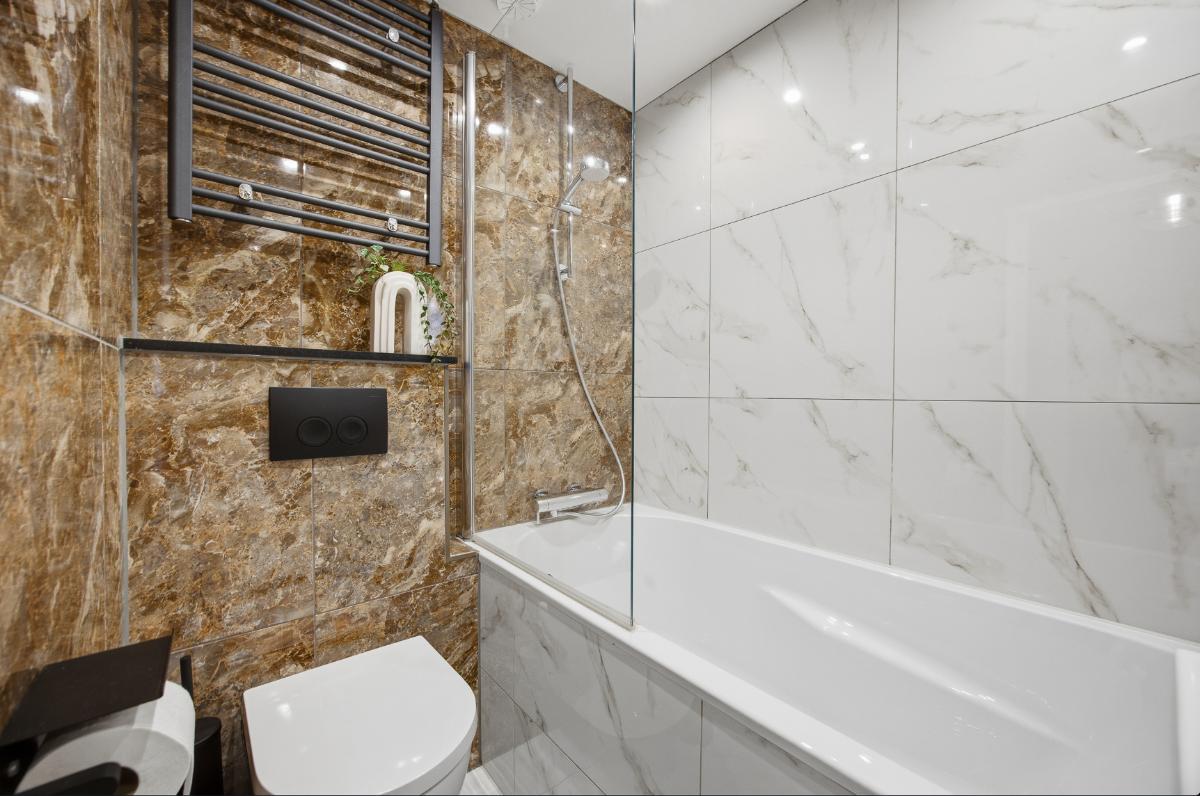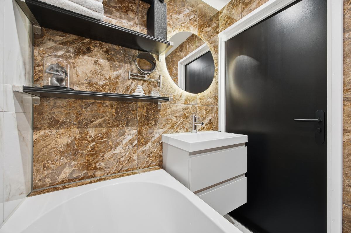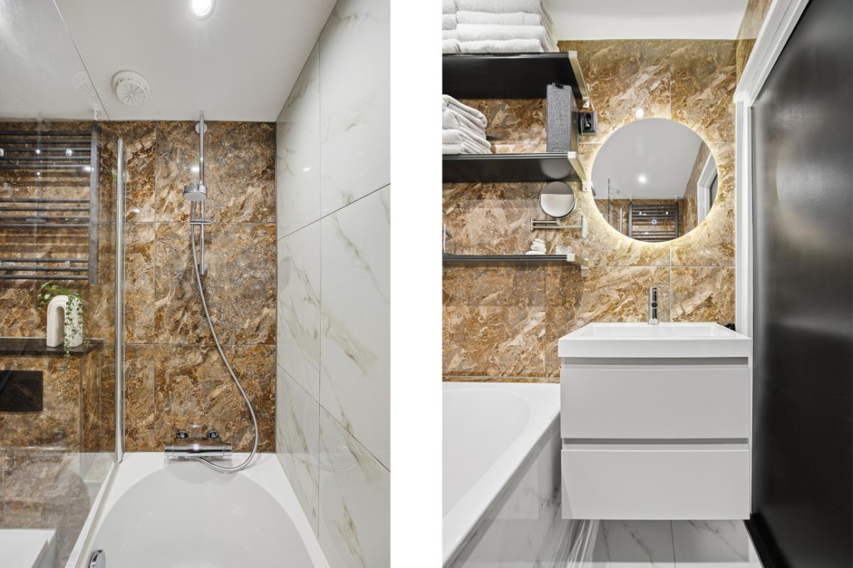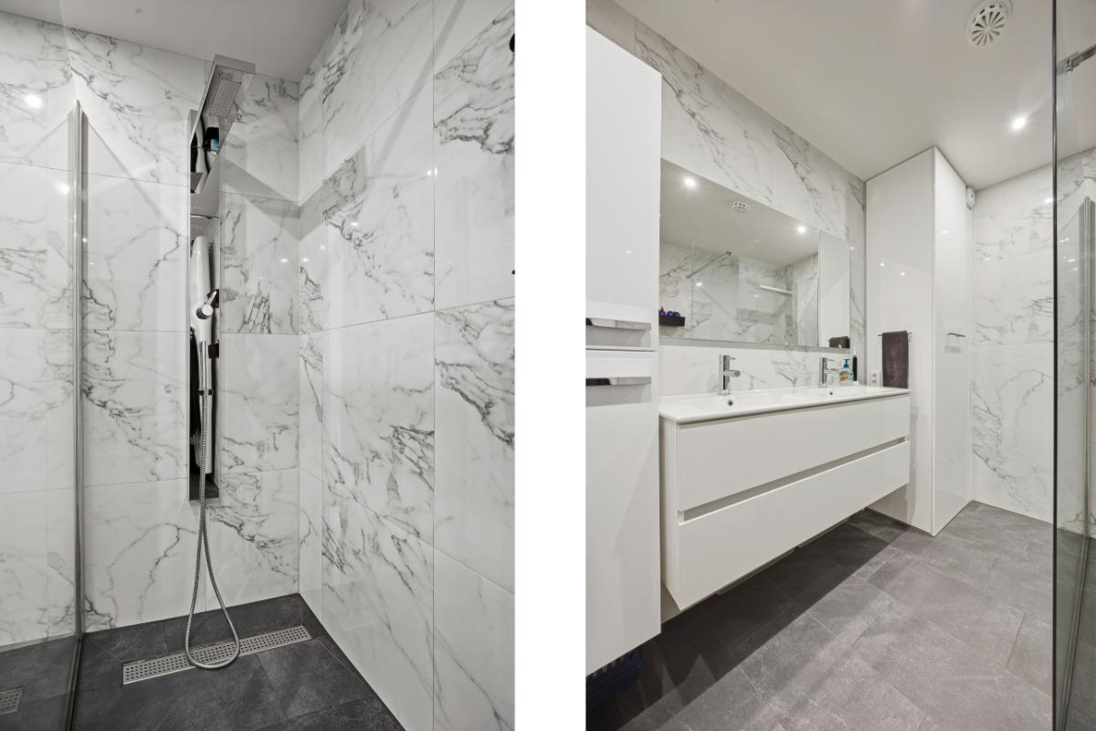 Eerste verdieping: Op deze verdieping zijn eveneens de wanden en vloeren keurig verzorgd. Vanuit de overloop is de toegang tot de slaapkamers en de badkamer. Slaapkamer (2) ligt aan de achterzijde en is door de grote raampartij voorzien van veel lichtinval. Tevens zijn er spots verwerkt in het plafond. Slaapkamer (3) is gelegen aan de voorzijde en heeft tevens veel lichtinval door de grote raampartij. Deze is voorzien van een airco en eveneens van spots in het plafond. De badkamer is voorzien van een modern wastafelmeubel, een ligbad en een 2e toilet.