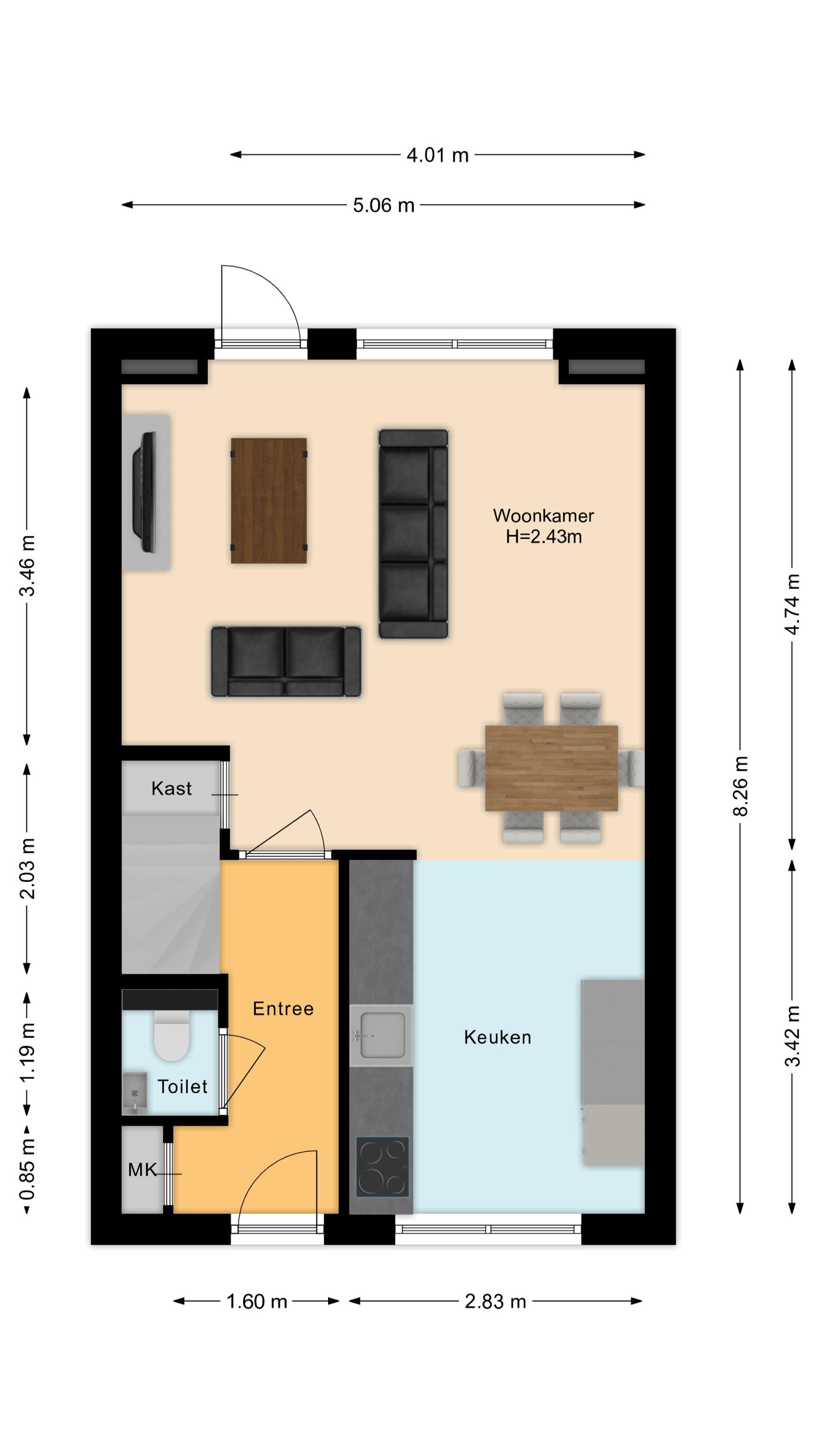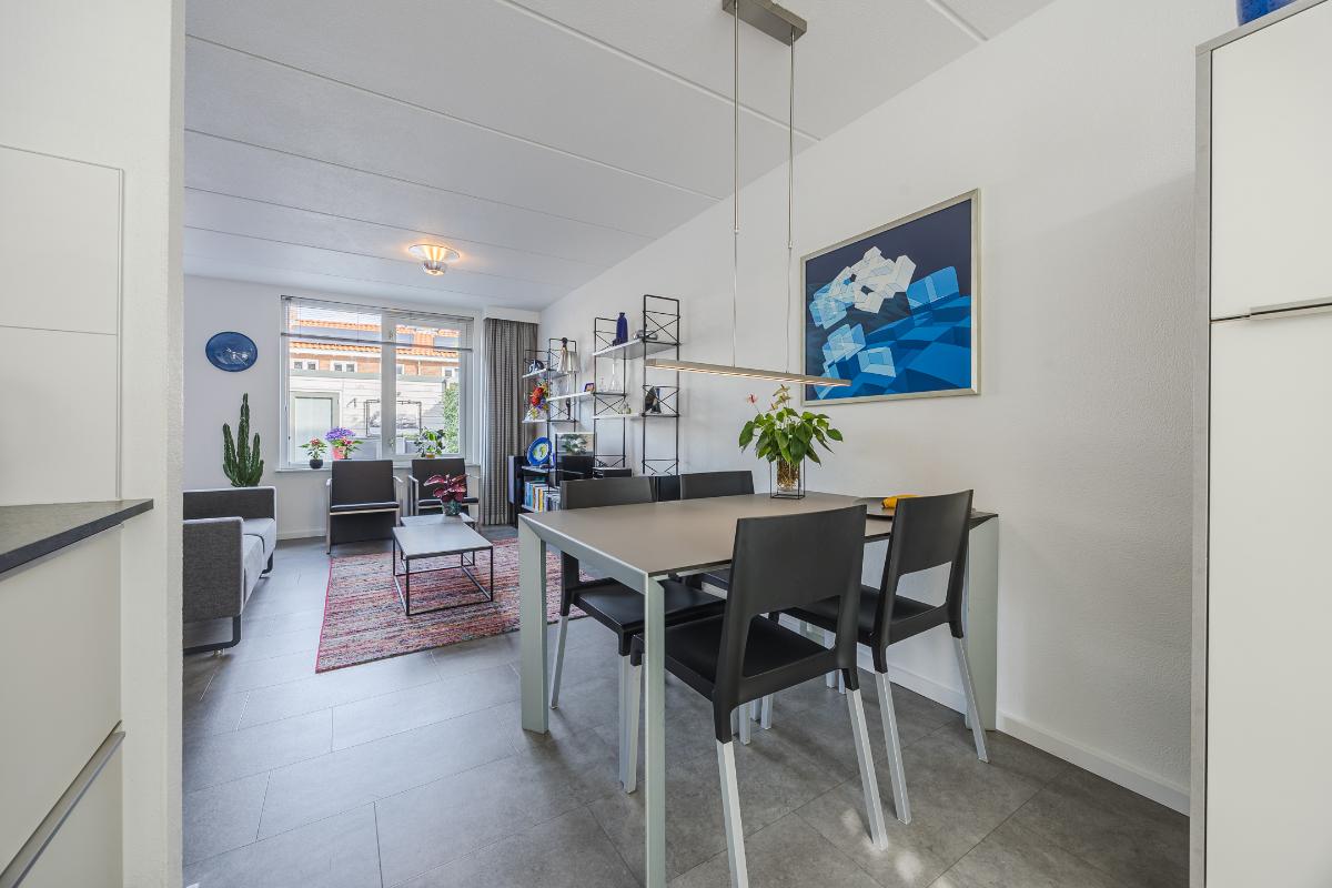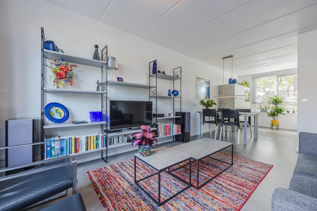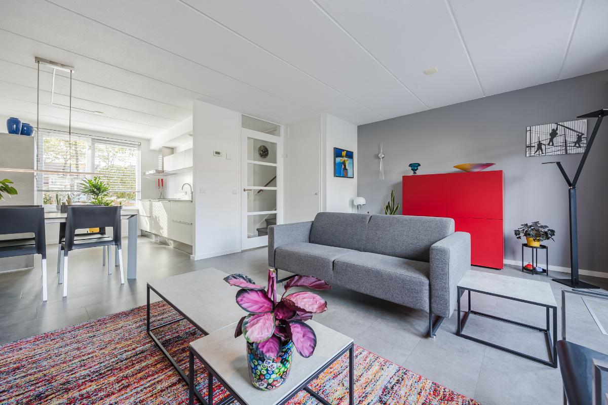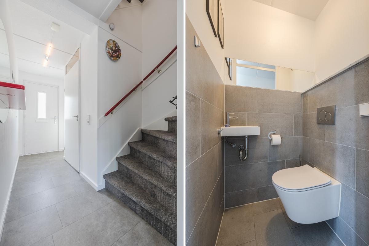 Indeling begane grond Bij binnenkomst betreedt u een ruime hal met meterkast, toilet en trapopgang naar de eerste verdieping. Vanuit de hal is er toegang tot de moderne woonkamer, die door de grote raampartijen geniet van veel natuurlijk licht. De woonkamer biedt voldoende ruimte voor een gezellige zithoek en een eethoek met uitzicht op de tuin.