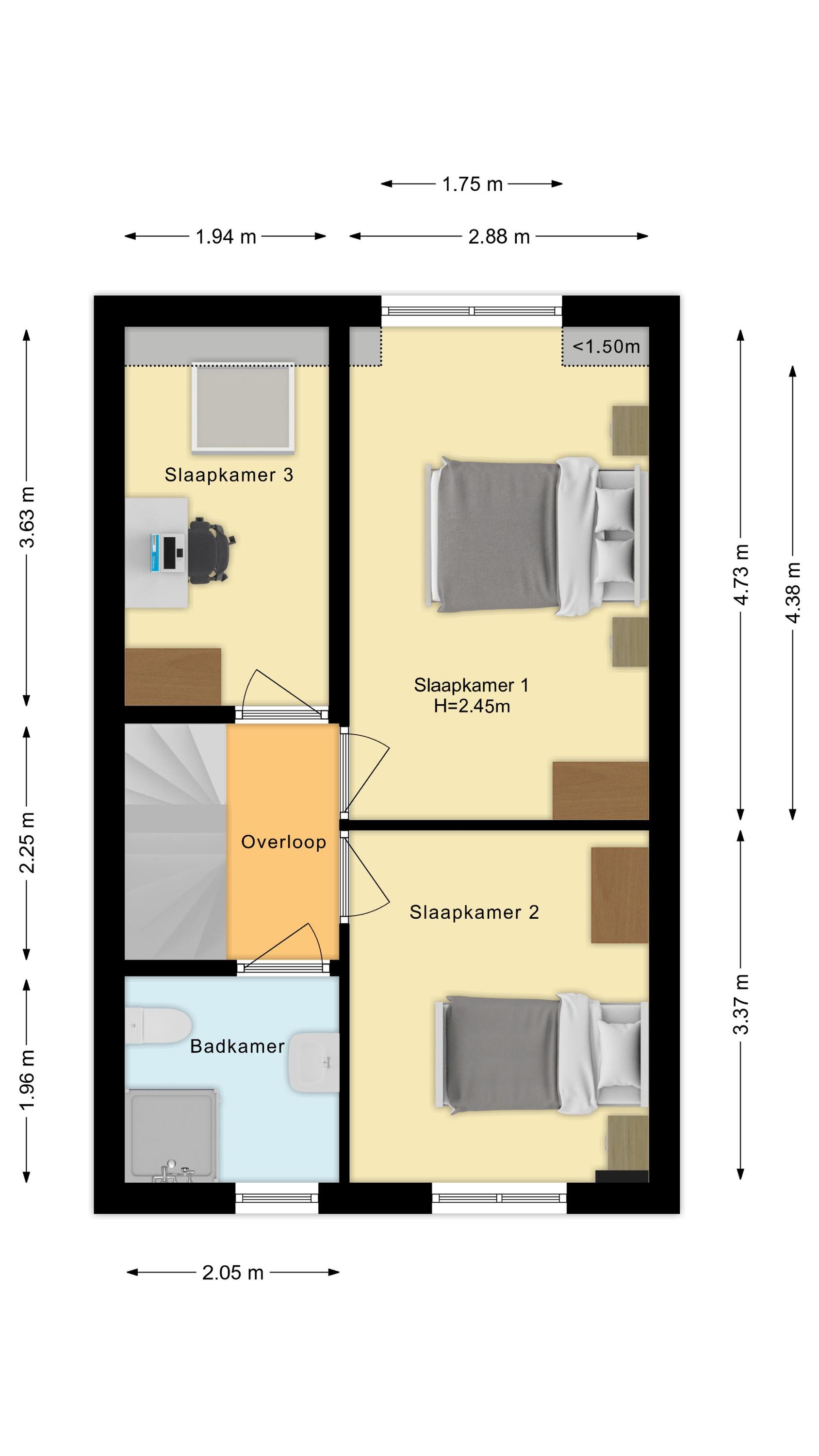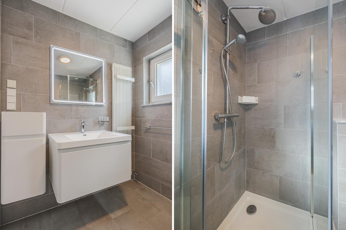 Eerste verdieping Op de eerste verdieping bevinden zich drie ruime slaapkamers en een moderne badkamer. De hoofdslaapkamer ligt aan de achterzijde en biedt voldoende ruimte voor een groot bed en kledingkast. De overige slaapkamers zijn ideaal als kinderkamer, logeerkamer of werkkamer. De badkamer is modern ingericht met een douche, wastafelmeubel en tweede toilet. De keuze voor neutrale kleuren en hoogwaardige materialen geeft deze ruimte een frisse en eigentijdse uitstraling.