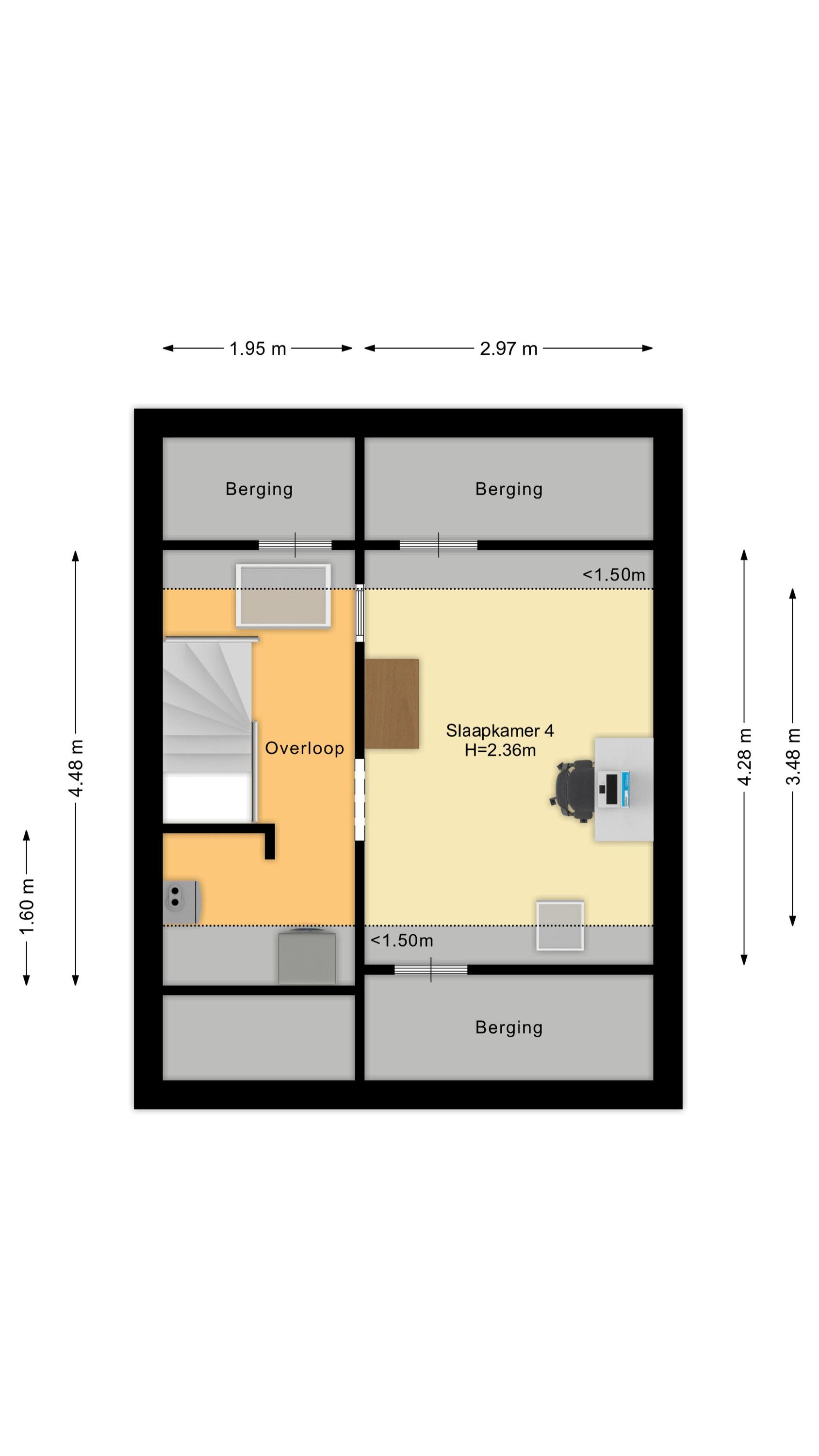 Tweede verdieping Via een vaste trap bereikt u de tweede verdieping, waar zich een vierde slaapkamer bevindt. Deze verdieping kan ook uitstekend dienen als kantoorruimte, hobbykamer of logeerkamer. Tevens bevindt zich op de voorzolder de aansluiting voor de wasapparatuur en extra bergruimte.