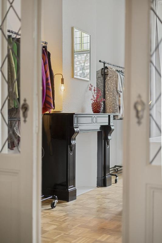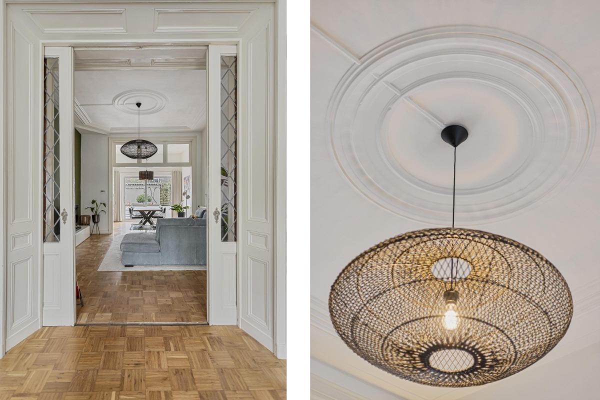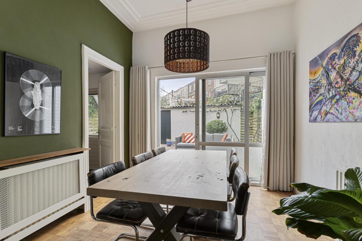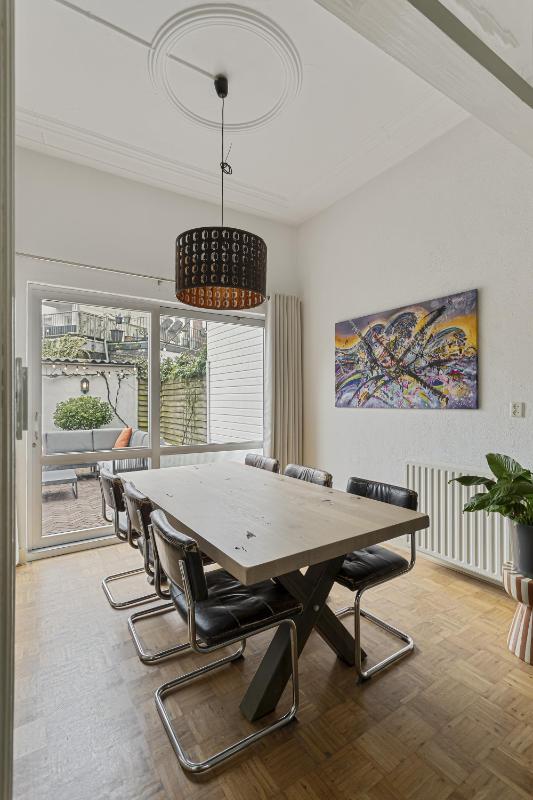 WOONKAMER EN-SUITE / SLAAPKAMER Woonkamer en-suite bestaande uit een voorkamer, thans in gebruik als slaapkamer (ca. 4.56 x 3.88m.), met fraaie mozaïek parketvloer, stucwerk wandafwerking en ornamenten plafond, originele natuurstenen schouw en 2 vaste kasten met daartussen de en-suite deuren naar de woon/middenkamer; Middenkamer (ca. 4.13 x 3.88m.), thans in gebruik als woonkamer, eveneens voorzien van fraaie mozaïek parketvloer, stucwerk wandafwerking, ornamentenplafond en ook 2 vaste kasten naast de en-suite deuren. Tot slot de achterkamer, thans in gebruik als eetkamer en voorzien van eveneens de fraaie mozaïek parketvloer, stucwerk wandafwerking en ornamenten plafond. Vanuit deze eetkamer is direct tuincontact mogelijk middels de aluminium schuifpui en is een doorloop naar de keuken.