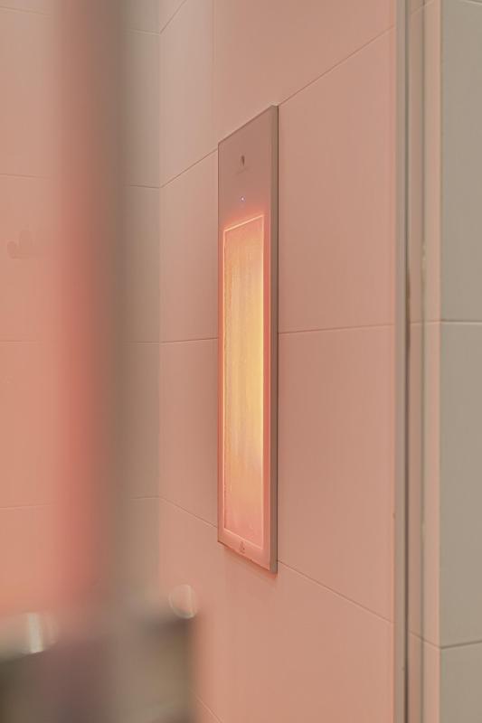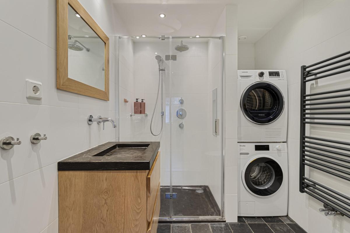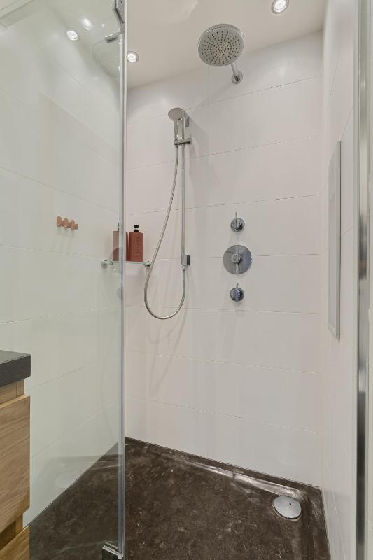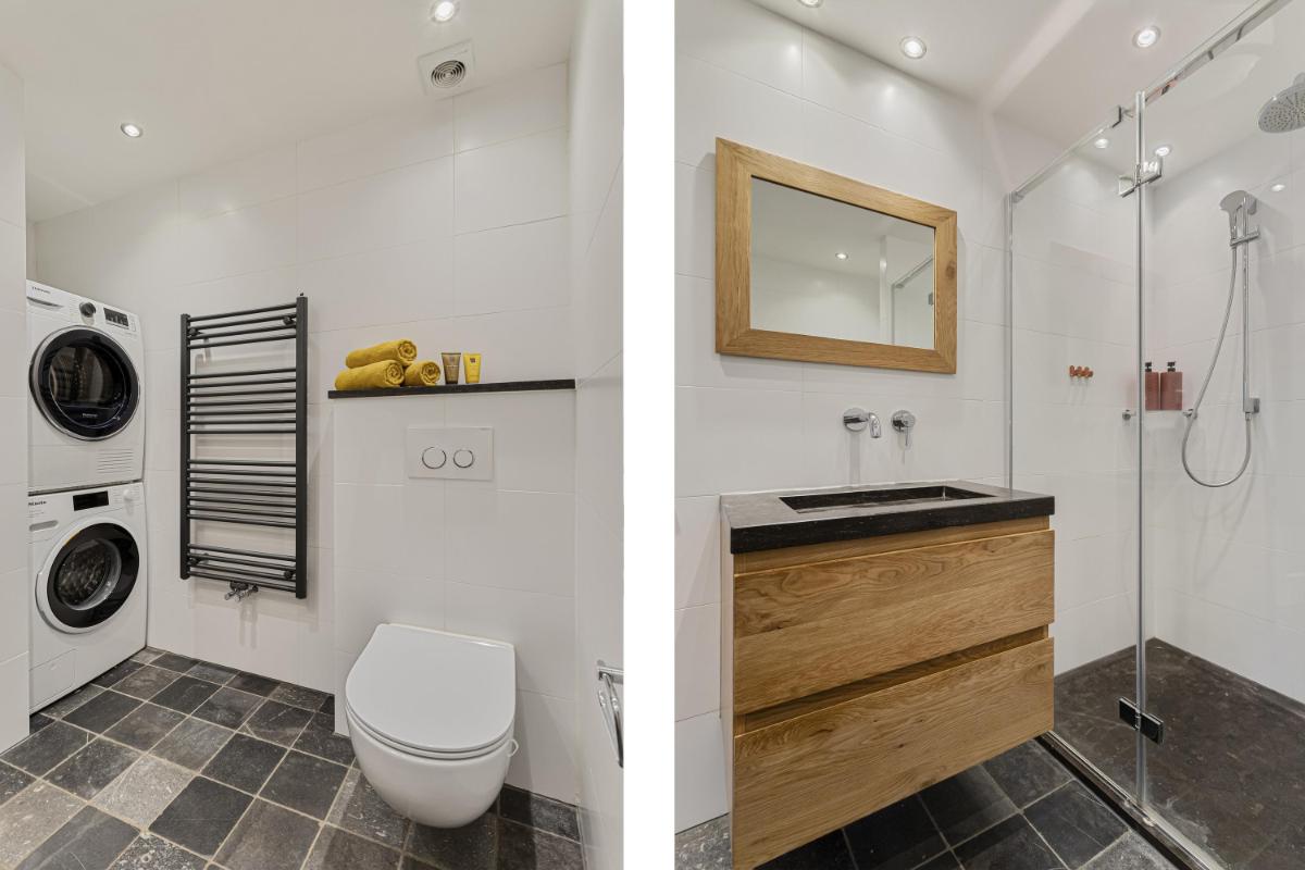 BADKAMER Moderne en geheel betegelde badkamer (ca. 2.52x 2.00m.) en voorzien van een inloop (regen)douche met losse handdouche, sunshower en inbouwkranen, vrijhangend closet, wastafel met meubel en inbouwkranen, designradiator, inbouwspots en de aansluitingen ten behoeve van de wasapparatuur.