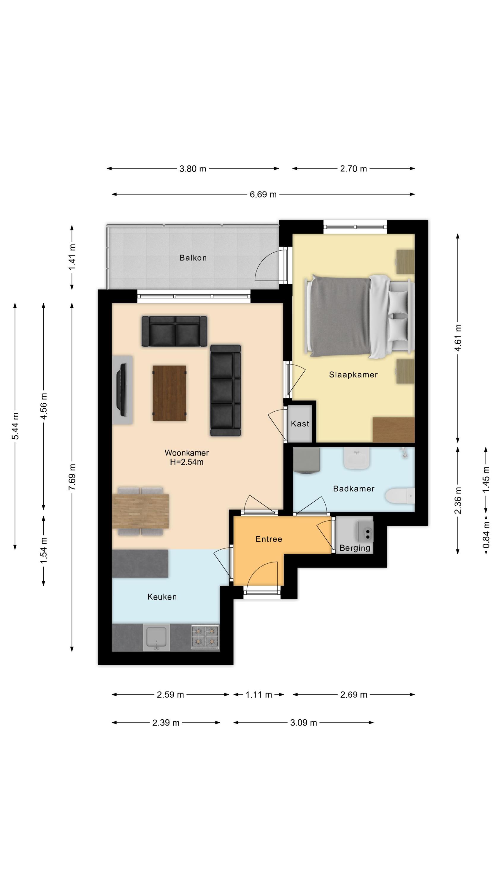 Slim ingedeeld en comfortabel wonen; Het appartement is gelegen op een hogere verdieping van een verzorgd complex en is bereikbaar via een centrale entree met lift en trappenhuis. Bij binnenkomst stap je in een lichte hal die toegang biedt tot de woonkamer en de badkamer. De indeling is efficiënt en praktisch, waardoor de 47 m² optimaal benut wordt.