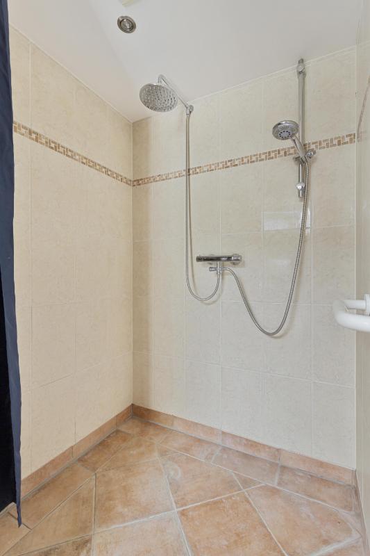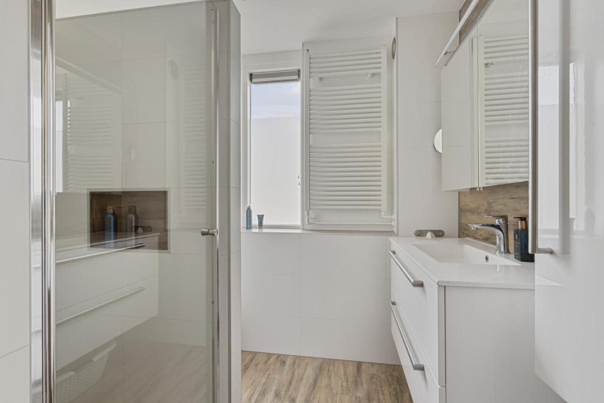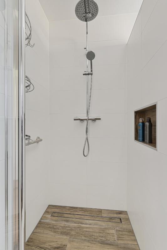 BADKAMER (2019) Moderne, geheel betegelde, badkamer gelegen aan de voorzijde van de woning en voorzien van wastafel met meubel, inloop (regen) douche met losse handdouche, vrijhangend closet, designradiator en inbouwspots.