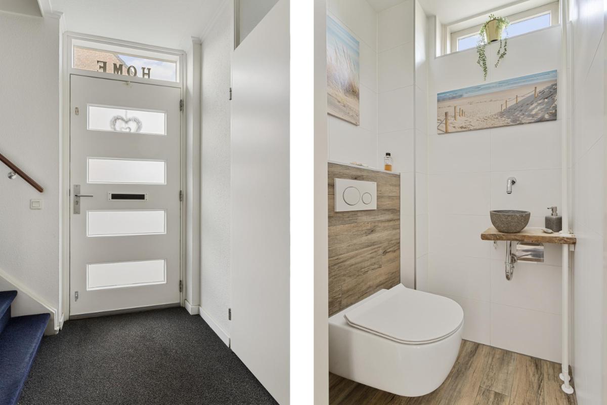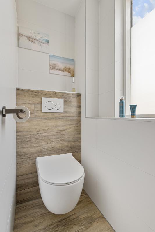 TOILETRUIMTE (2019) Geheel (in lichte kleurstelling) betegelde toiletruimte met vrijhangend closet en fonteintje.