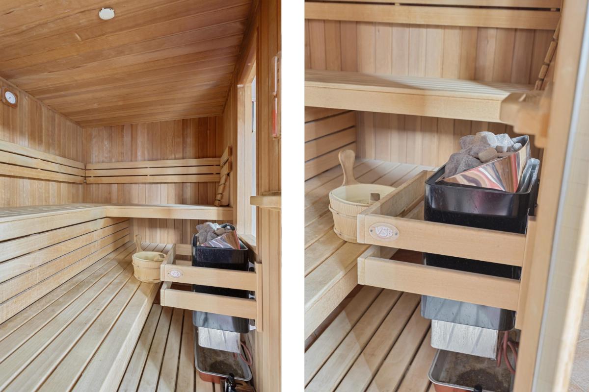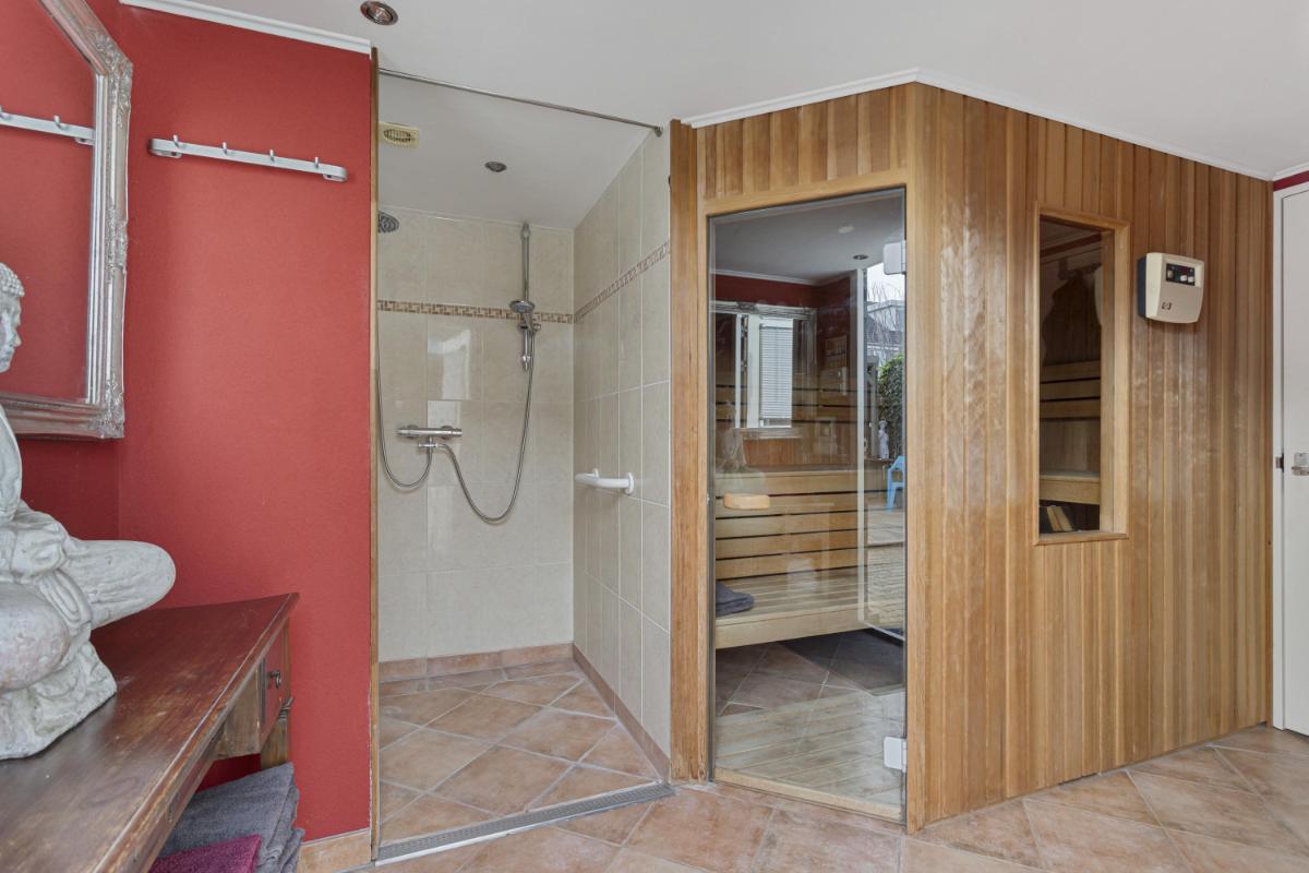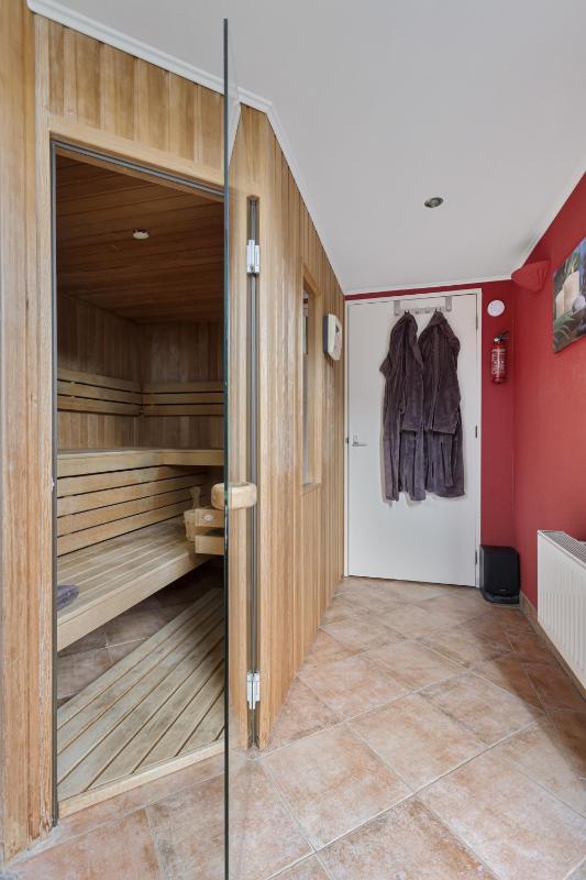 WELLNESSRUIMTE/SAUNA/BERGING Vanuit de tuin is toegang tot de voormalig garage welke momenteel is opgesplitst in een wellness/sauna en een berging. De wellnessruimte beschikt over een ingebouwde finse sauna, dubbele (inloop) douche, inbouwspots, vloerverwarming en licht/electra. Vanuit deze ruimte is toegang tot de naastgelegen berging. Deze berging biedt veel opbergruimte, heeft ook vloerverwarmign en geeft middels een deur toegang tot de oprit aan de voorzijde.