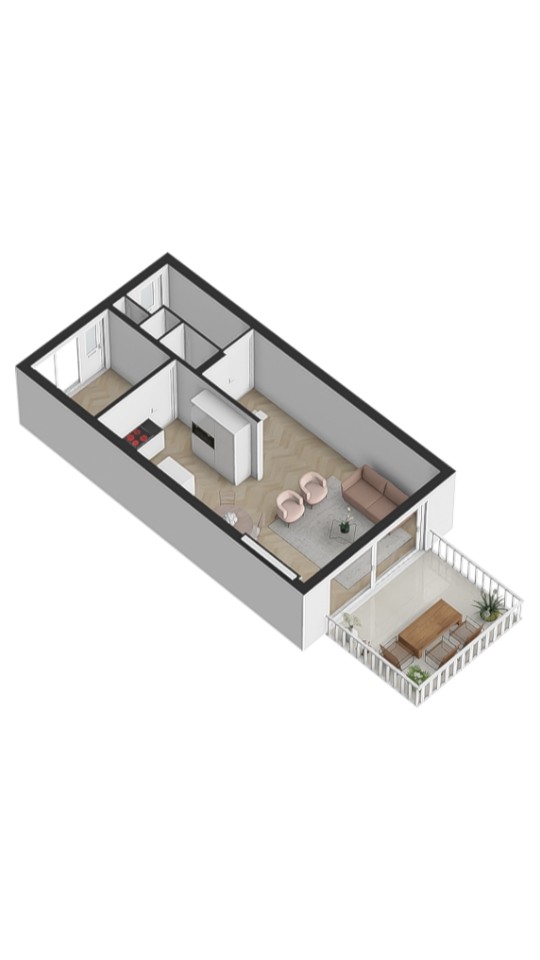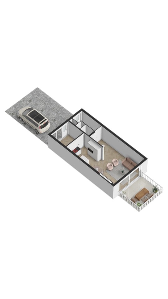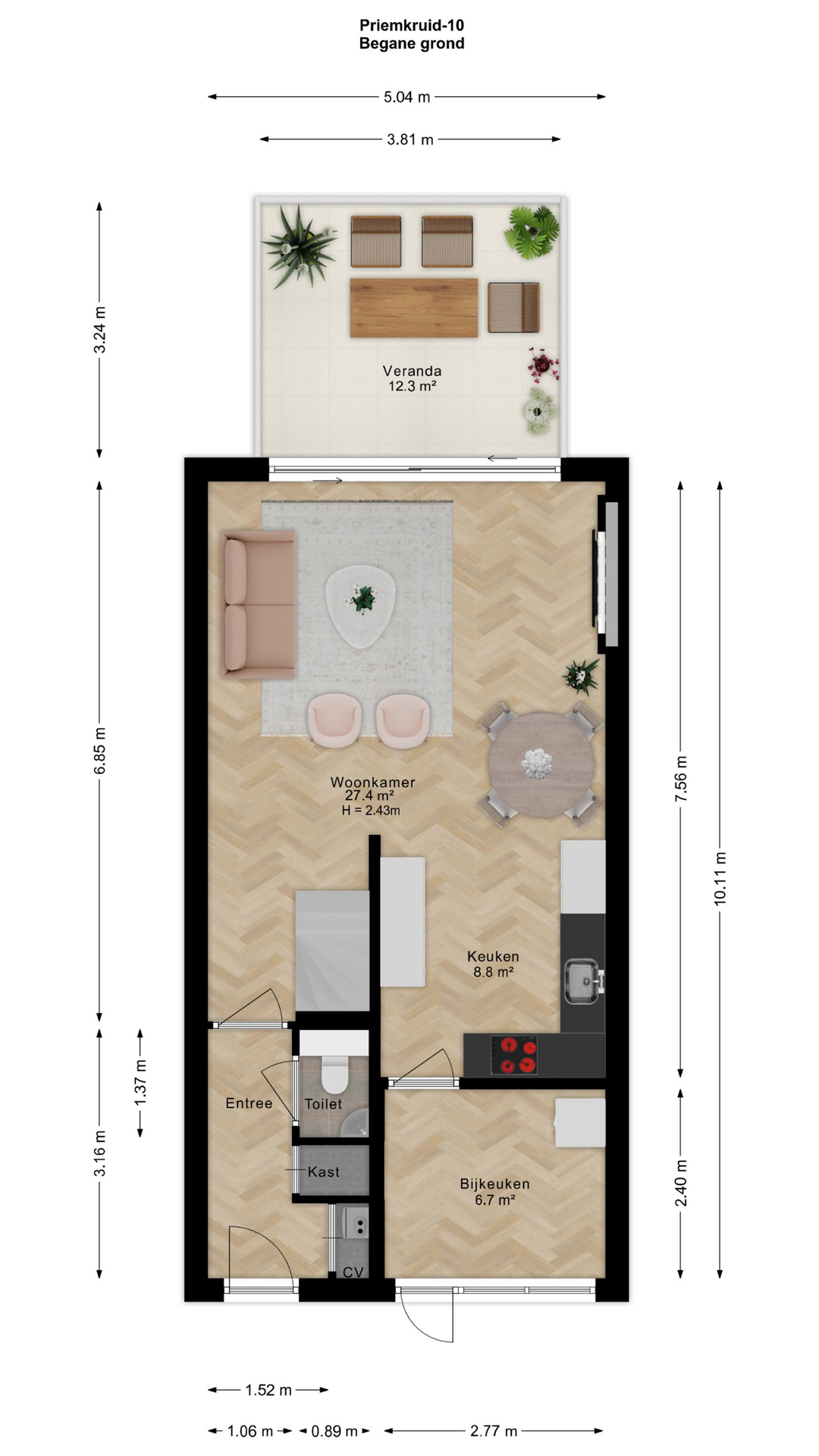 Indeling Begane grond Entree/hal met uitgebreide meterkast en garderobe; modern betegeld toilet met wandcloset en fonteintje; L-vormige woonkamer (ca. 27 m²) met trapopgang en schuifpui naar het terras (ca. 3.24 × 3.81 m) aan het water. Open keuken (ca. 2.77 × 3.00 m) met complete inbouwkeuken. Bijkeuken/werkruimte (ca. 2.77 × 2.40 m) met schuifpui naar buiten en aansluitingen voor wasapparatuur.
